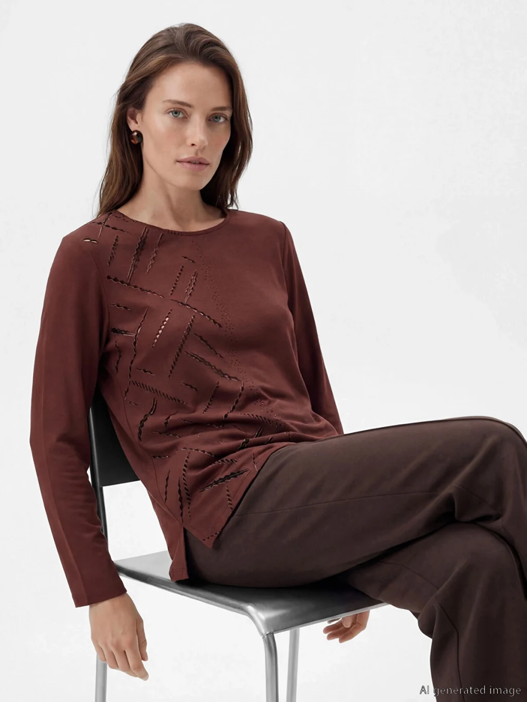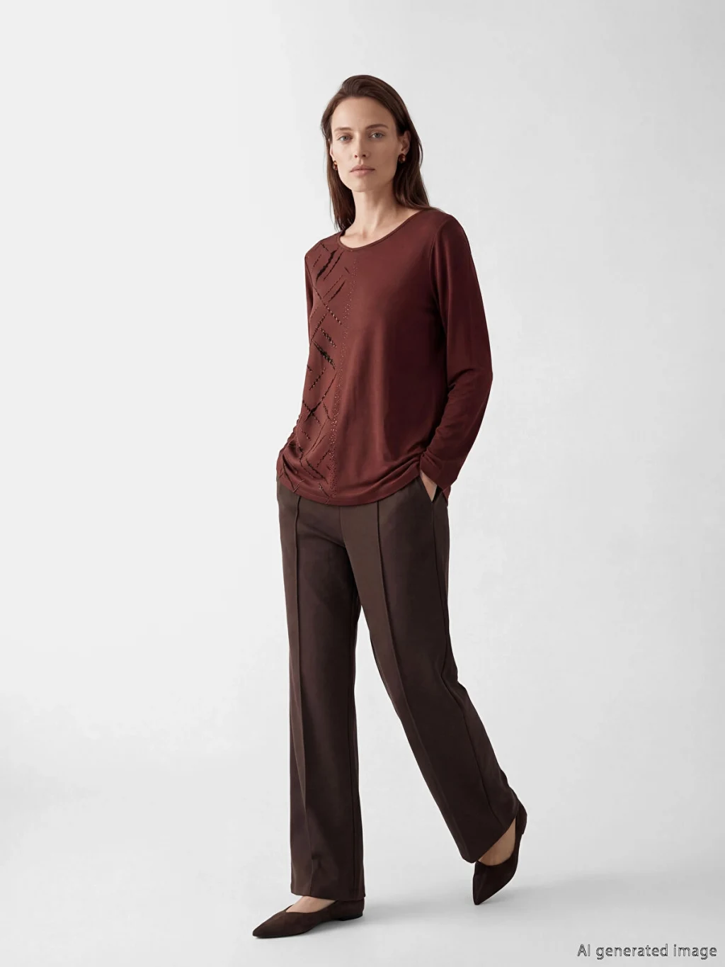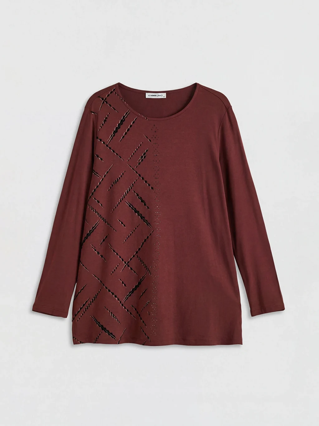 Bisiklet yaka ve uzun kollu kadın tişört, ön yüzünde taş detaylı desene sahiptir. Standart kalıptır.