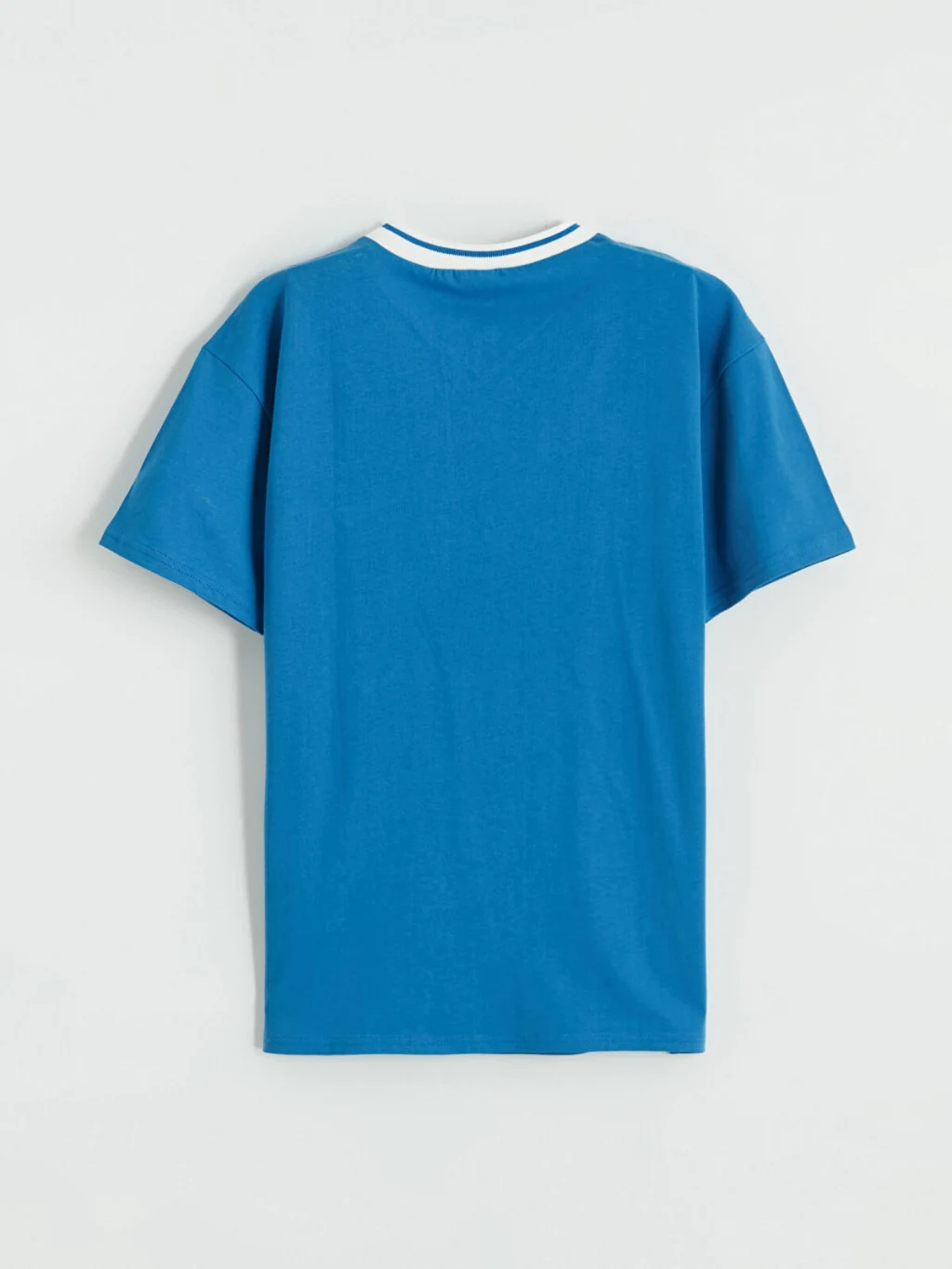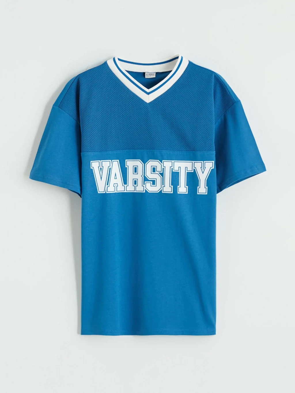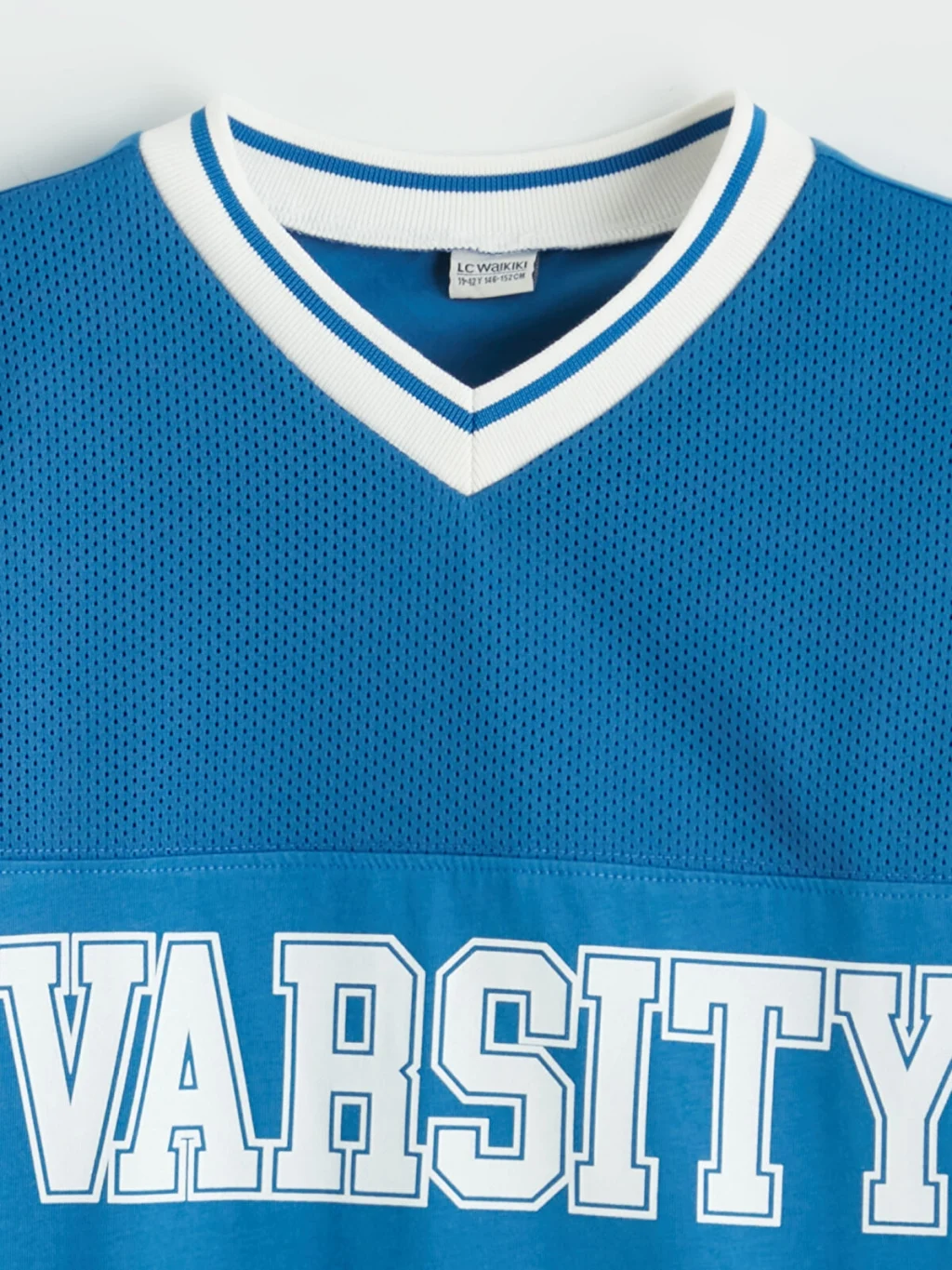 Erkek çocuk V yaka, kısa kollu tişört, %100 pamuk kumaştan üretilmiştir. File detaylı ve önü baskılıdır.
