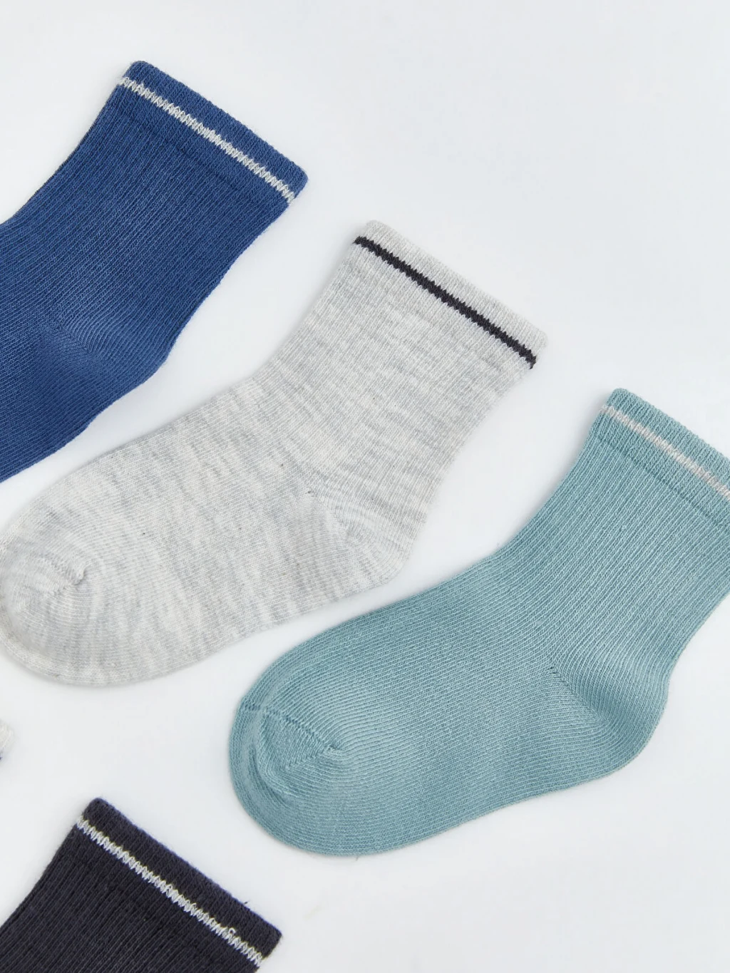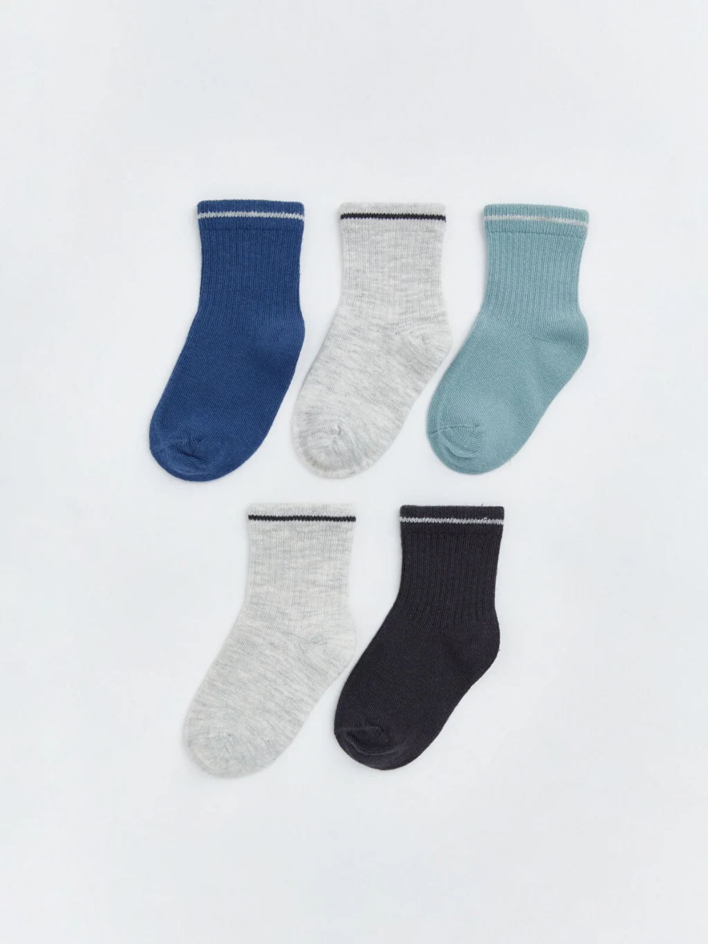 Erkek bebek için üretilmiş soket çoraplar, ribana örgülü ve bilek kısmı çizgi detaylıdır. Set 5 çiftten oluşmaktadır.