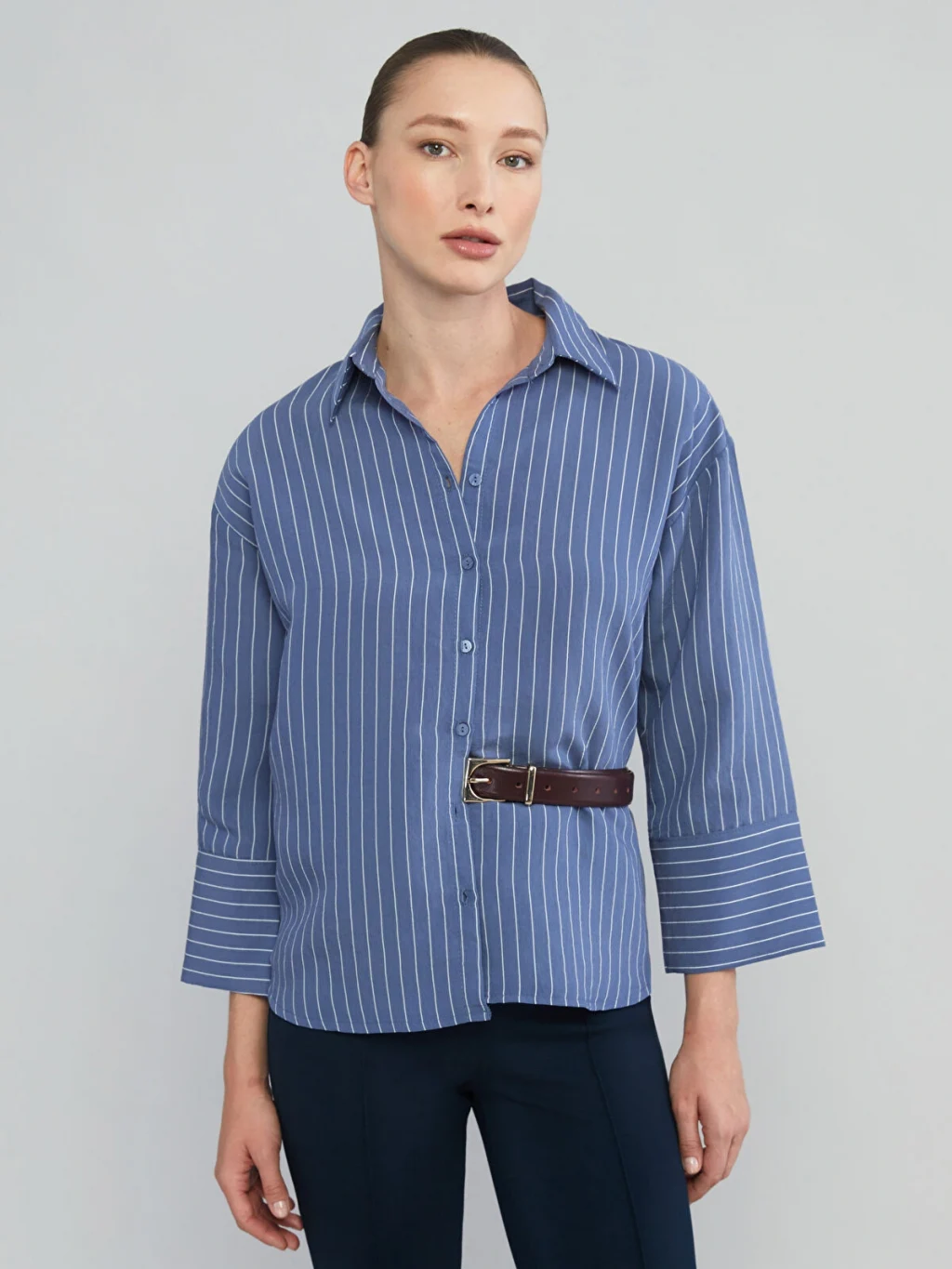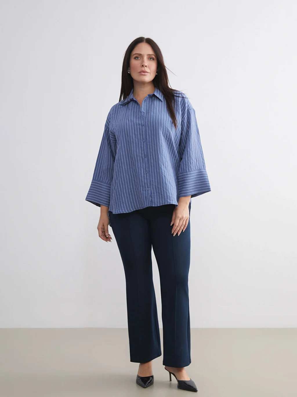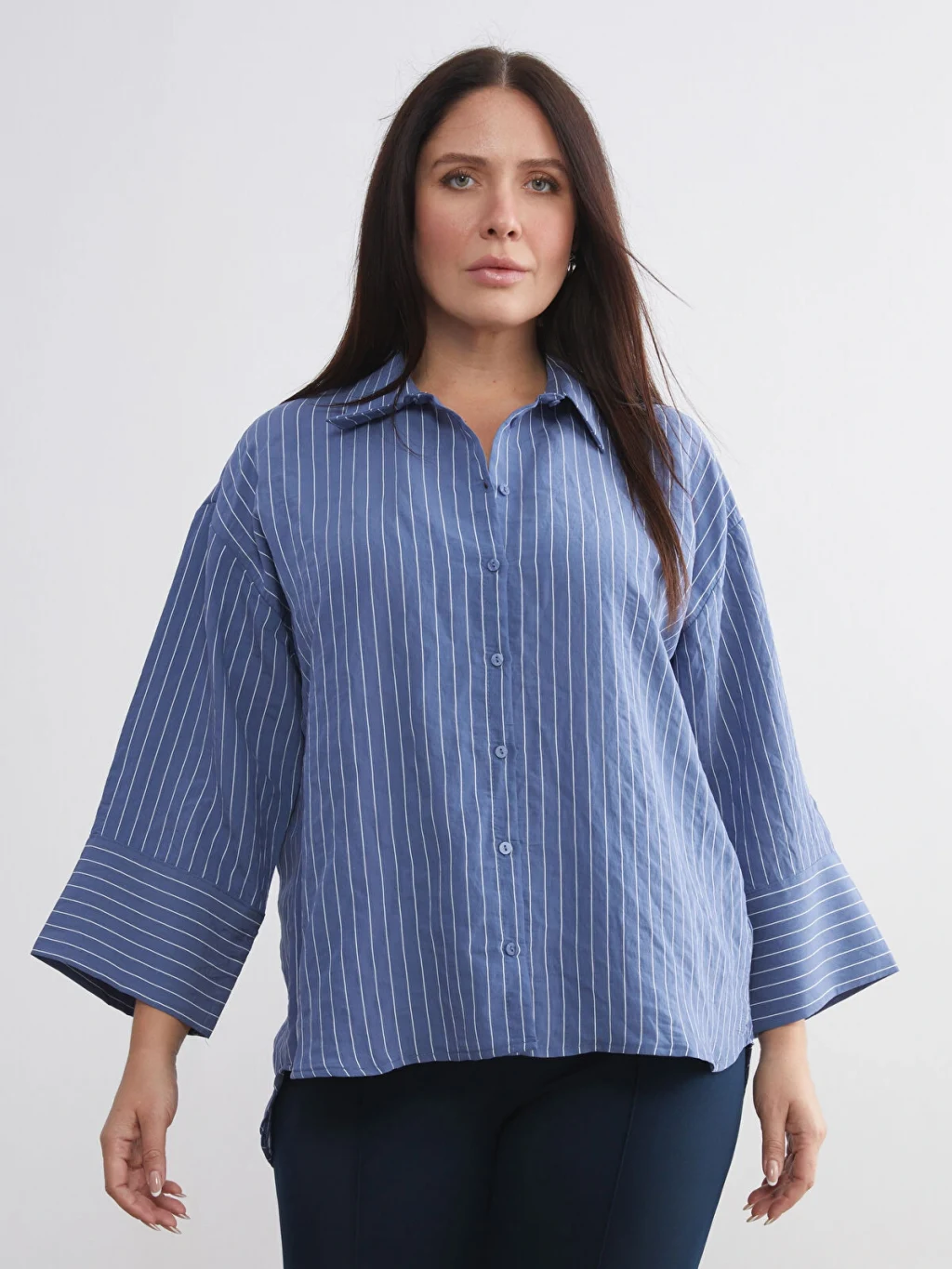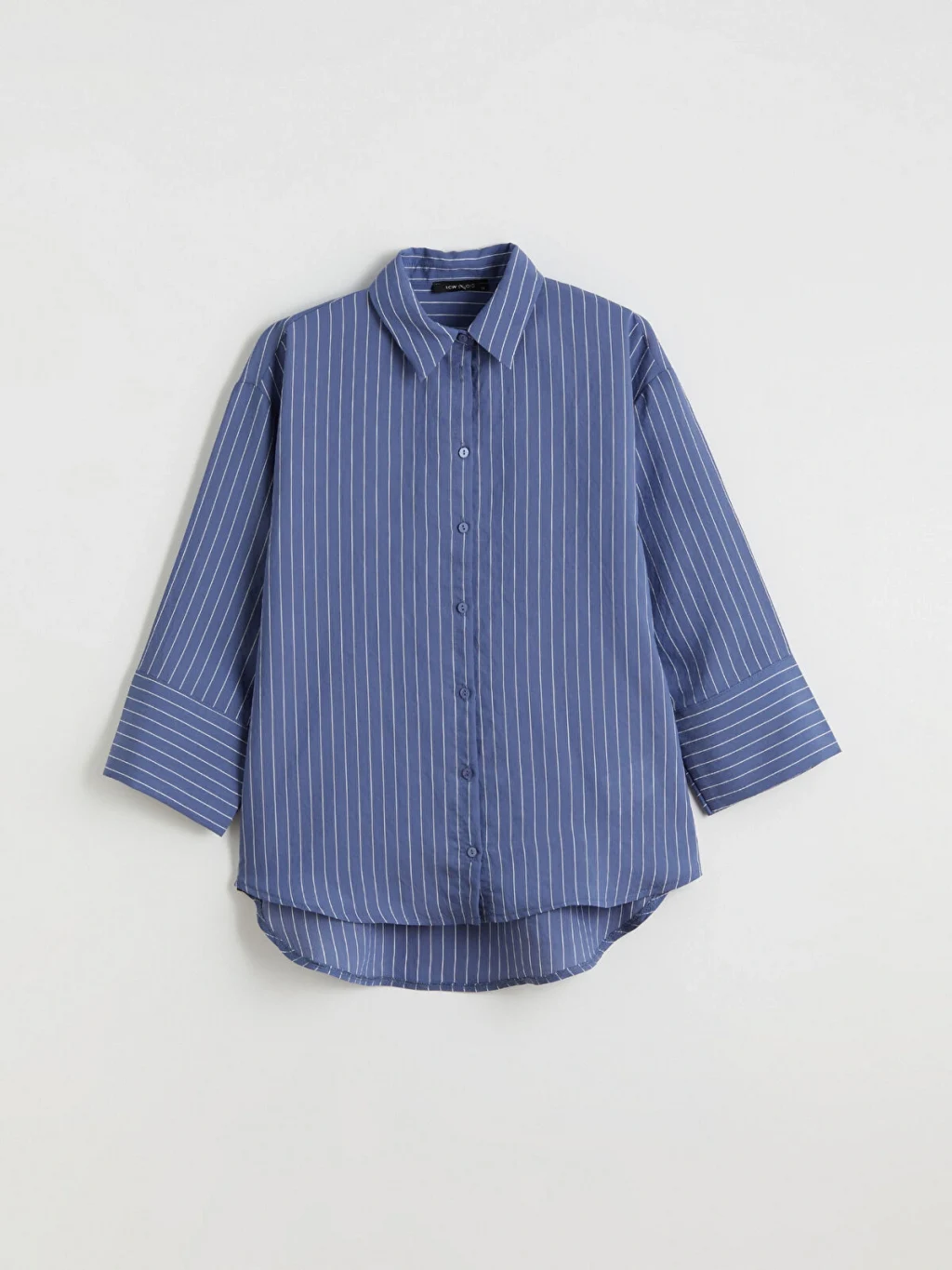 Gömlek yakalı ve çizgili desenli kadın gömlek, uzun kollu ve önden düğme kapamalıdır. Geniş manşetleri ve kavisli etek ucu bulunur.