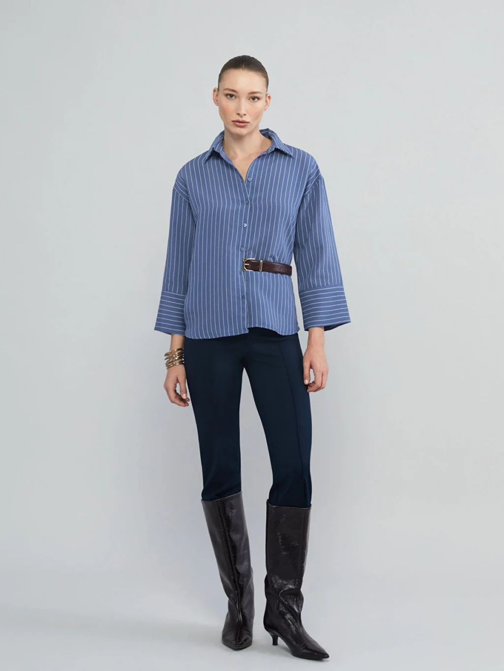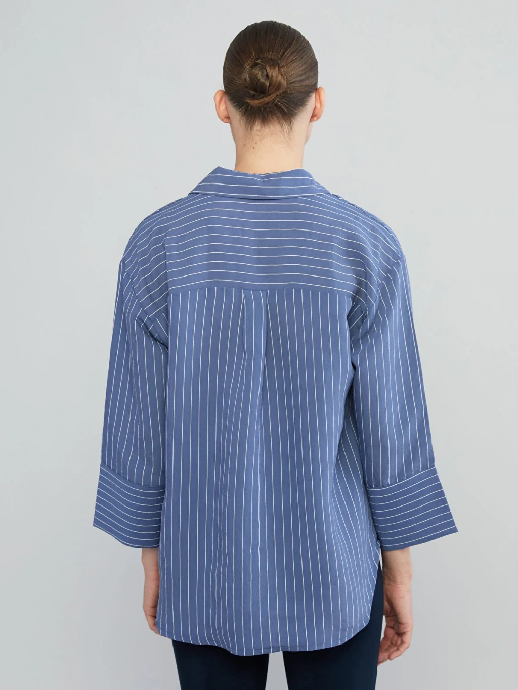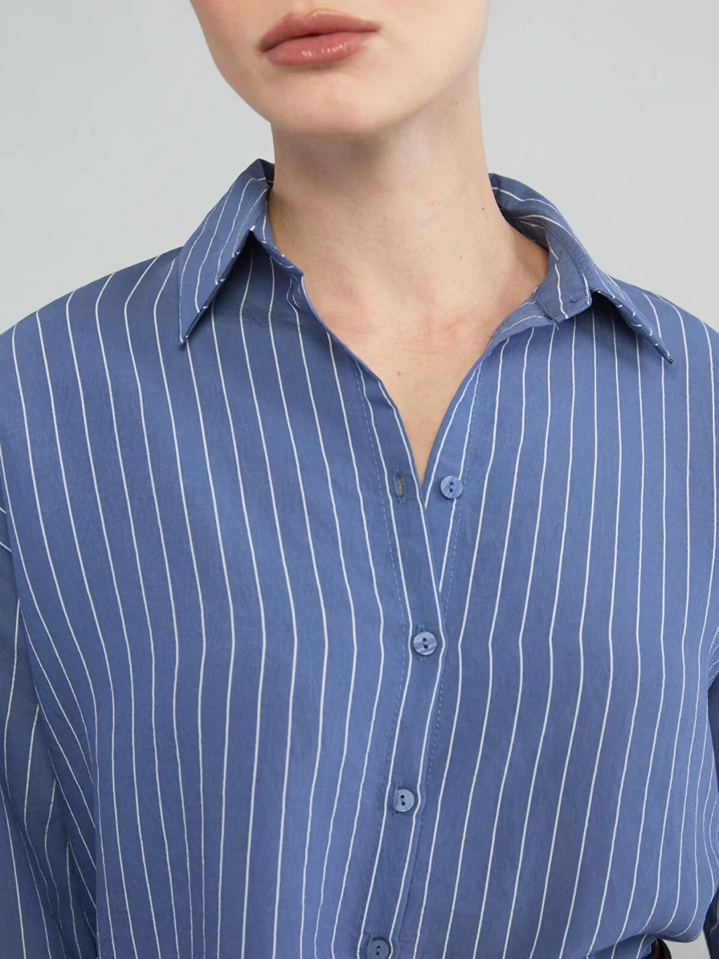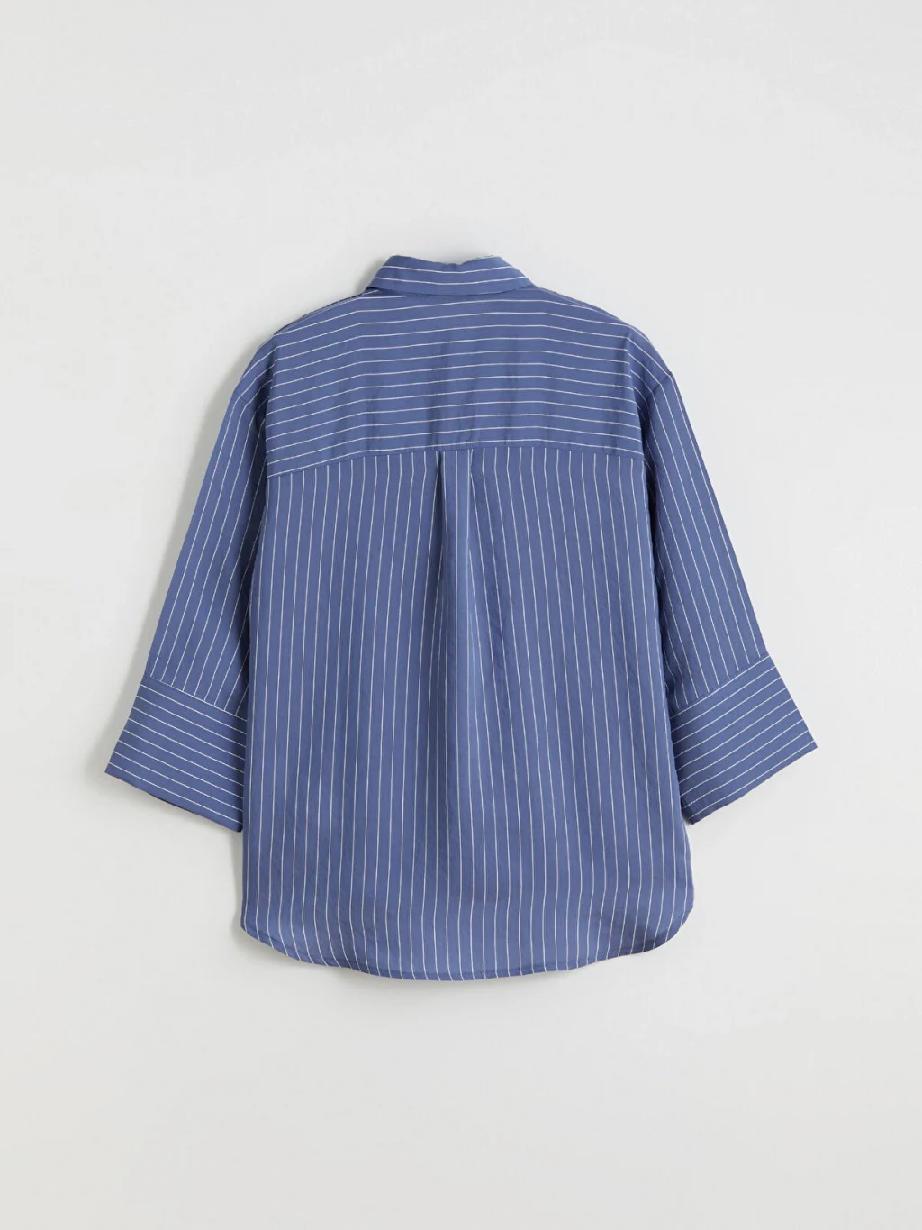 Gömlek yakalı ve çizgili desenli kadın gömlek, uzun kollu ve önden düğme kapamalıdır. Geniş manşetleri ve kavisli etek ucu bulunur.
