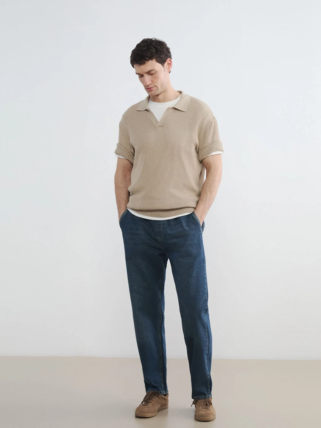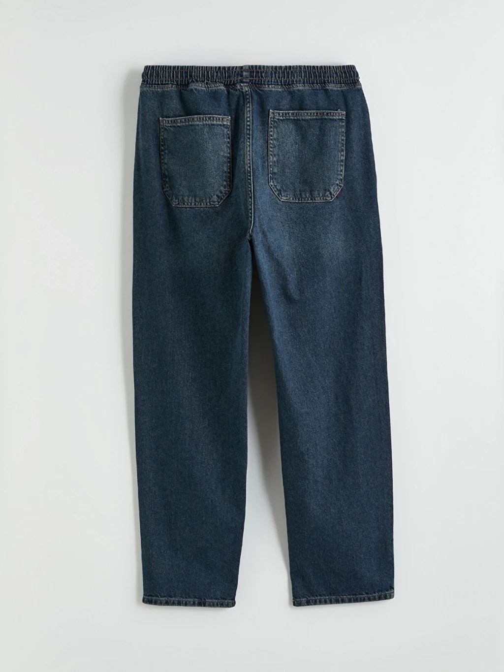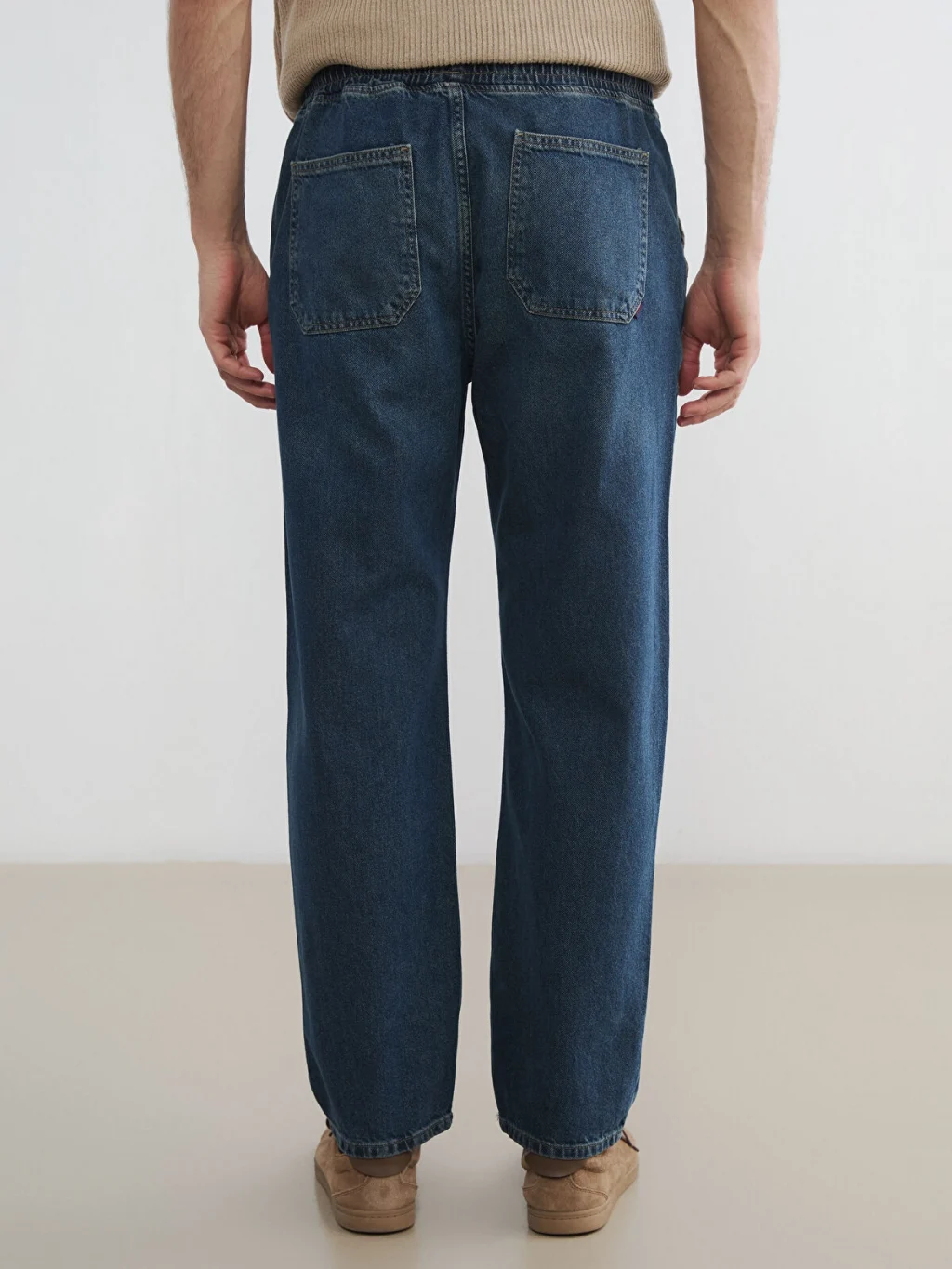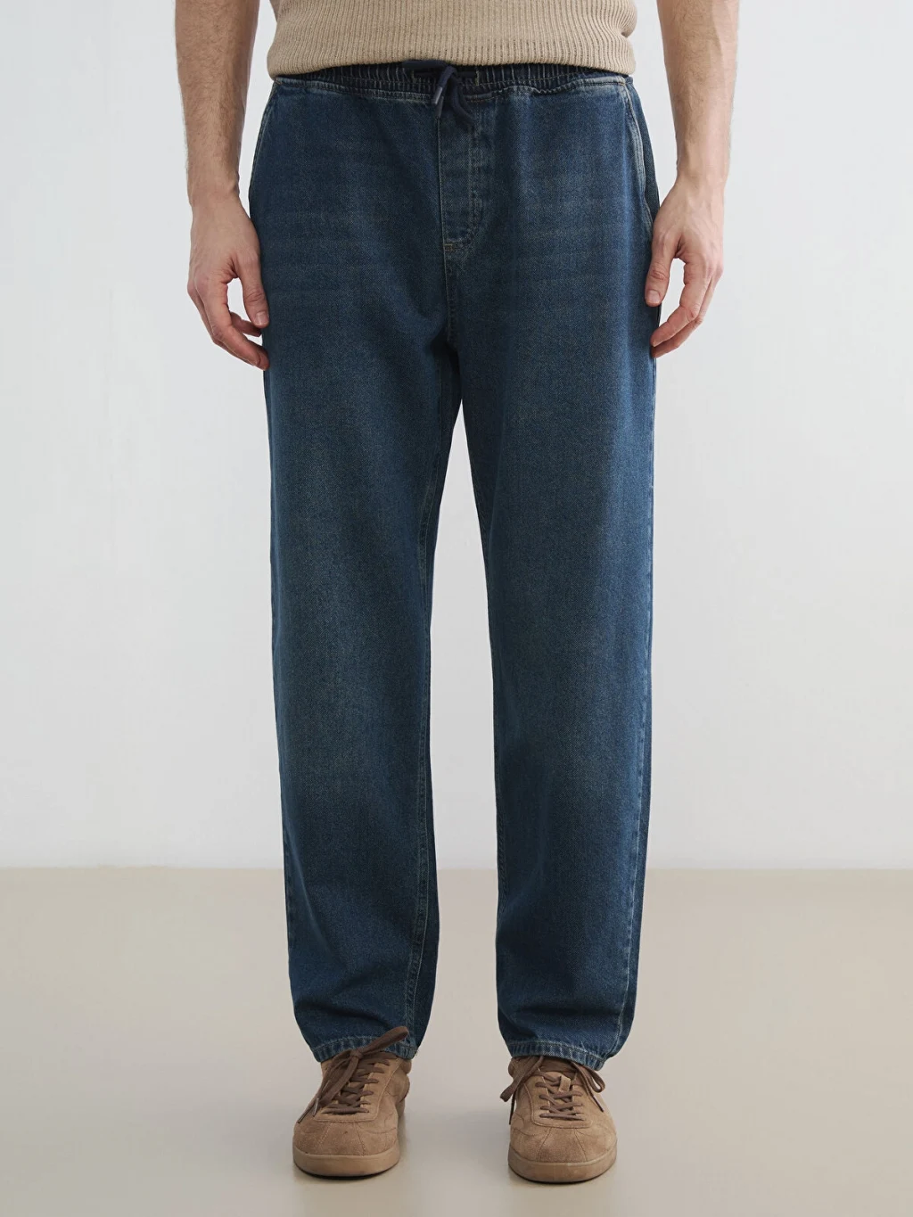 Erkek jean pantolon, %100 pamuklu denim kumaştan üretilmiştir, beli lastikli ve ayarlanabilir bağcıklıdır.