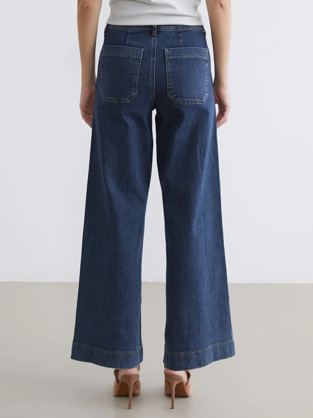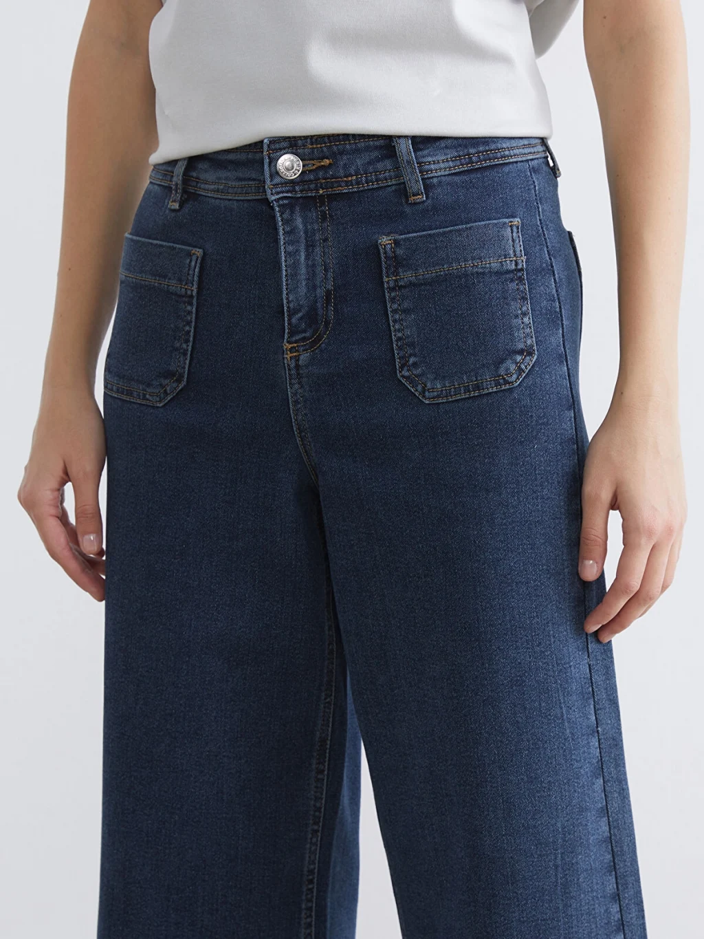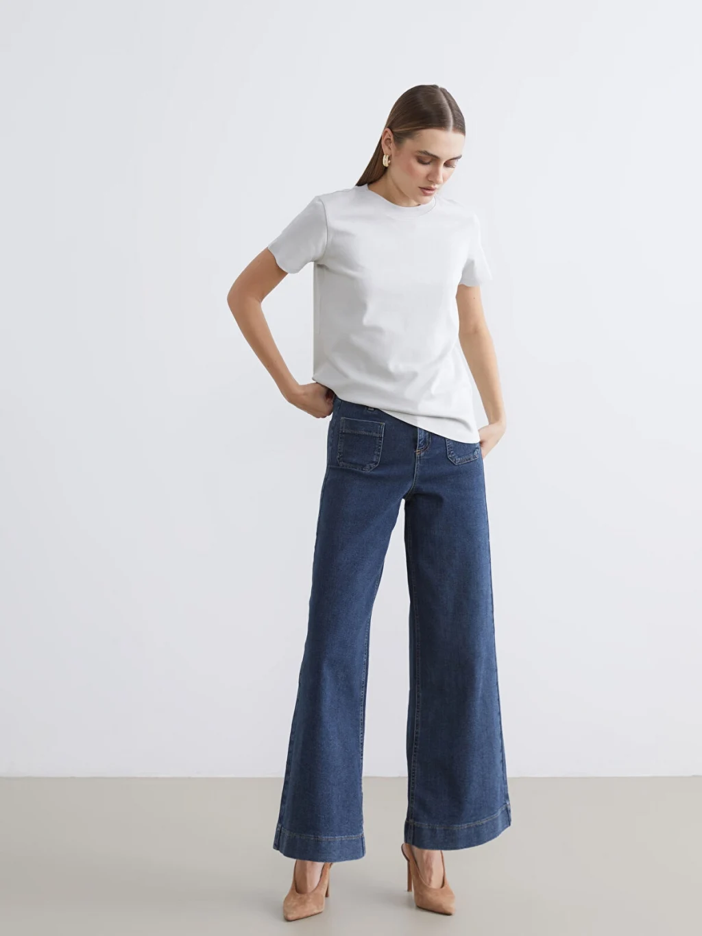 Geniş paçalı kadın jean pantolon, yüksek pamuk içeren denim kumaştan üretilmiştir. Cepli tasarıma sahip olup fermuar ve düğme kapamalıdır.