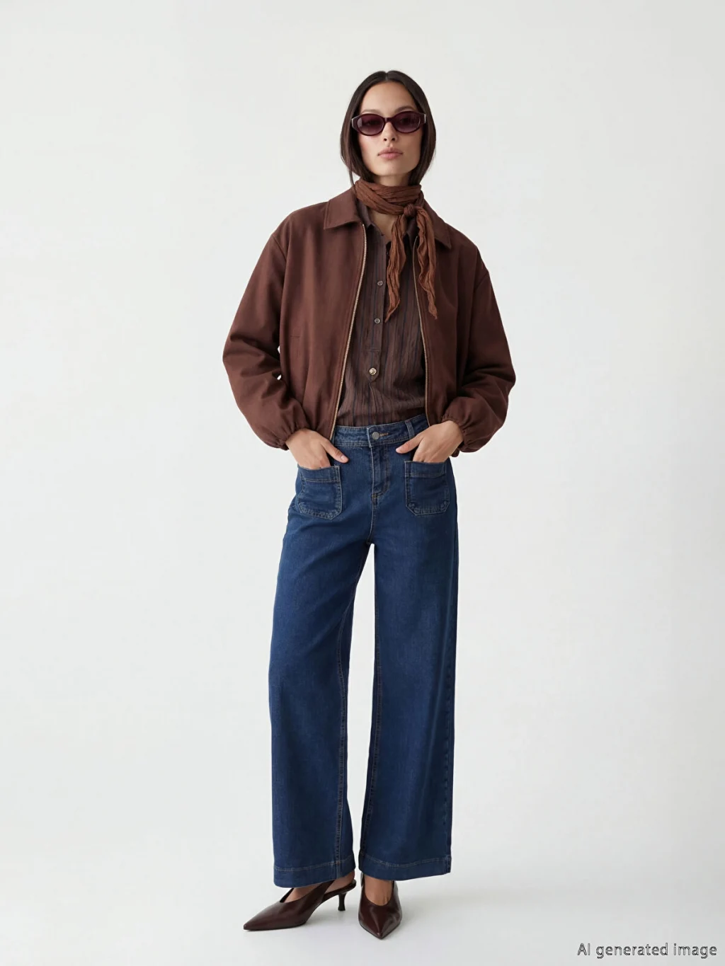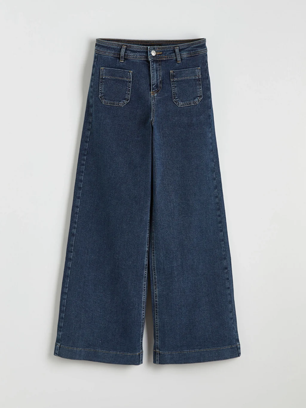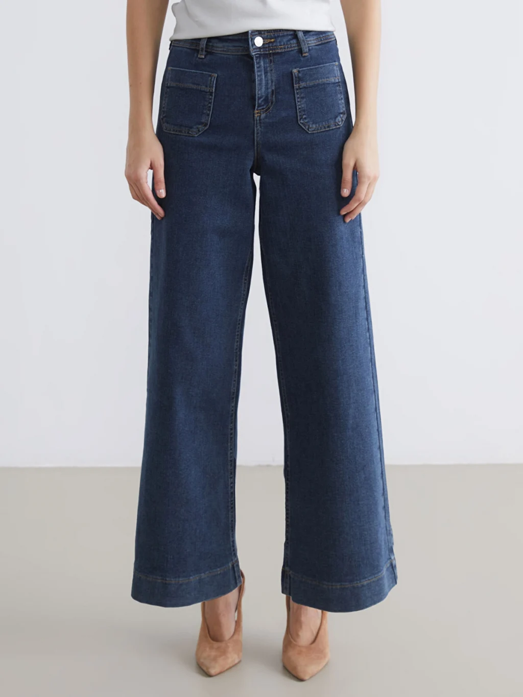 Geniş paçalı kadın jean pantolon, yüksek pamuk içeren denim kumaştan üretilmiştir. Cepli tasarıma sahip olup fermuar ve düğme kapamalıdır.