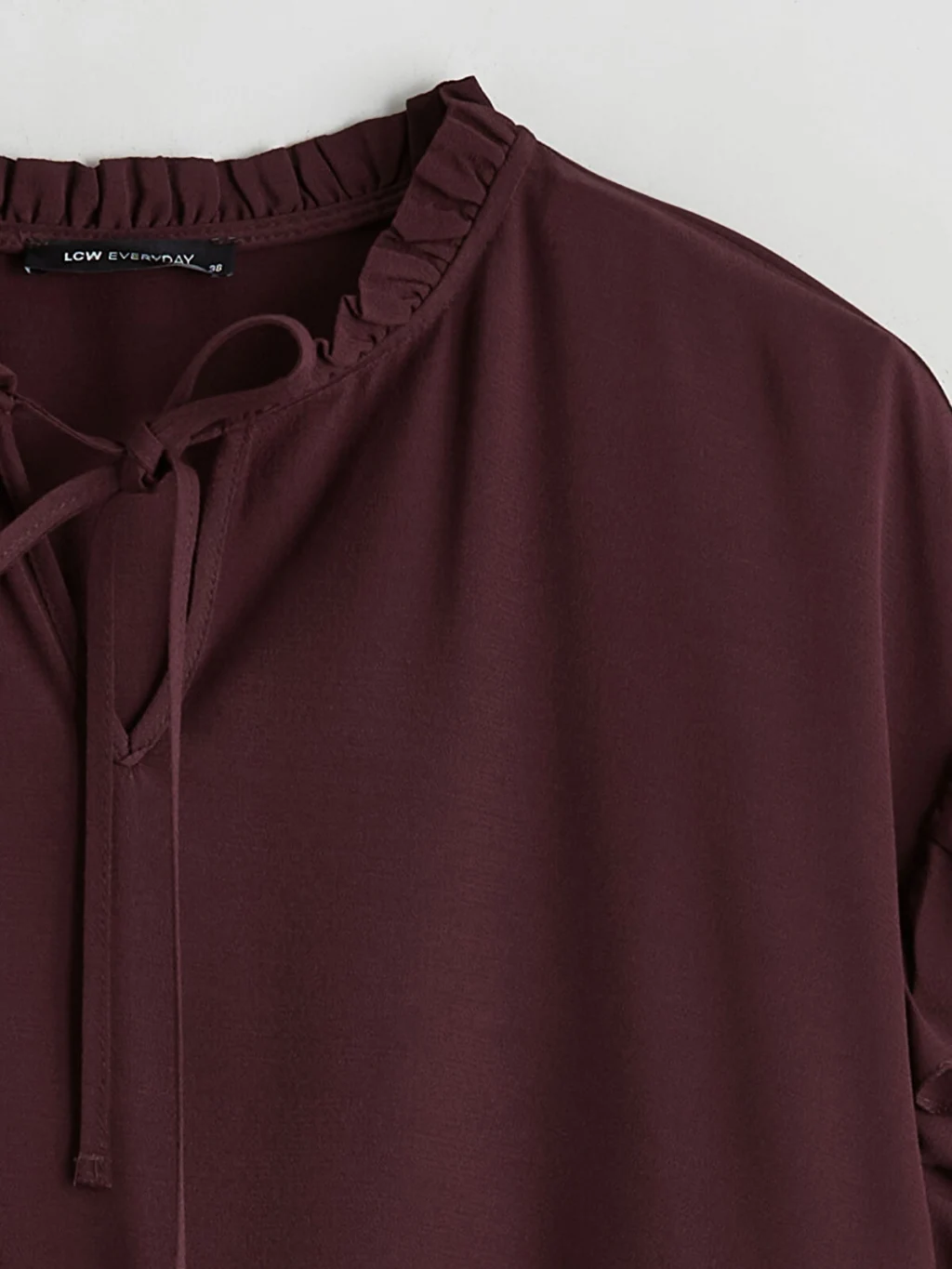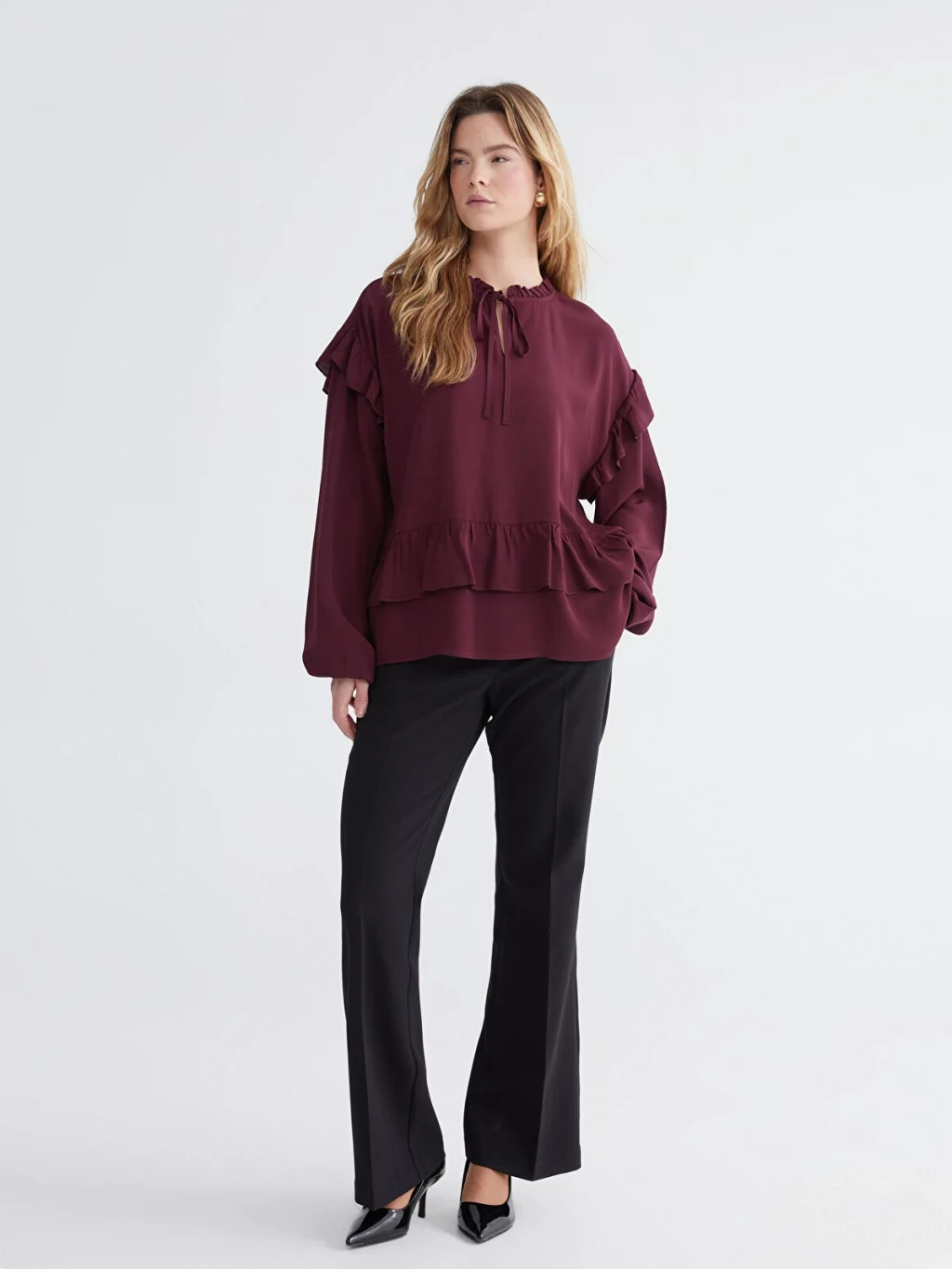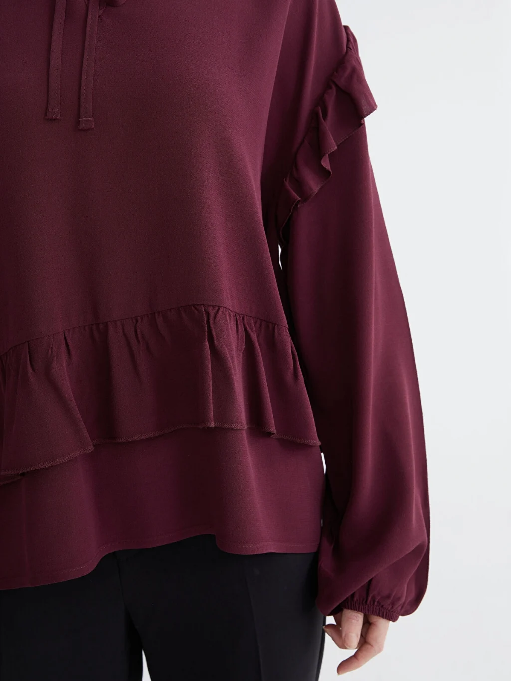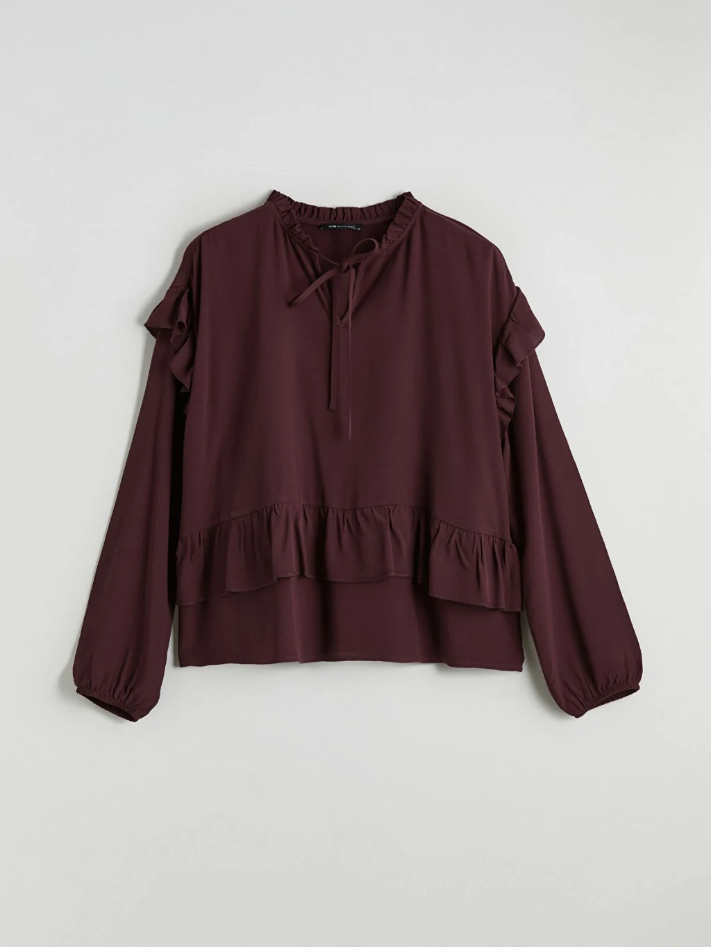 Yakası bağlama detaylı ve fırfırlı, uzun kollu kadın bluz. Omuzları ve etek ucu fırfırlıdır, kol ağızları lastiklidir.