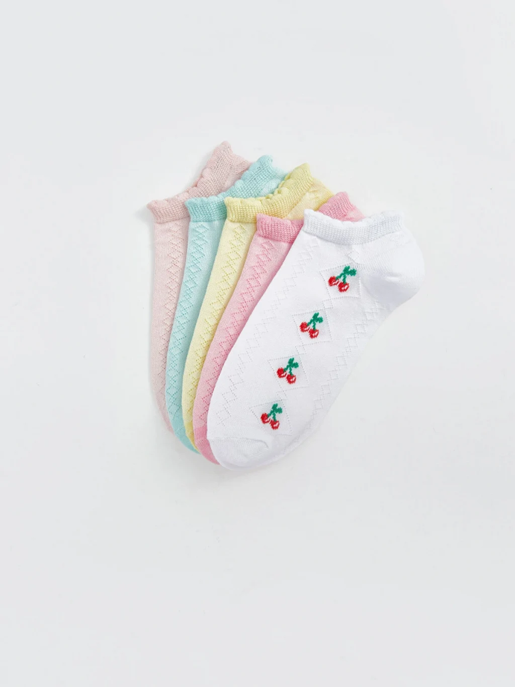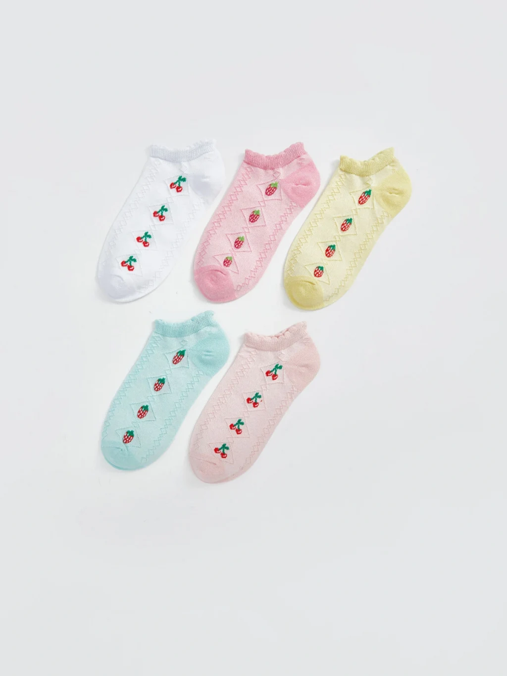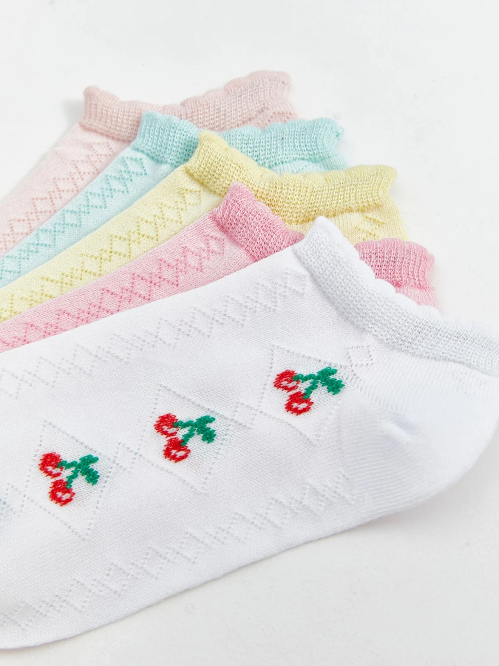 Beş çiftten oluşan kız çocuk patik çorap seti, baklava desenli dokuya ve meyve nakışlarına sahiptir.