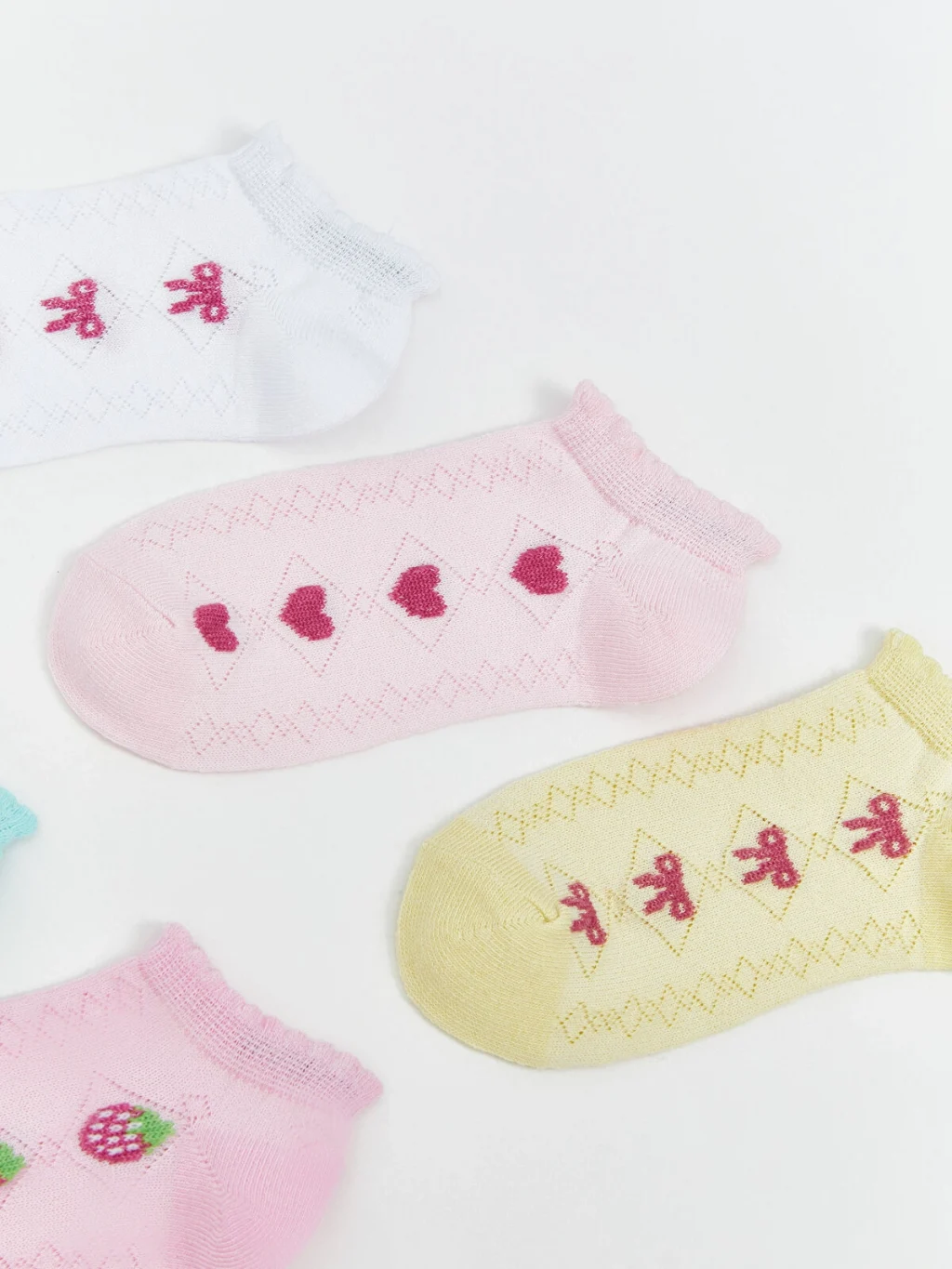 Fiyonk, kalp, kiraz ve çilek gibi çeşitli desenlere sahip, ribana manşetli kız çocuk patik çorap.