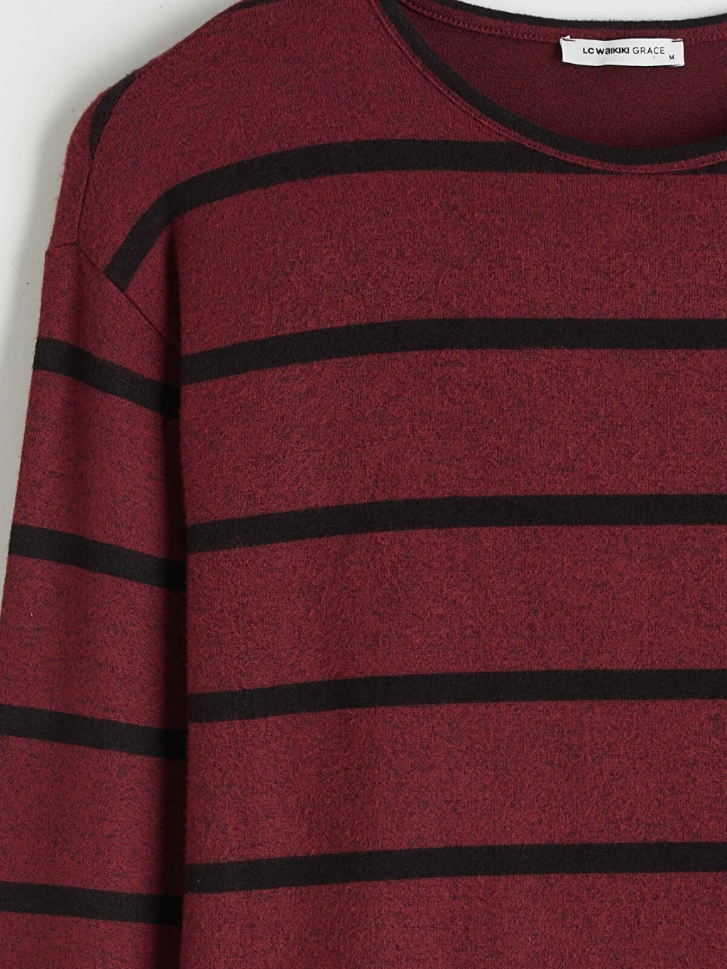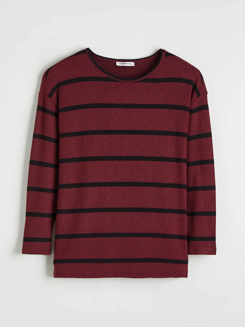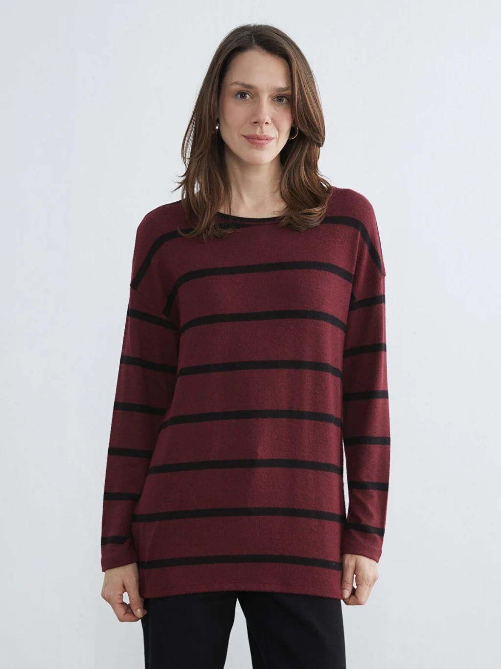 Bol kalıplı, bisiklet yaka ve uzun kollu kadın tişört, çizgili desene sahiptir.