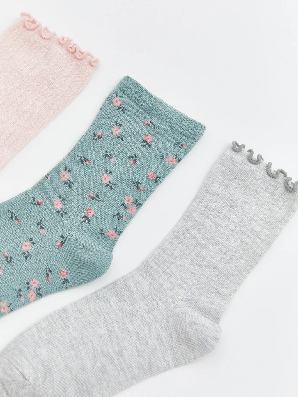 Kenarları fırfırlı kadın soket çorap seti, çiçek desenli ve fitilli dokulu olmak üzere farklı tasarımlar içerir.