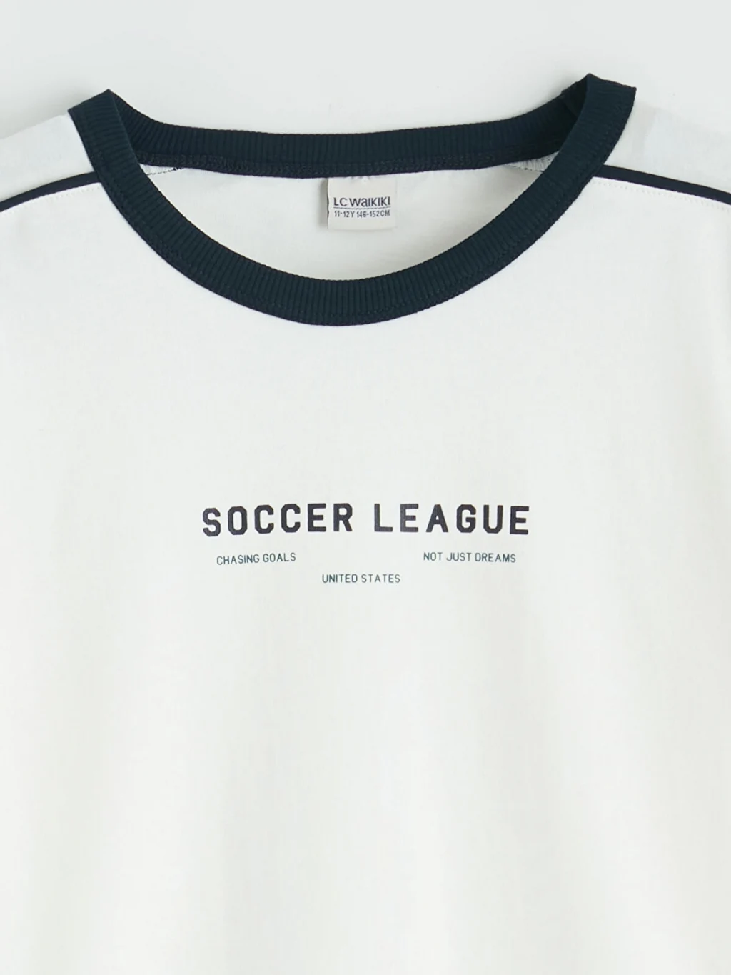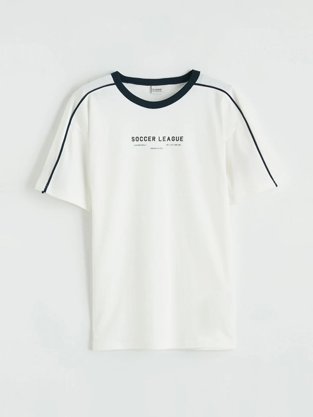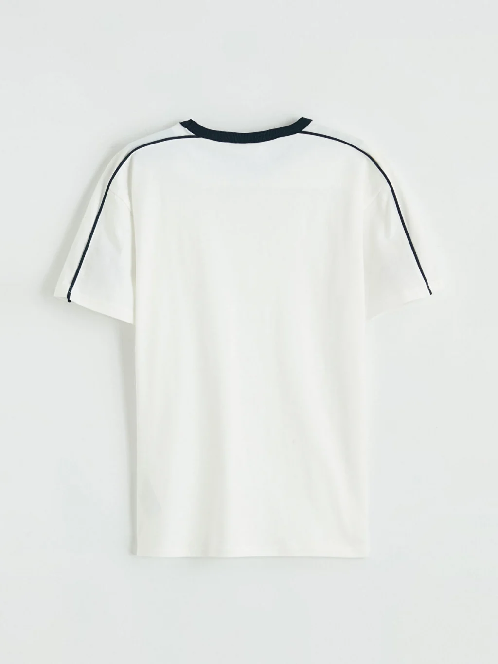 Bisiklet yaka ve kısa kollu erkek çocuk tişört, %100 pamuklu kumaştan üretilmiştir. Önü baskılıdır ve omuzdan kol ucuna uzanan şerit detayı bulunur.