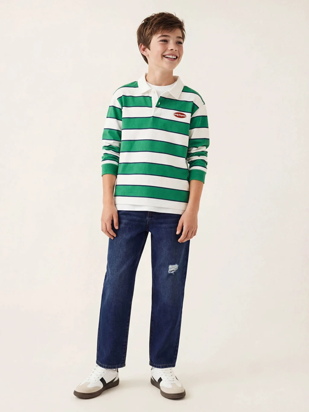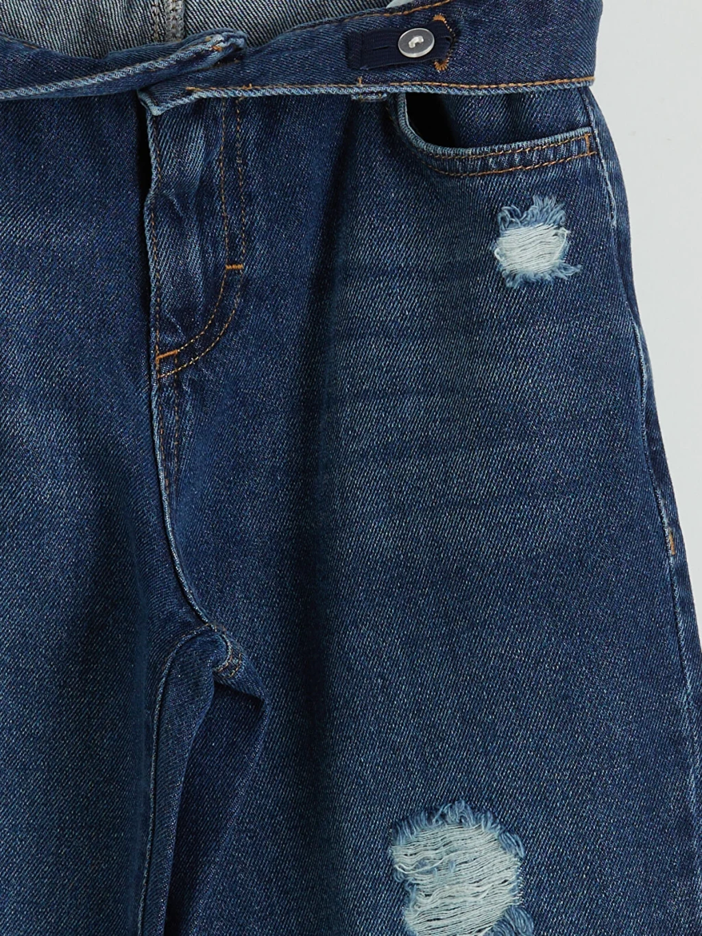 Bol kesimli, yırtık detaylı erkek çocuk jean pantolon, %100 Pamuk içerikli denim kumaştan üretilmiştir. Beş ceplidir, fermuar ve düğme ile kapanır.