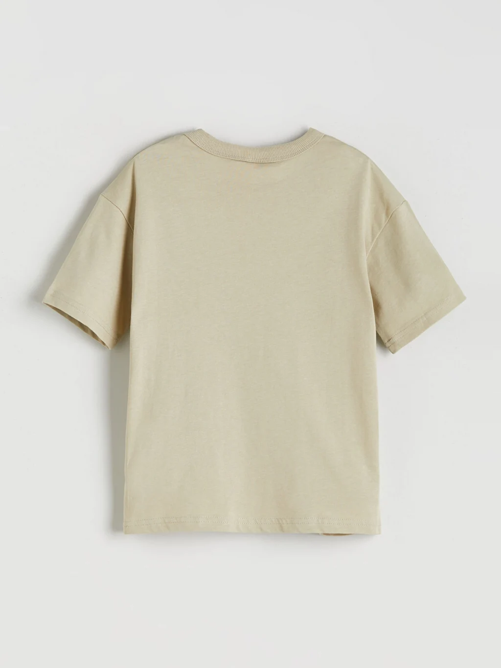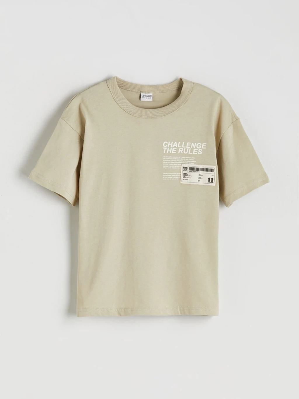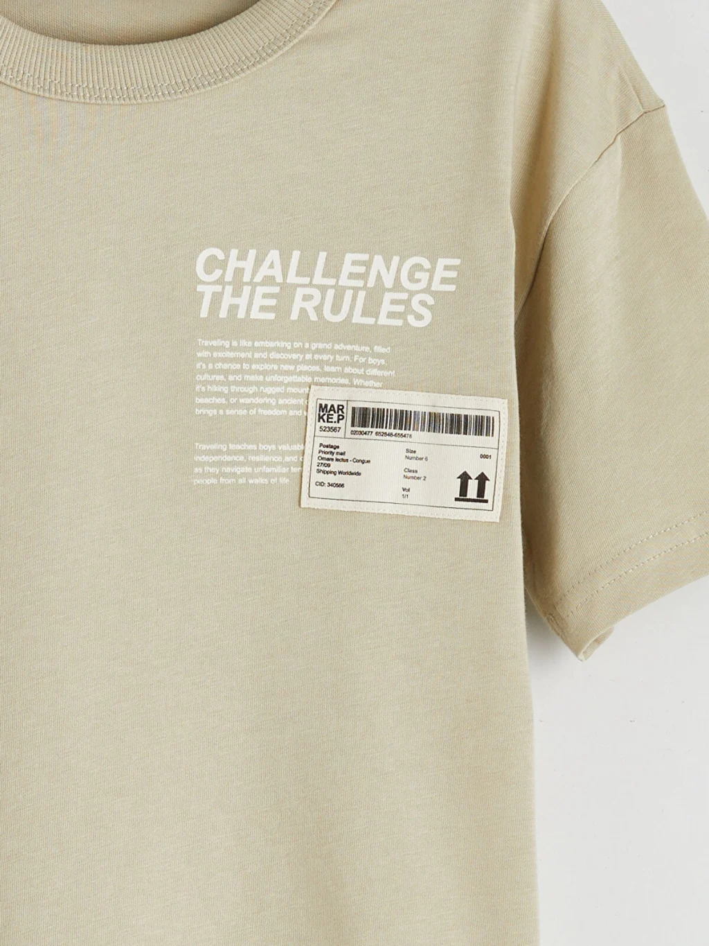 Bisiklet yaka ve kısa kollu erkek çocuk tişört, %100 pamuklu penye kumaştan üretilmiştir. Bol kalıplı ürünün ön yüzünde yazı baskısı yer alır.