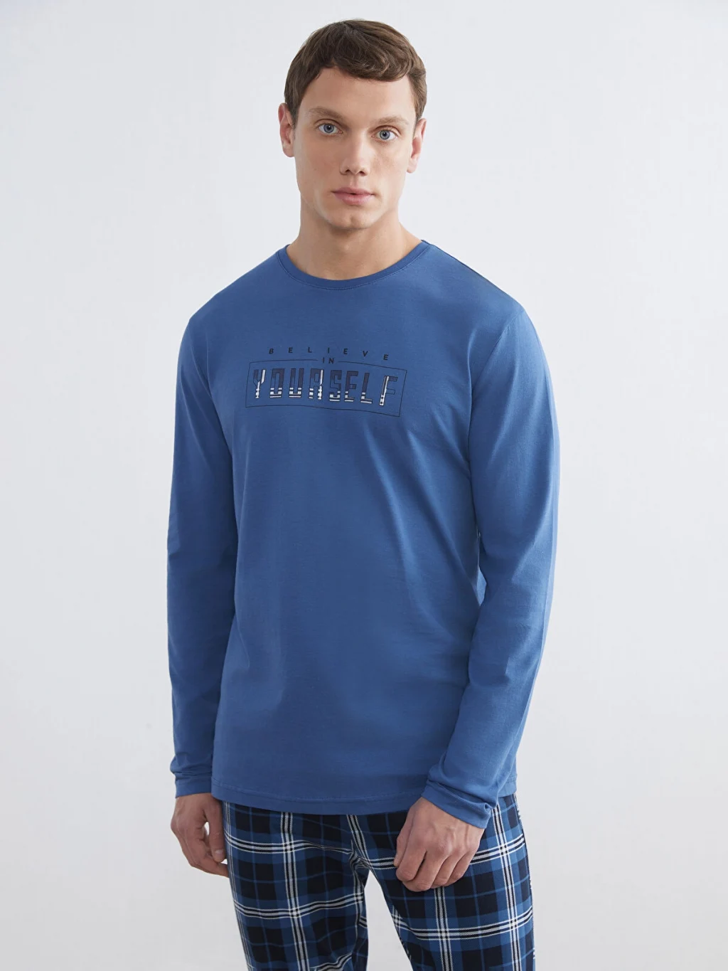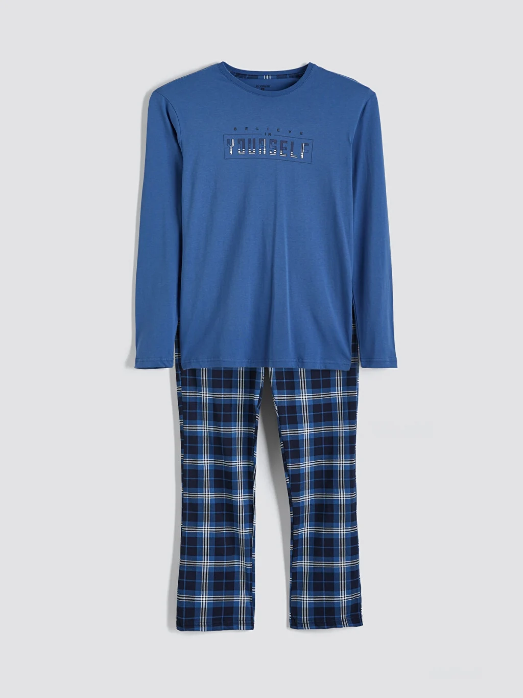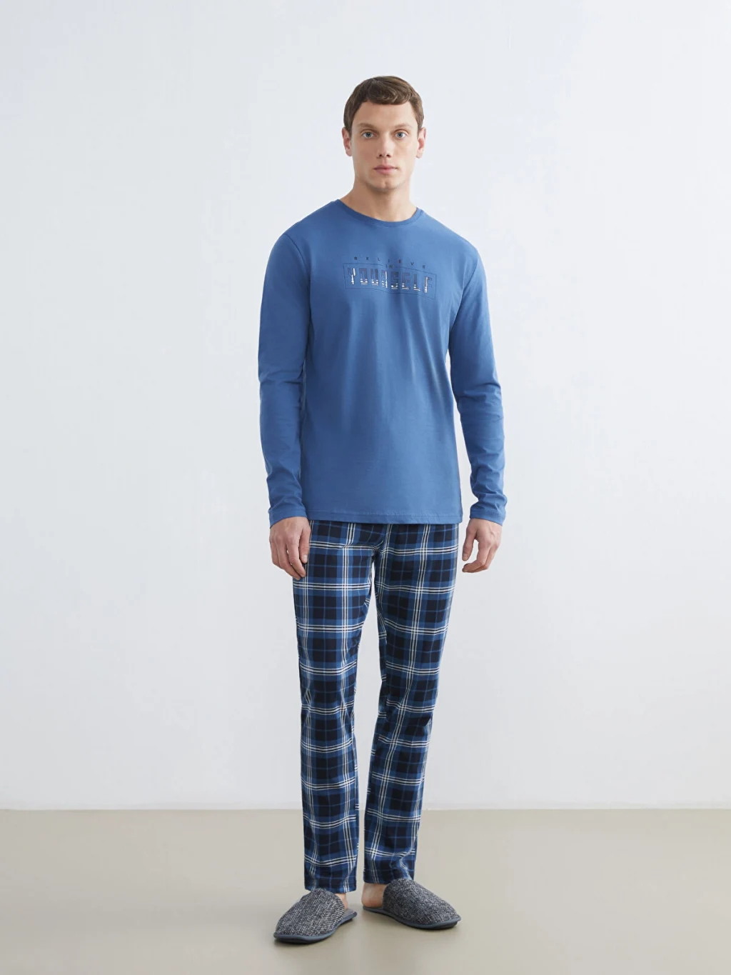 Erkek pijama takımı, bisiklet yaka ve uzun kollu yazı baskılı üst ile kareli desenli alttan oluşur. Penye kumaştan üretilmiştir.
