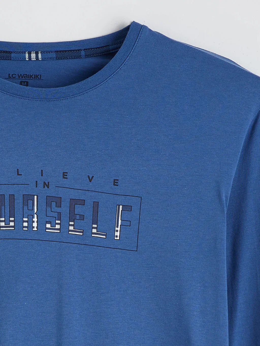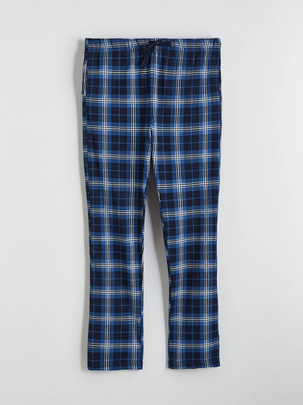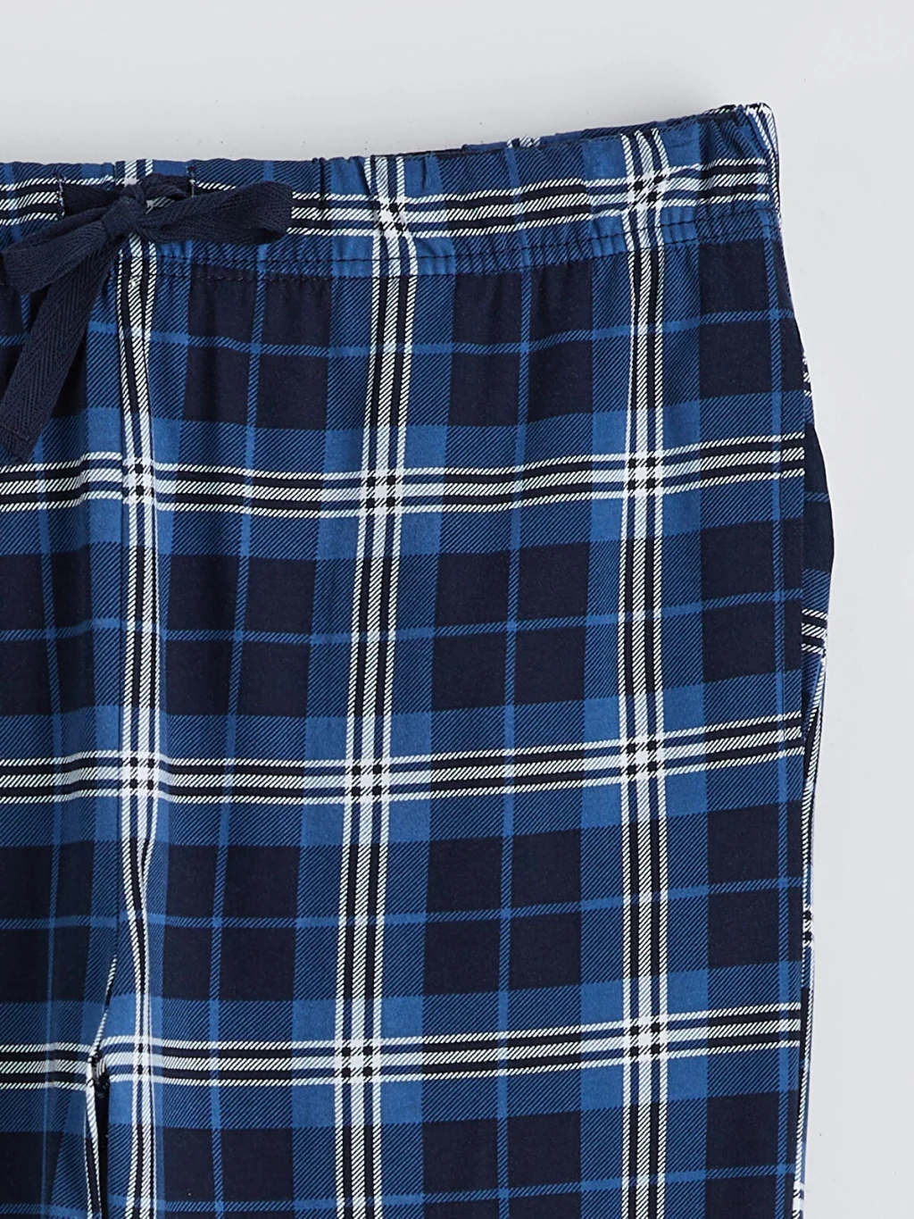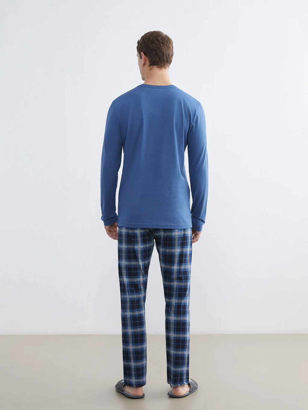 Erkek pijama takımı, bisiklet yaka ve uzun kollu yazı baskılı üst ile kareli desenli alttan oluşur. Penye kumaştan üretilmiştir.