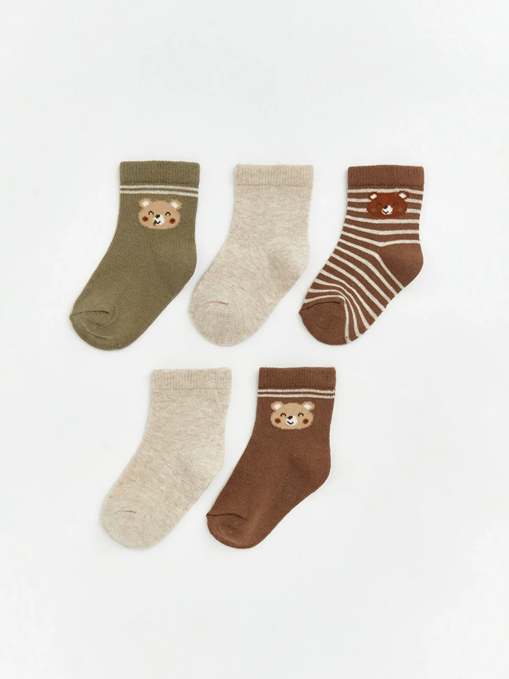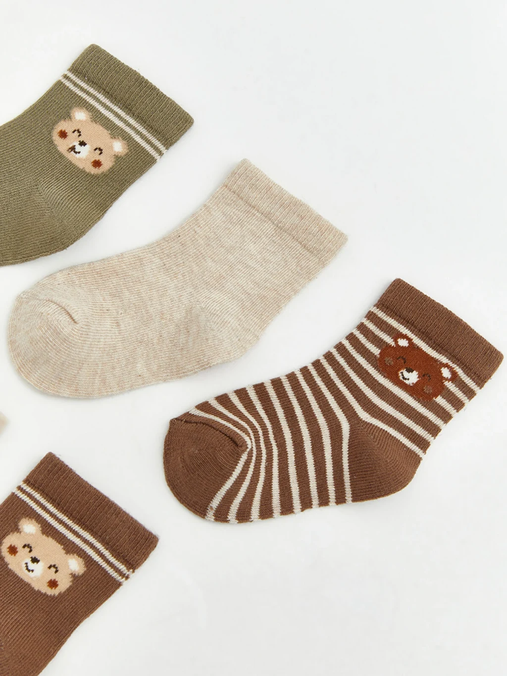 Erkek bebek için beşli soket çorap seti, düz, çizgili ve hayvan figürlü desenli farklı modellerden oluşur. Bilekleri ribanalıdır.