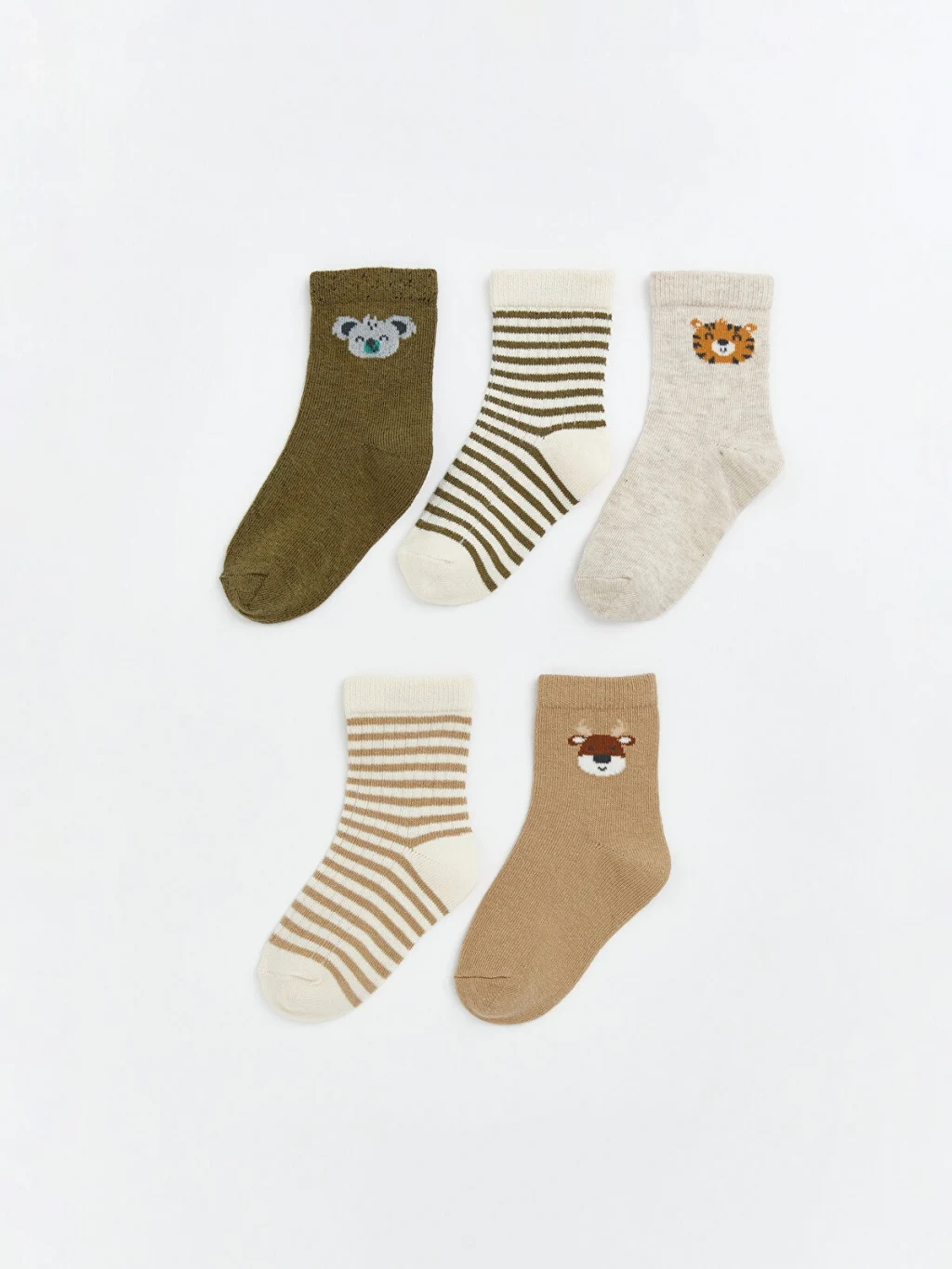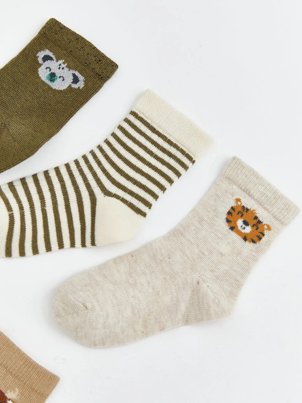 Çizgili ve hayvan figürlü desenlere sahip modellerden oluşan, 5 çift erkek bebek soket çorap seti.