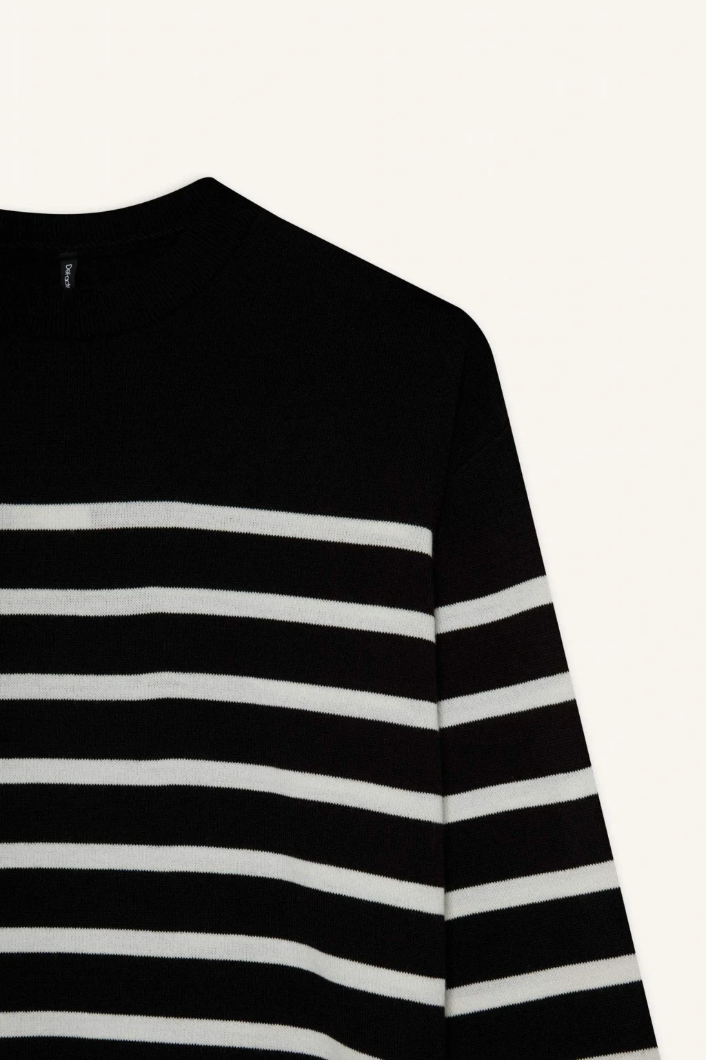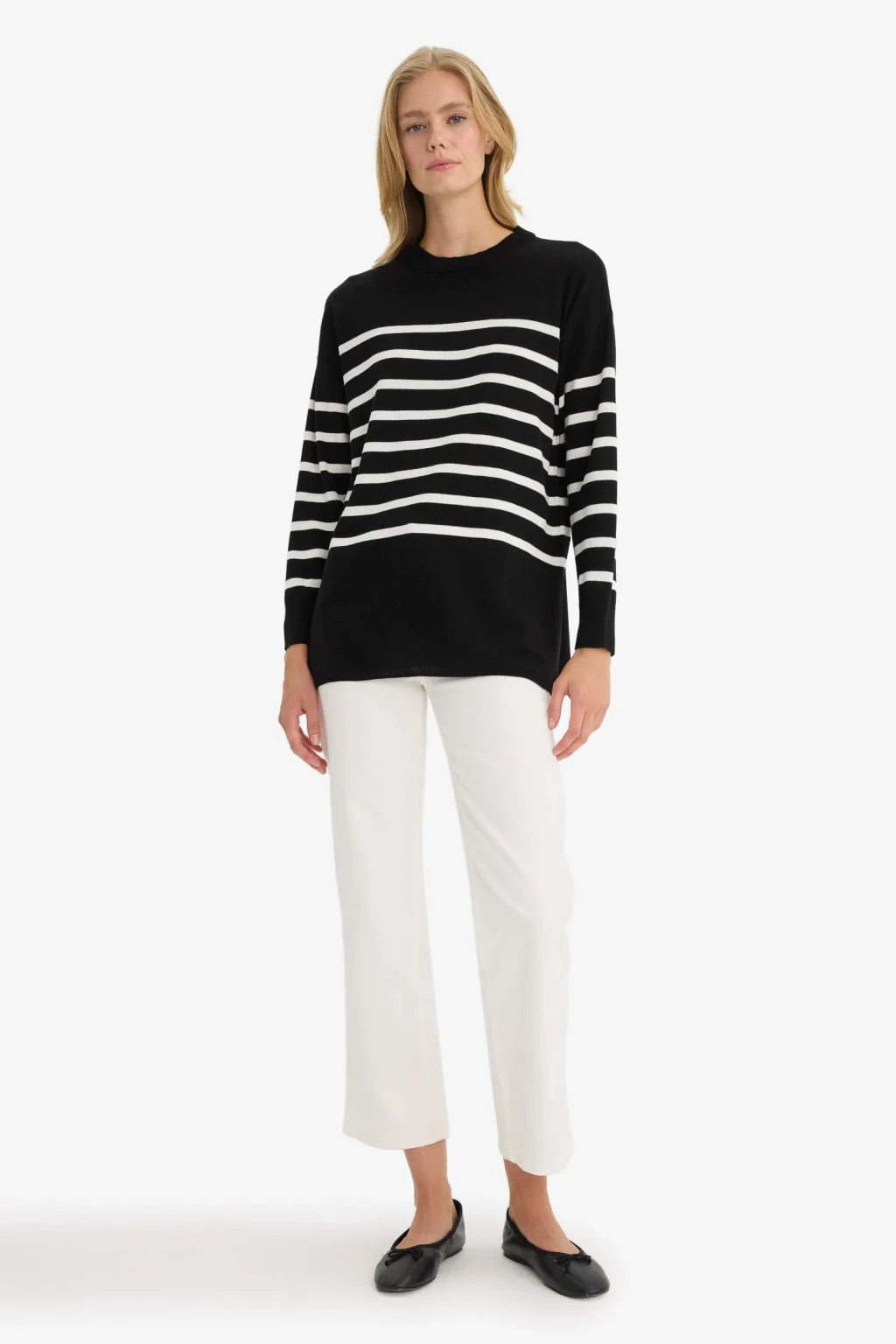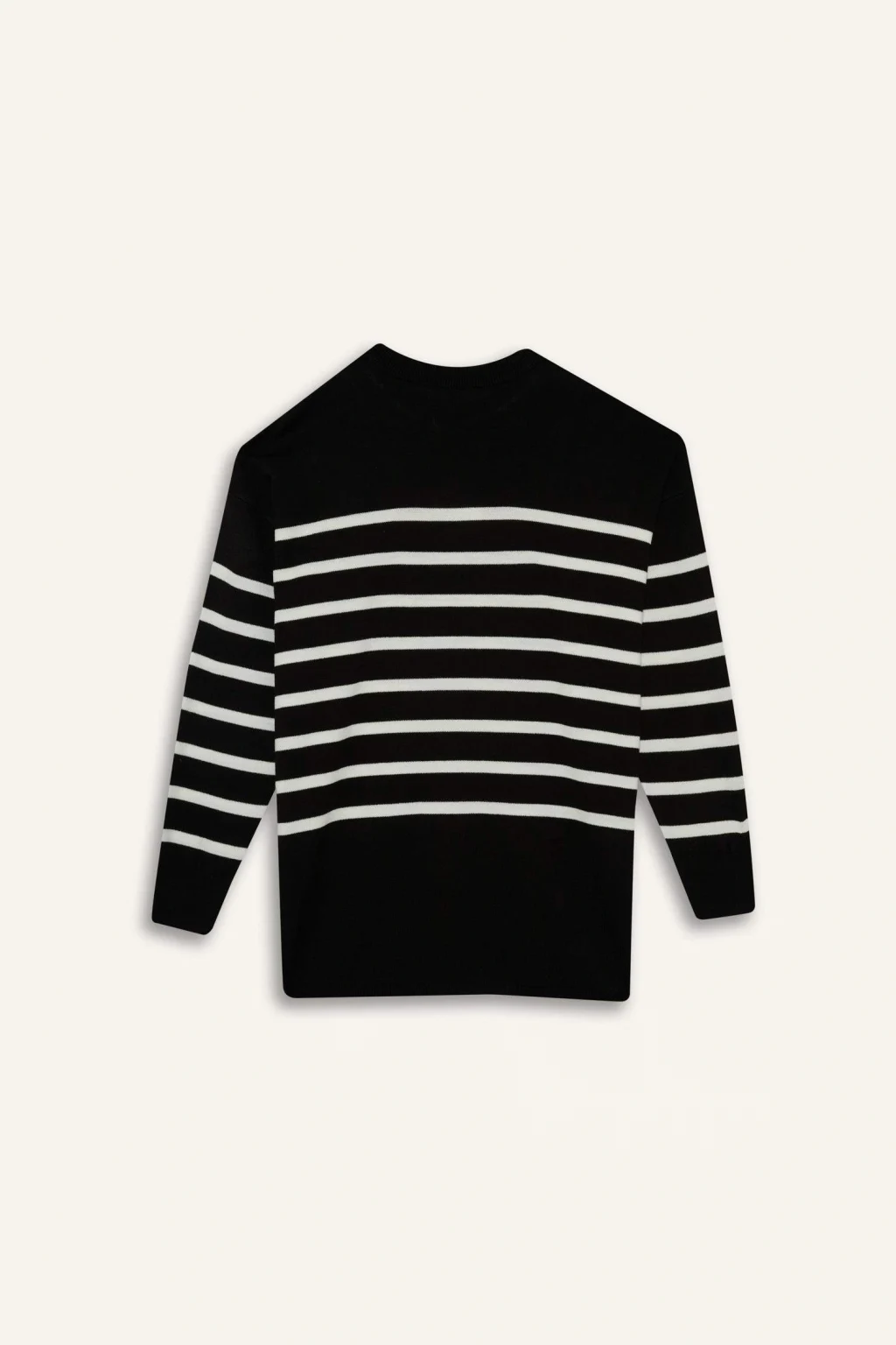 Defacto S7517 Siyah Relax Fit Çizgili Bisiklet Yaka Triko Kazak Tunik