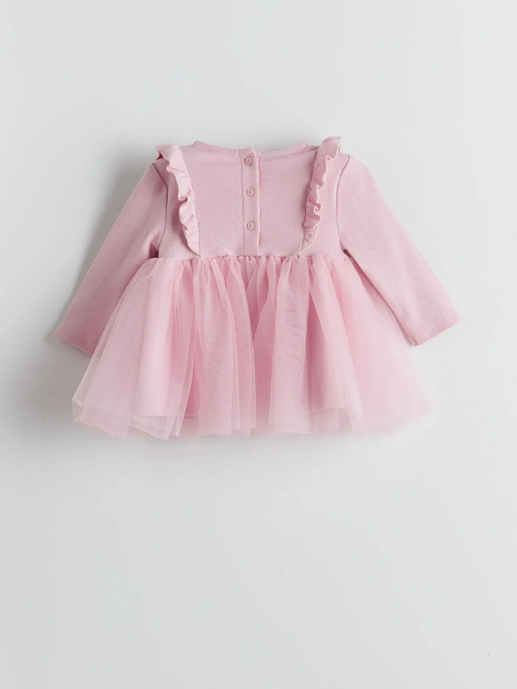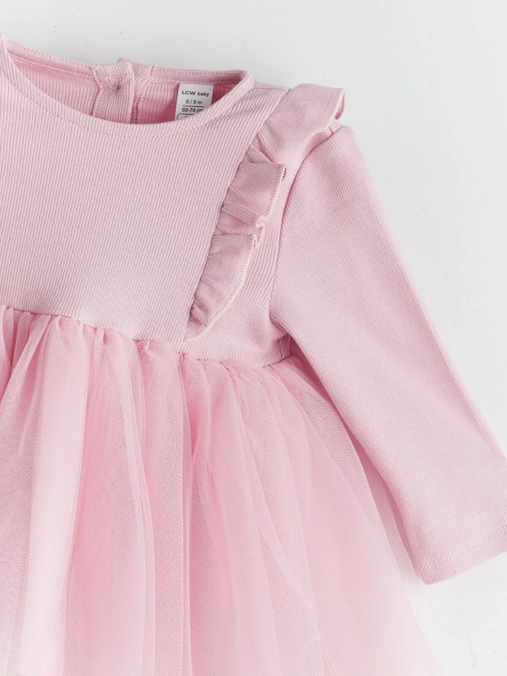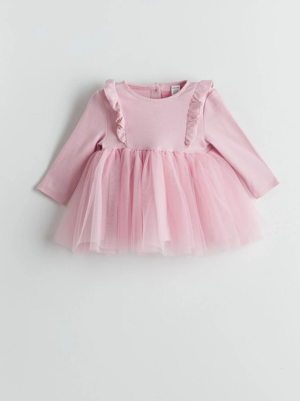 Bisiklet yaka tütülü kız bebek elbise, fırfırlı tül eteğiyle dikkat çeker. Rahat kesimiyle hareket özgürlüğü sunar.