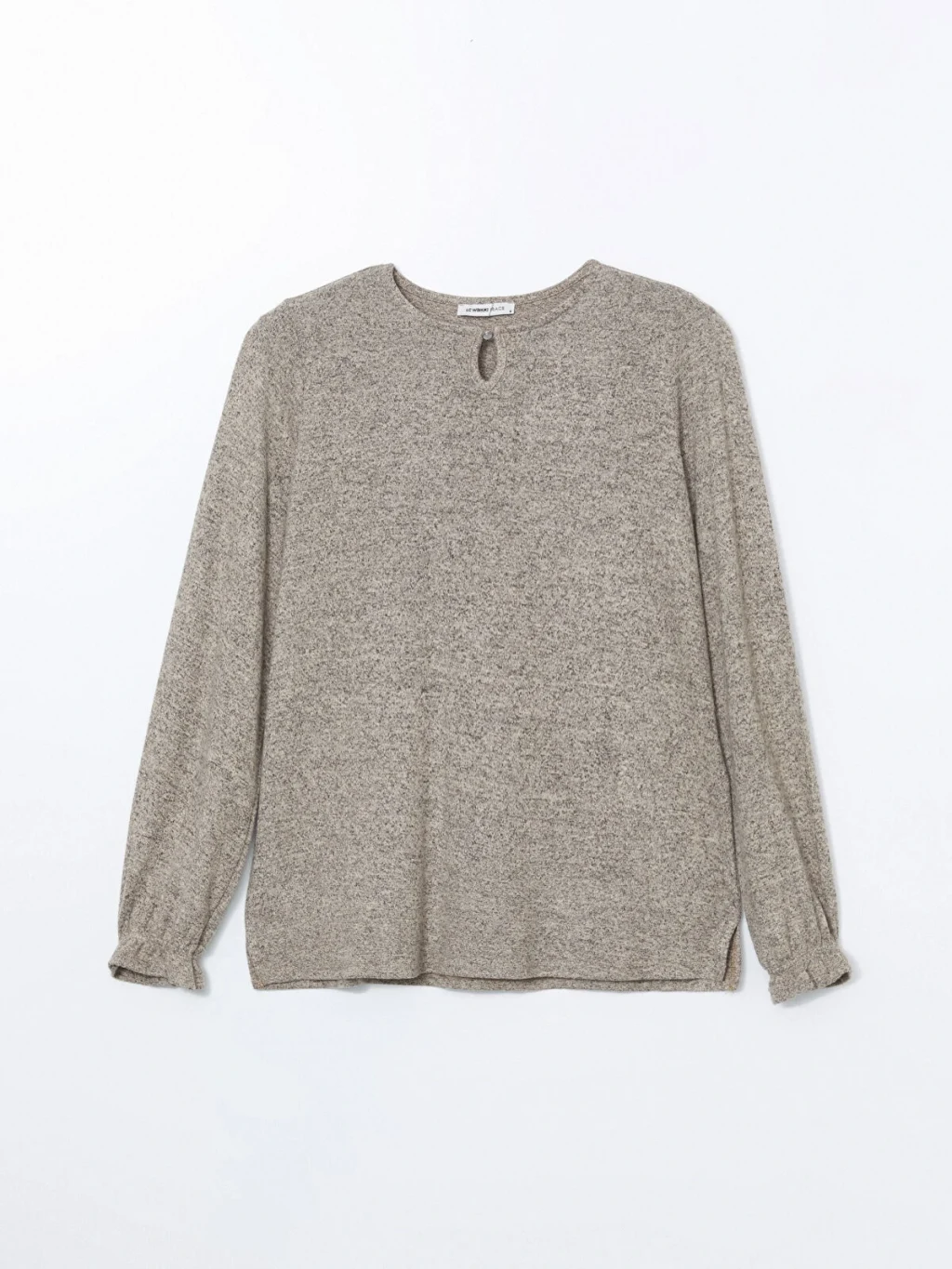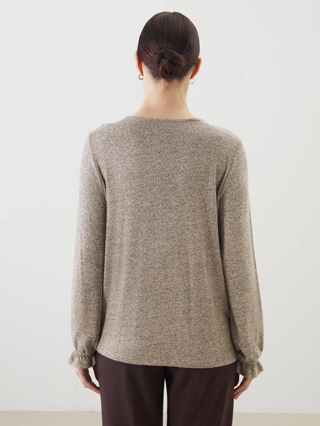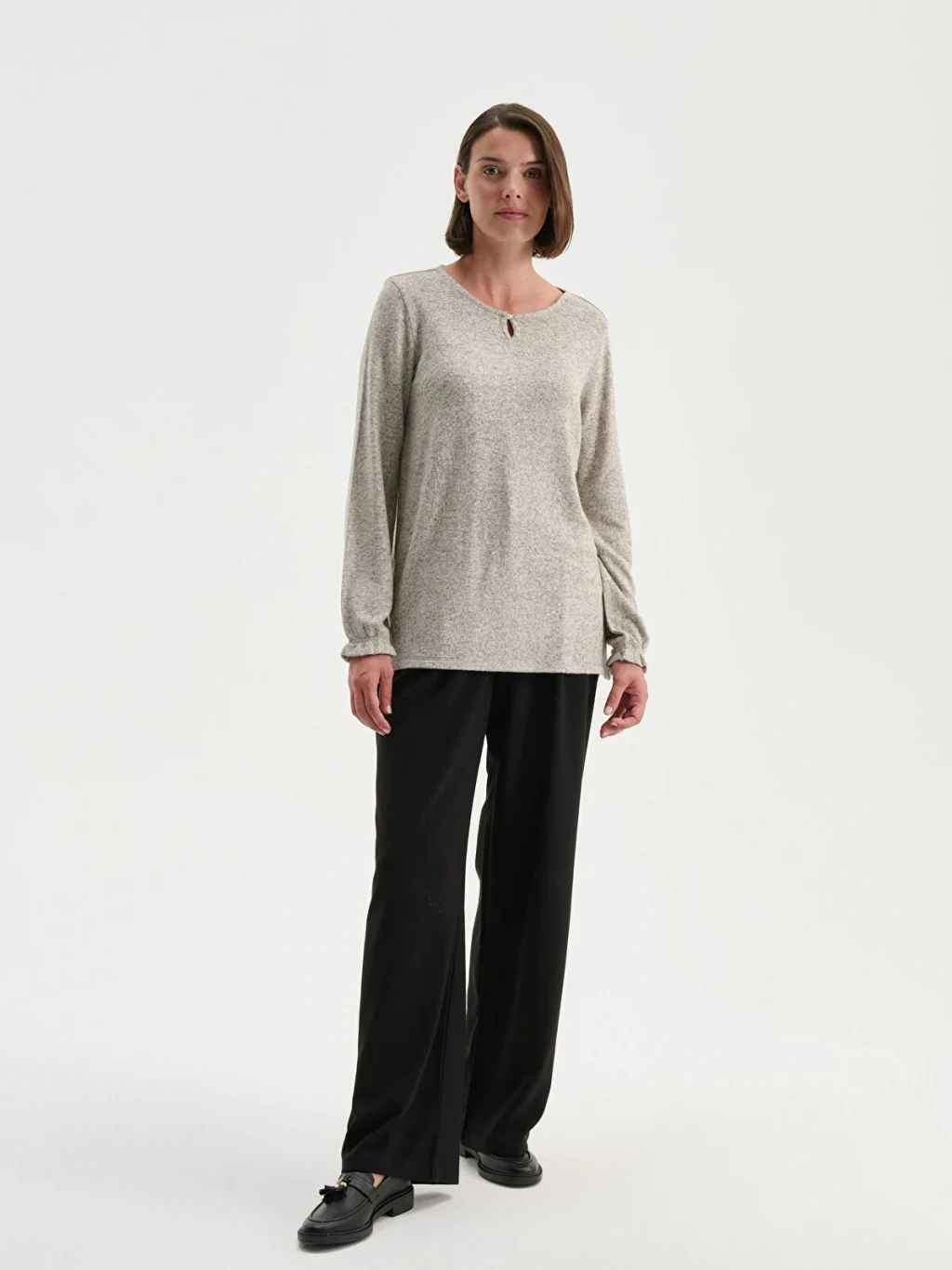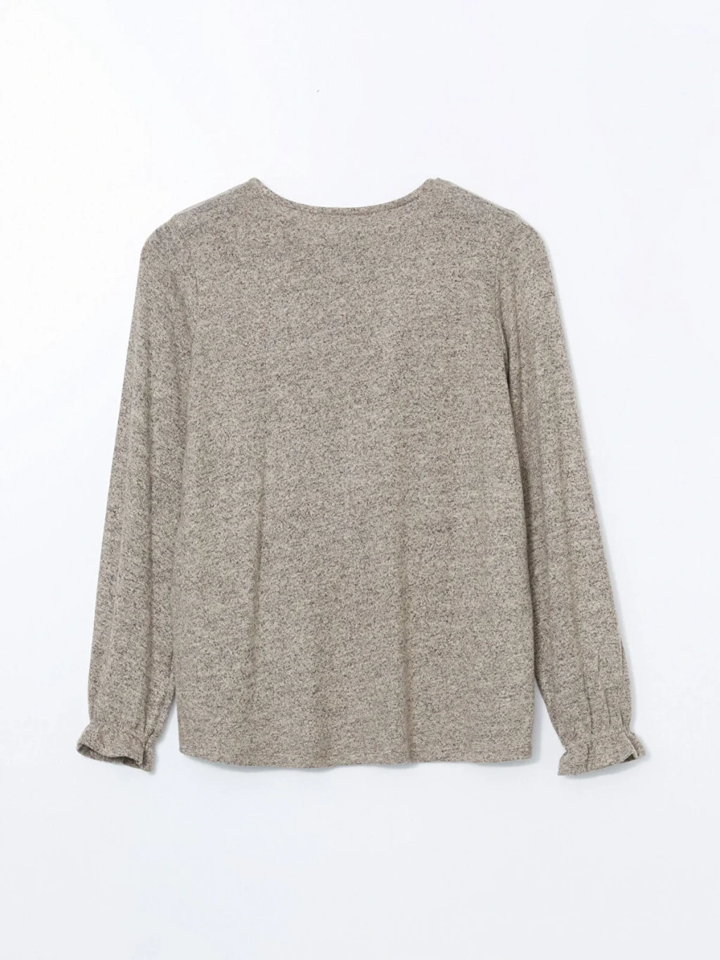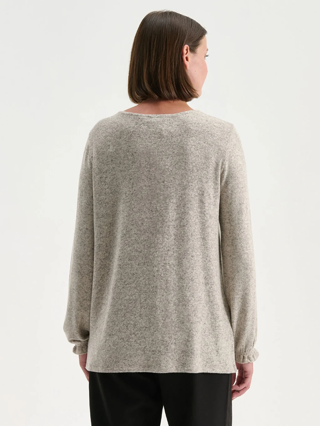 Triko görünümlü kumaştan üretilen kadın bluz, bisiklet yakalı ve uzun kolludur. Yaka ortasında damla dekoltesi, kol uçlarında ise lastik detayı bulunur.