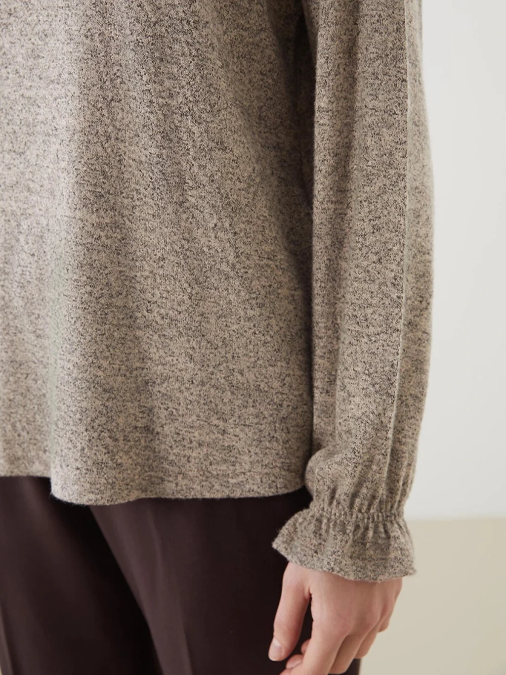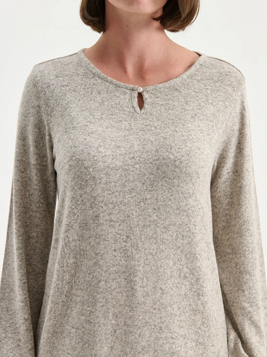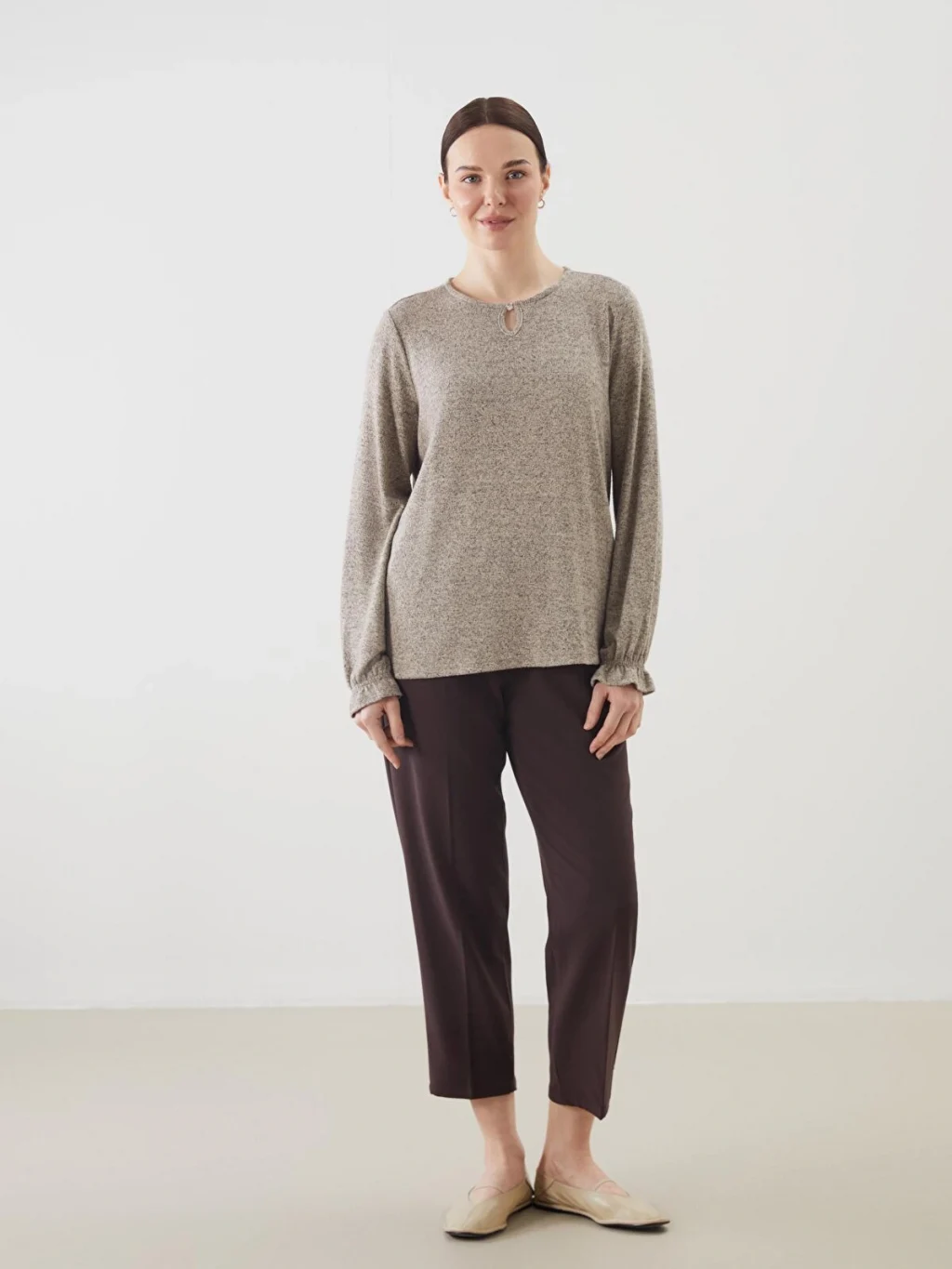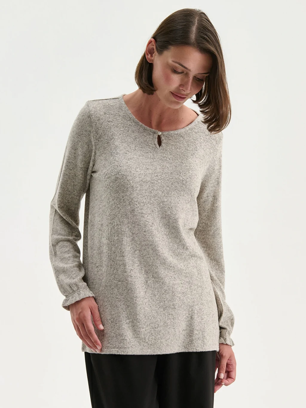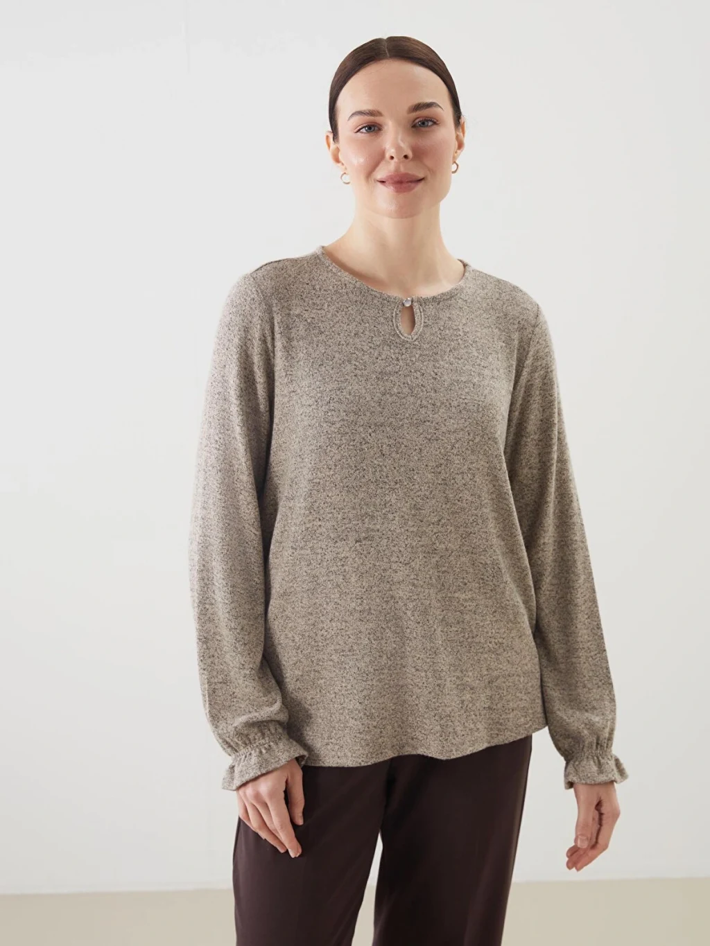 Triko görünümlü kumaştan üretilen kadın bluz, bisiklet yakalı ve uzun kolludur. Yaka ortasında damla dekoltesi, kol uçlarında ise lastik detayı bulunur.