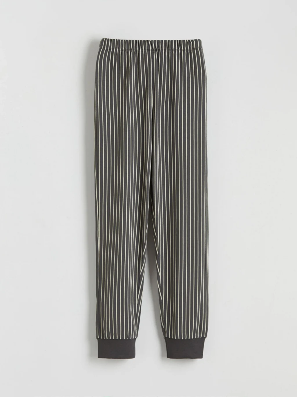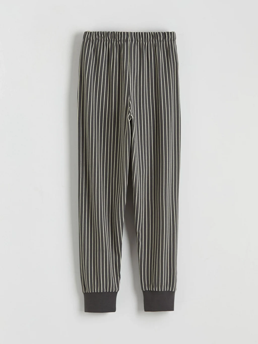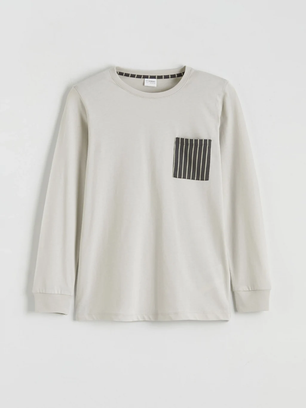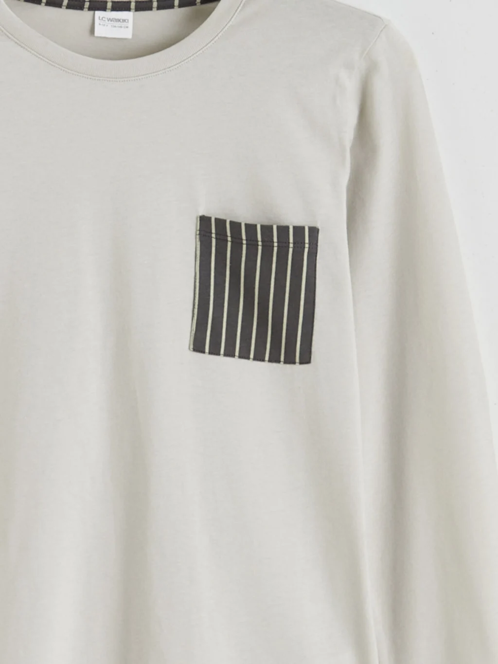 Erkek çocuk pijama takımı, %100 pamuklu kumaştır. Bisiklet yaka, uzun kollu, tek cepli üst ve çizgili, paçası ribanalı alttan oluşur.