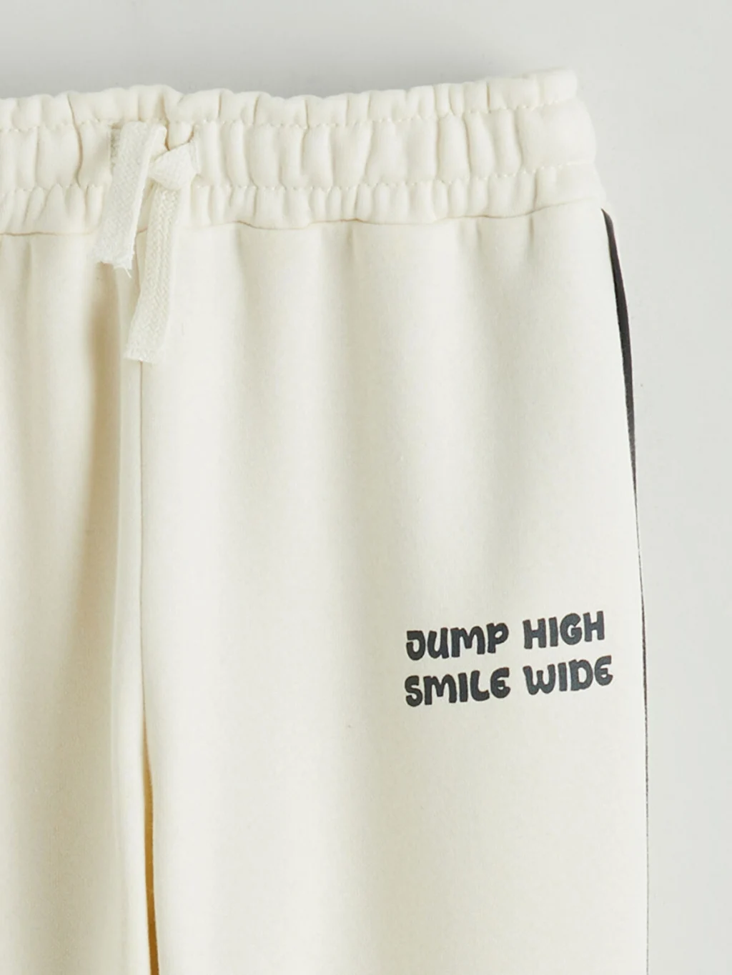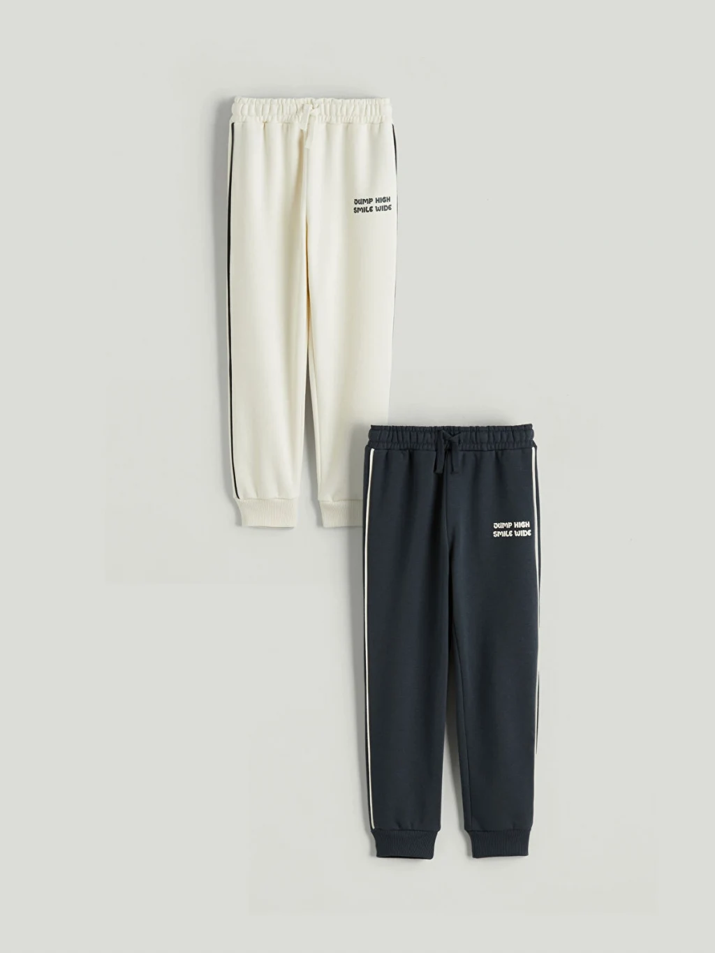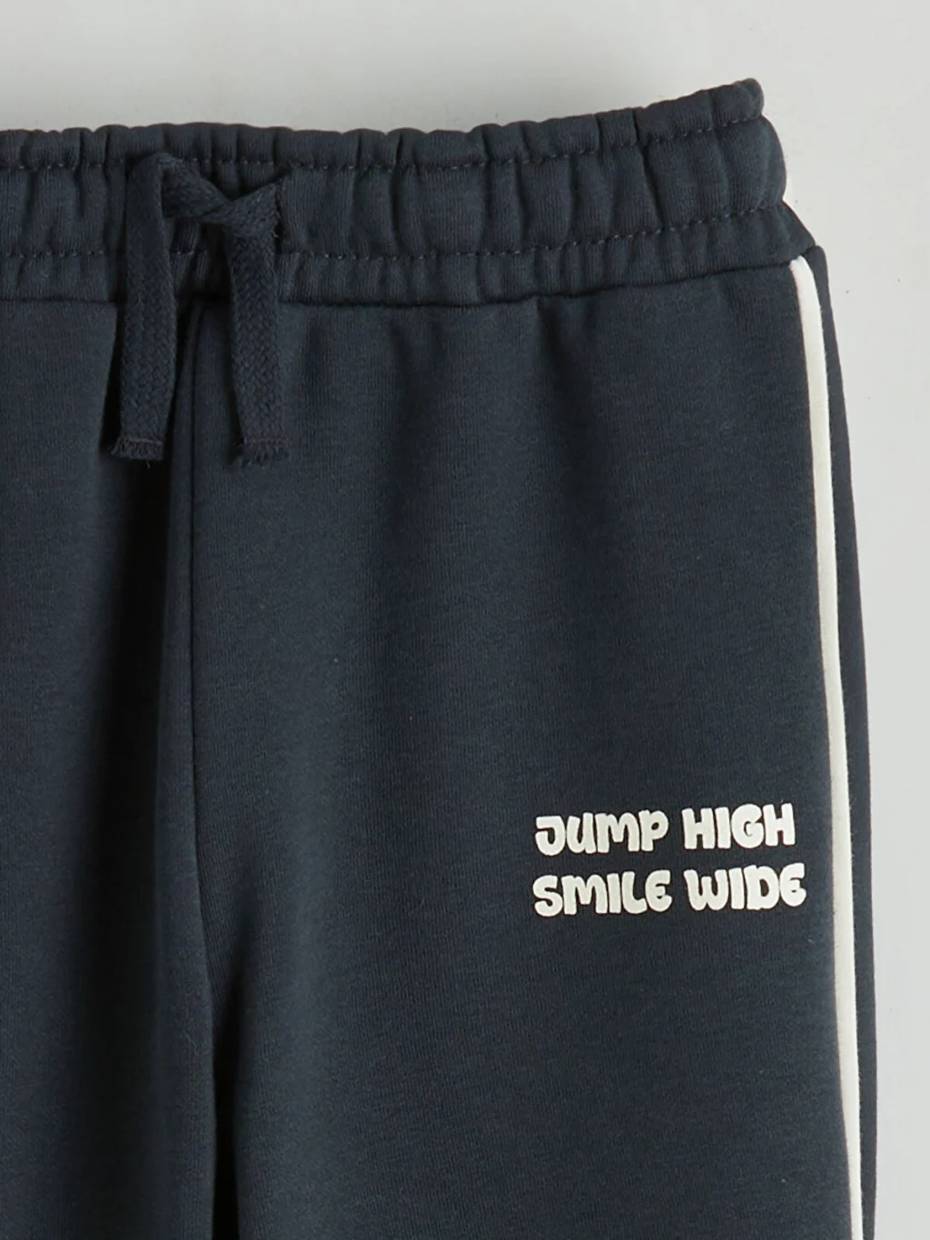 Beli lastikli ve ayarlanabilir bağcıklı erkek çocuk eşofman altı, yanları şeritli, paçaları ribanalı ve önü baskılıdır.