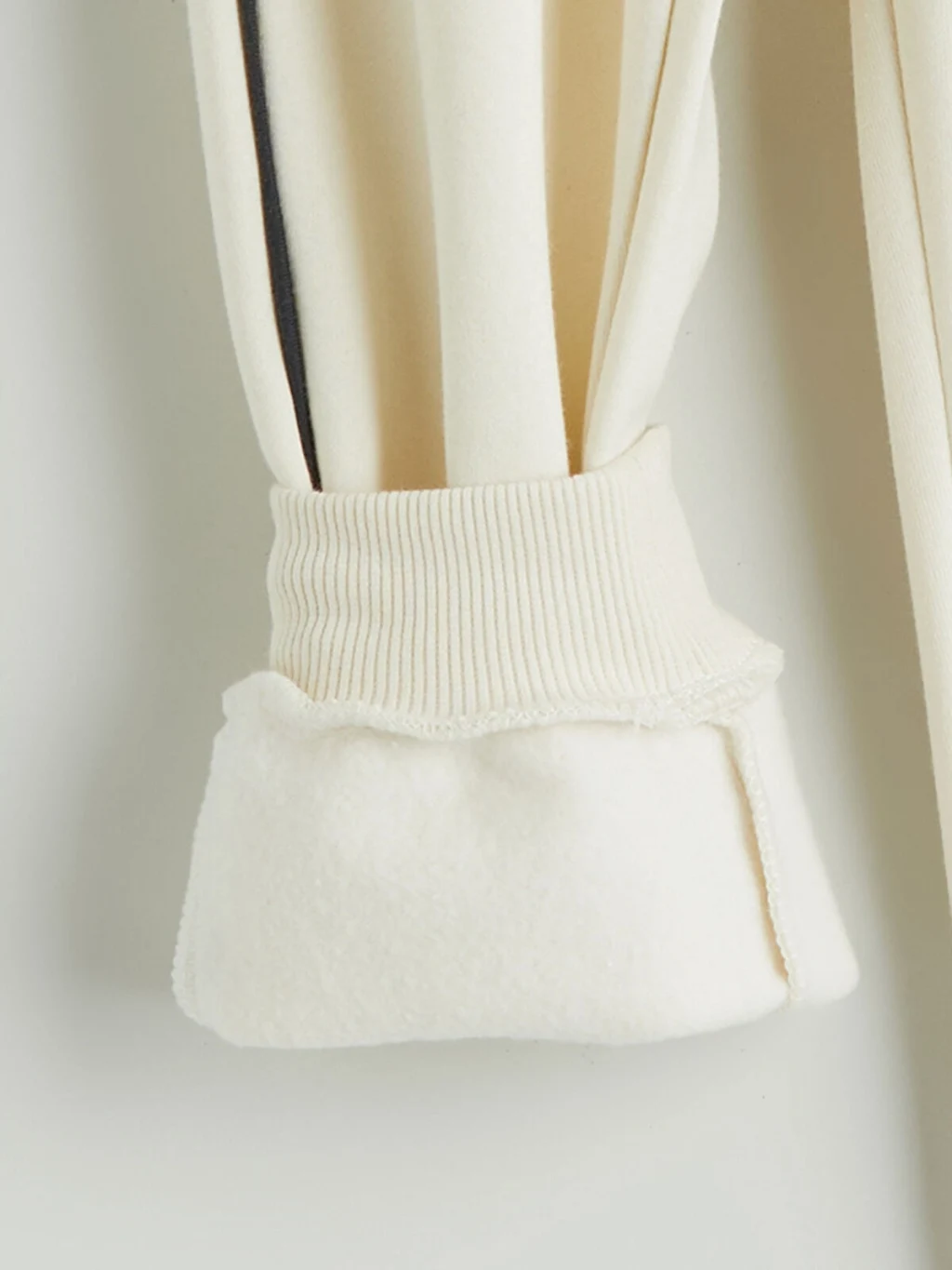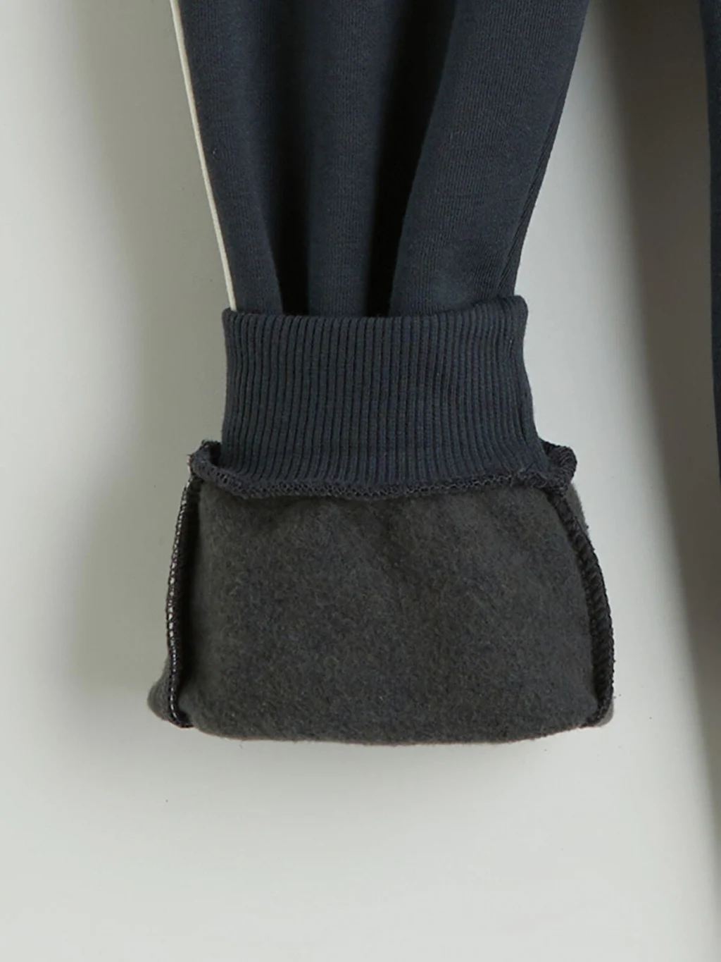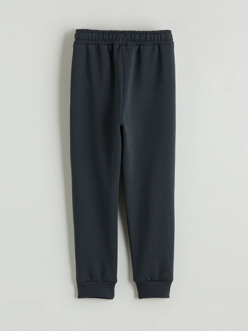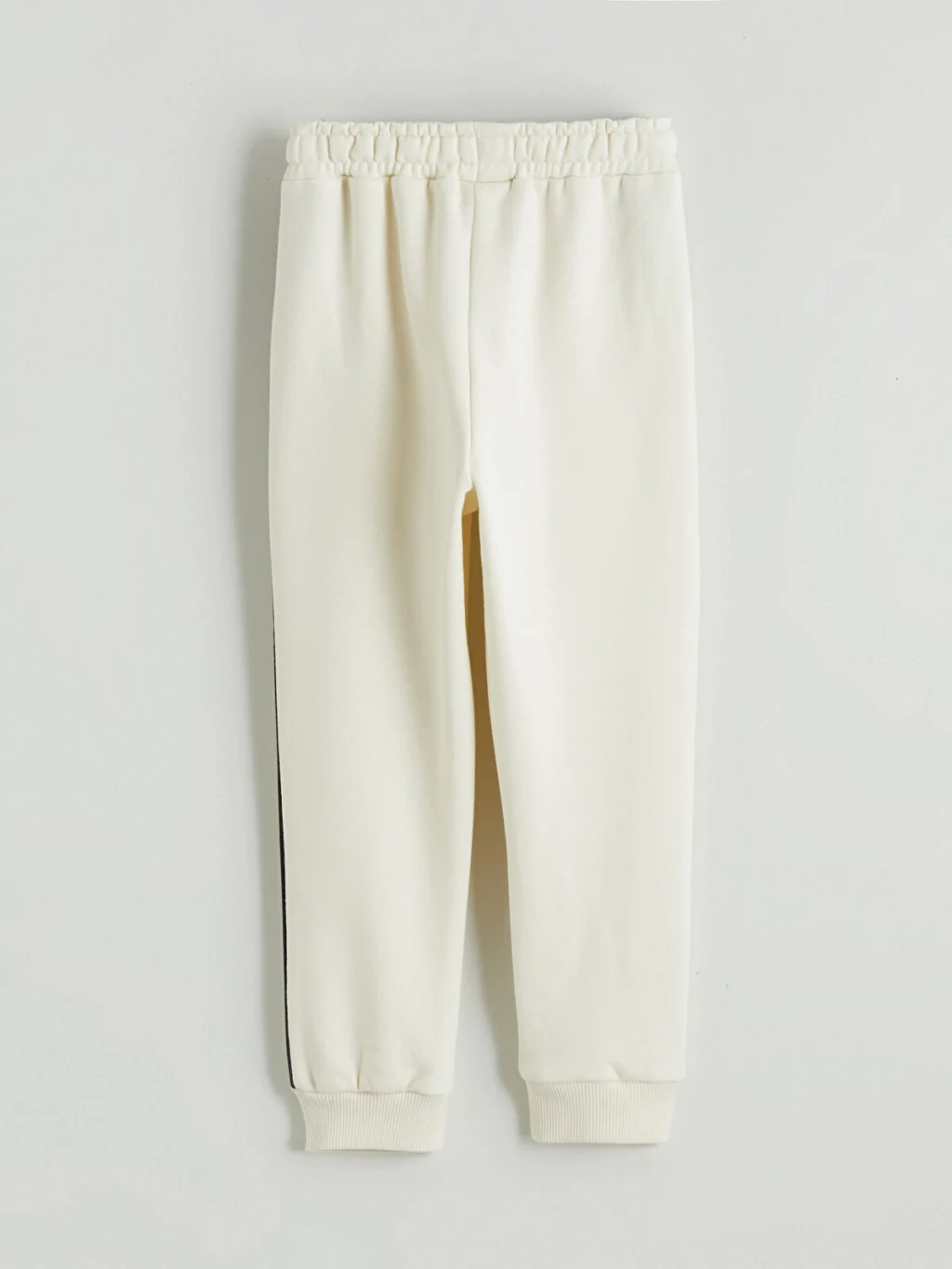 Beli lastikli ve ayarlanabilir bağcıklı erkek çocuk eşofman altı, yanları şeritli, paçaları ribanalı ve önü baskılıdır.