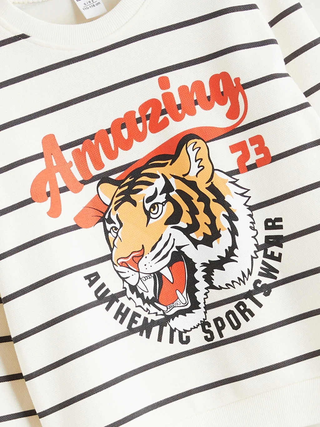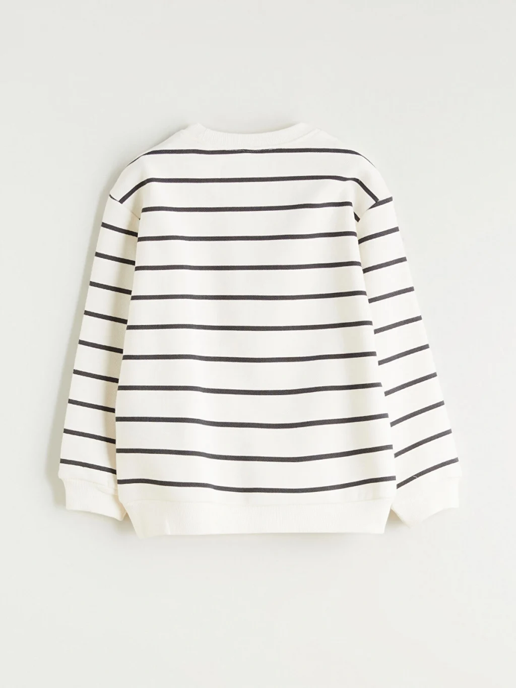Yüksek pamuk içeren kalın pike kumaştan üretilen erkek çocuk sweatshirt, bisiklet yaka ve uzun kolludur. Çizgili ve önü baskılı tasarıma sahiptir.