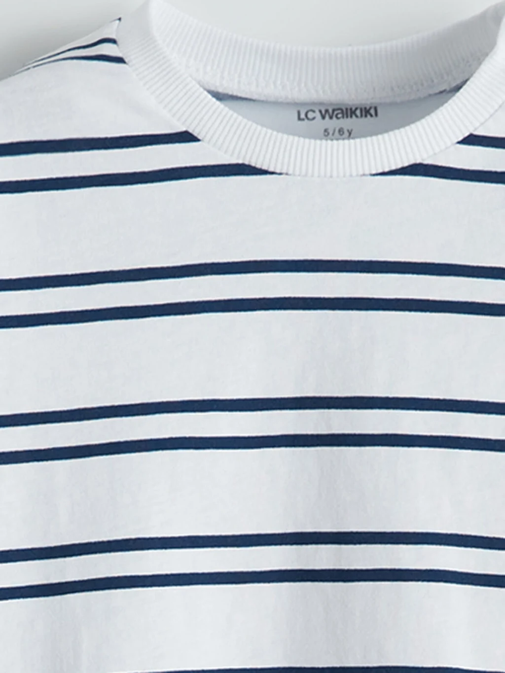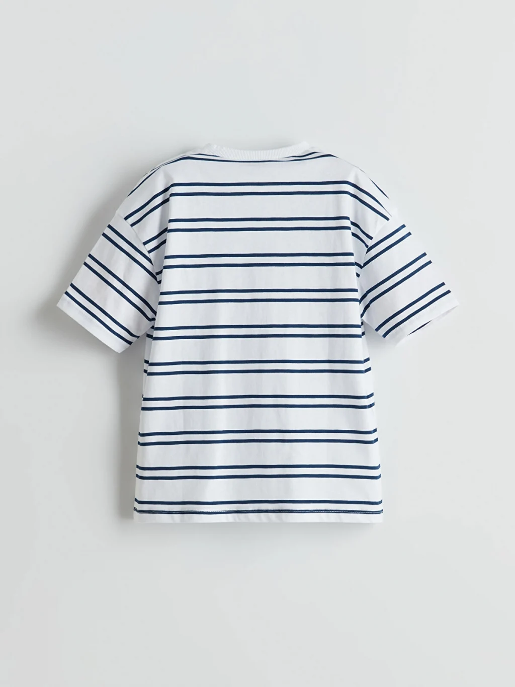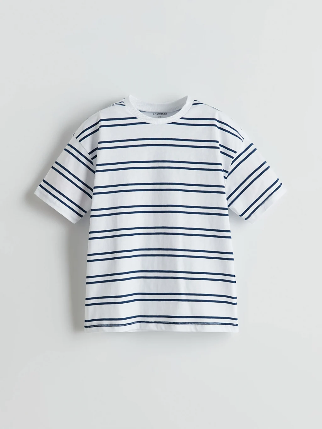 Bol kalıplı, bisiklet yaka ve kısa kollu erkek çocuk tişört, %100 pamuklu penye kumaştan üretilmiştir ve çizgili desene sahiptir.