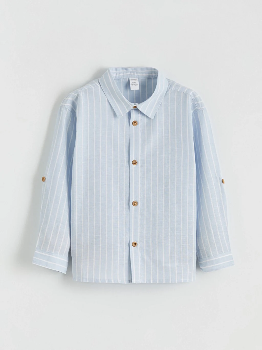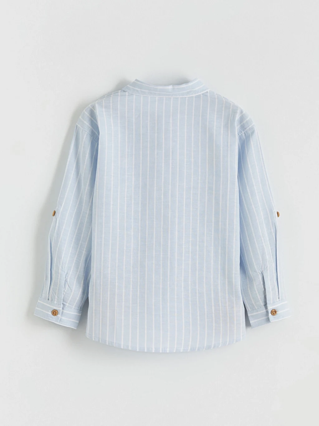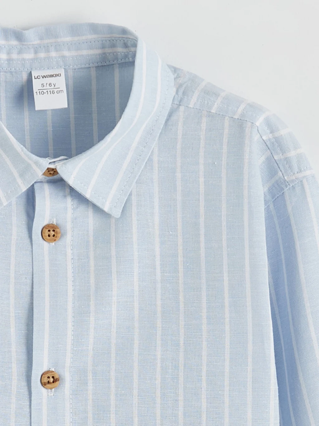 Gömlek yakalı ve uzun kollu erkek çocuk gömlek, çizgili desene sahiptir. Önden düğme kapamalıdır ve kollarında apolet detayı bulunur.