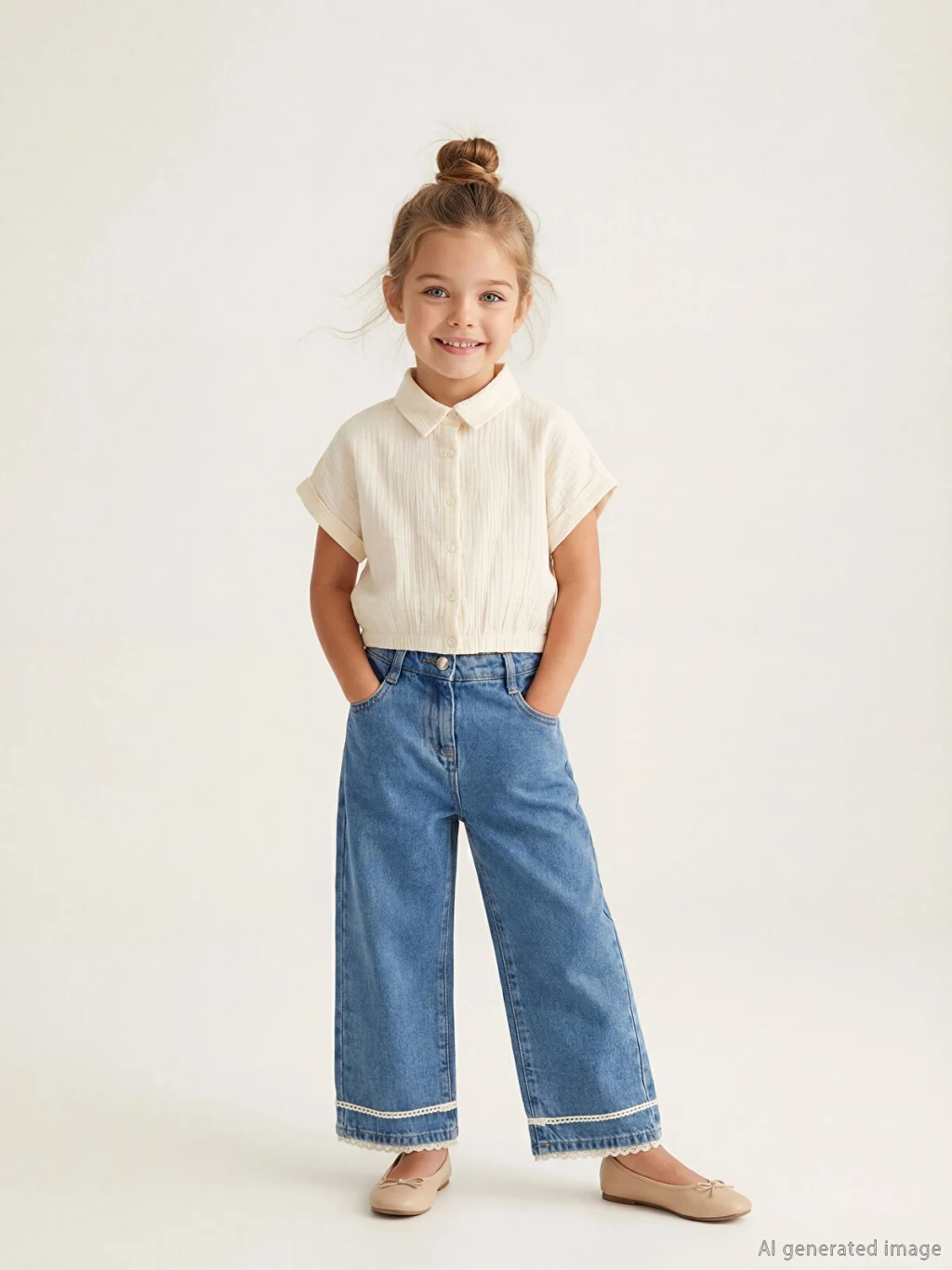 Kız çocuk jean pantolon, %100 pamuklu kumaştan üretilmiştir. Beli lastikli, fermuar ve düğme kapamalı, beş cepli tasarıma sahiptir. Paçaları dantel detaylıdır.