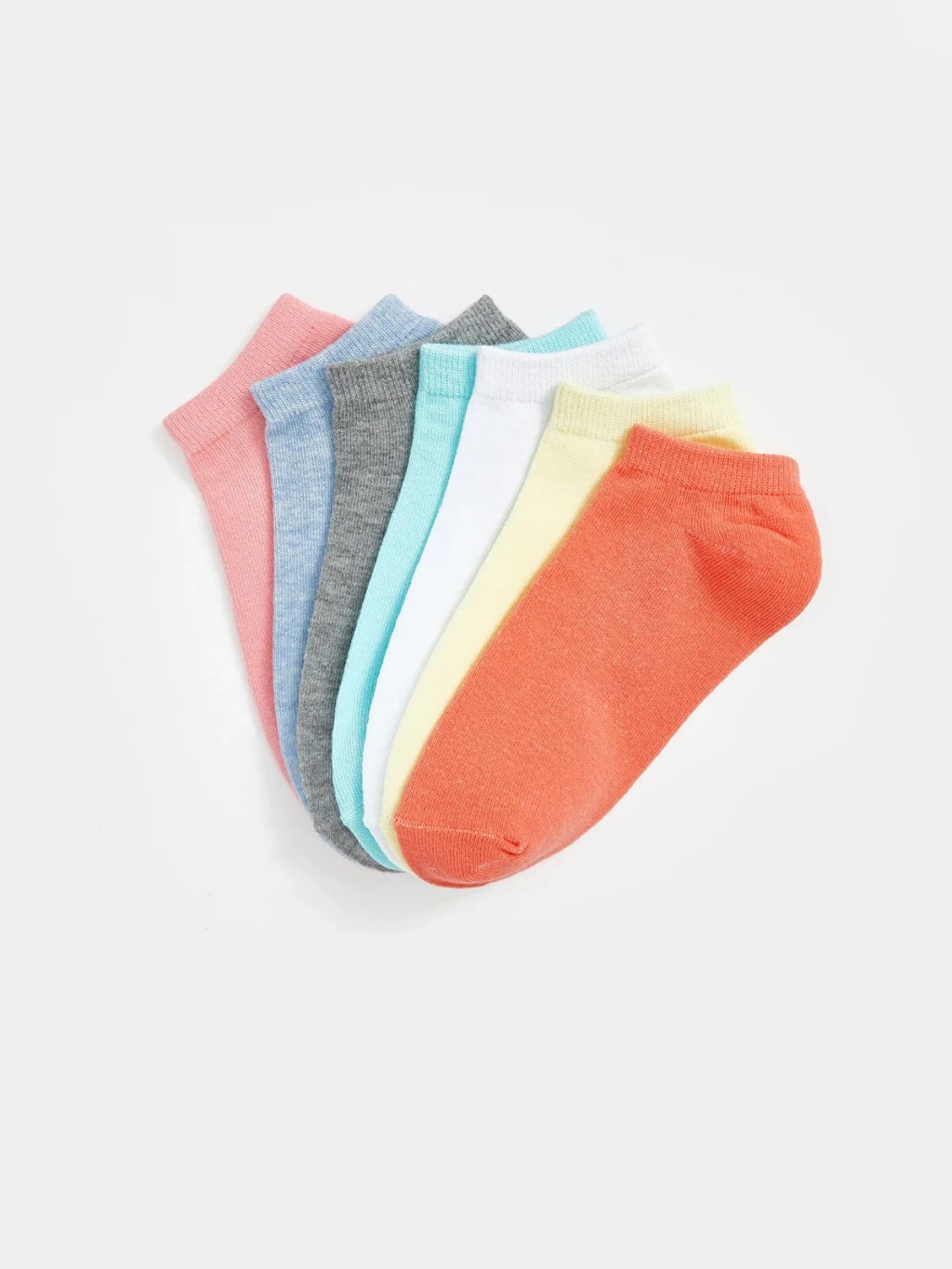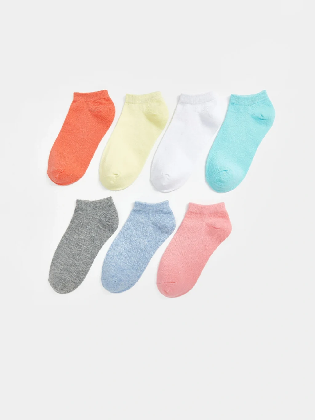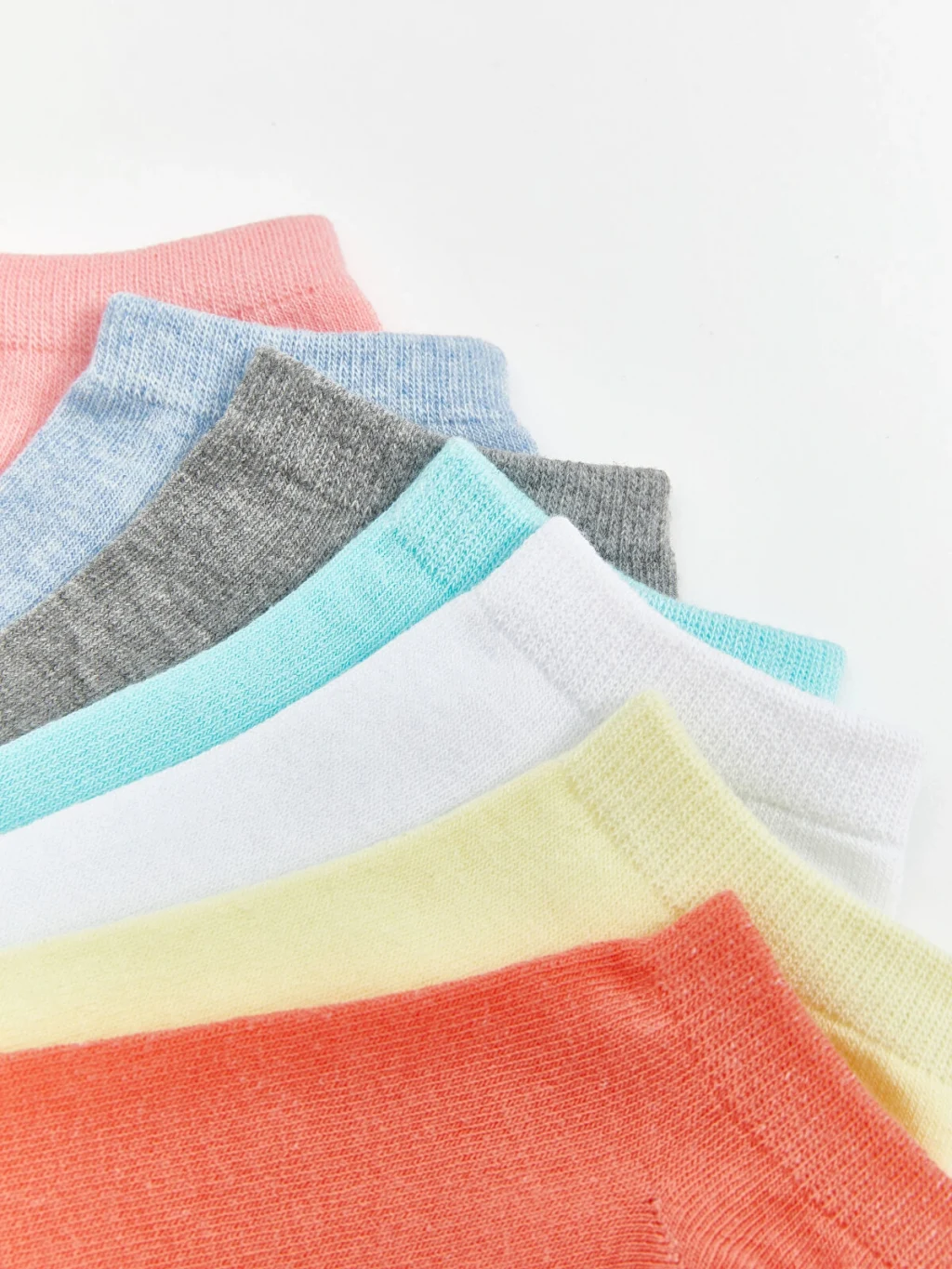 Yedi çiftten oluşan kız çocuk patik çorap seti, düz tasarımlı çoraplardan oluşur.