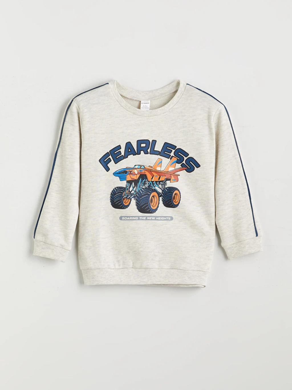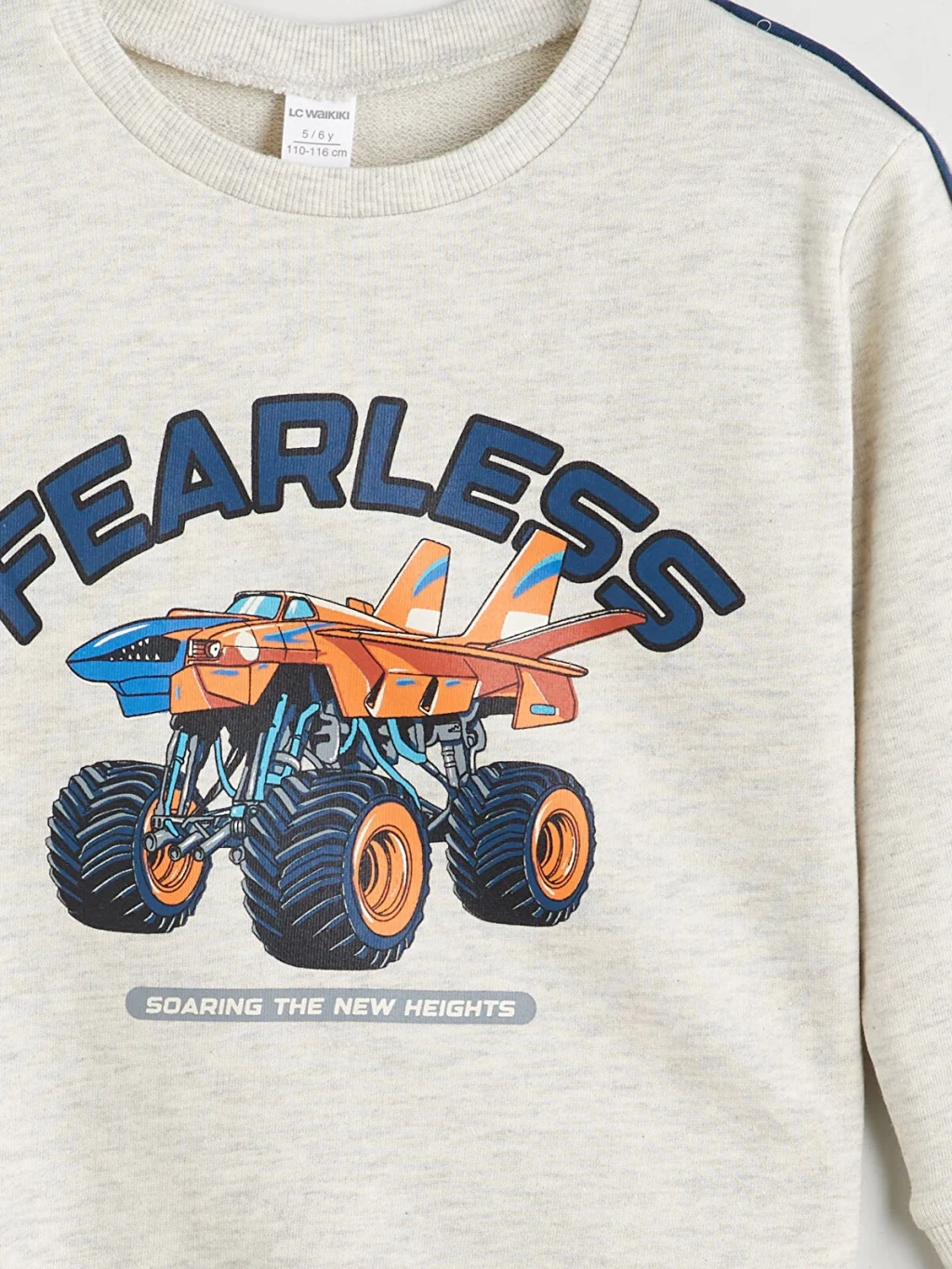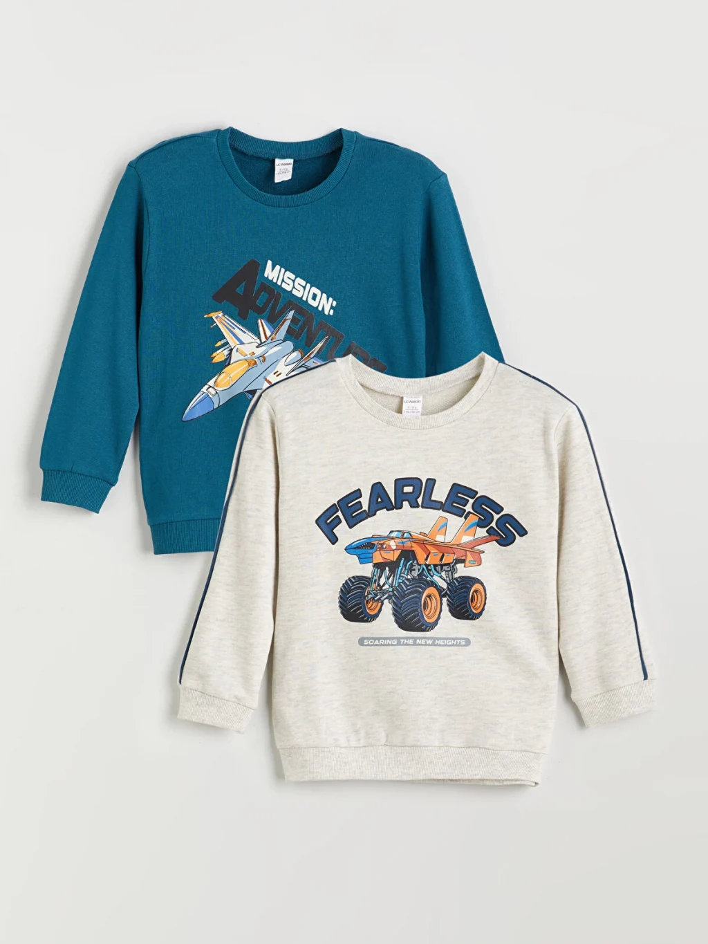 Bisiklet yaka ve uzun kollu erkek çocuk sweatshirt seti. Önü baskılı, bir tanesi kolları şeritli, bilek ve etek ucu ribanalıdır.
