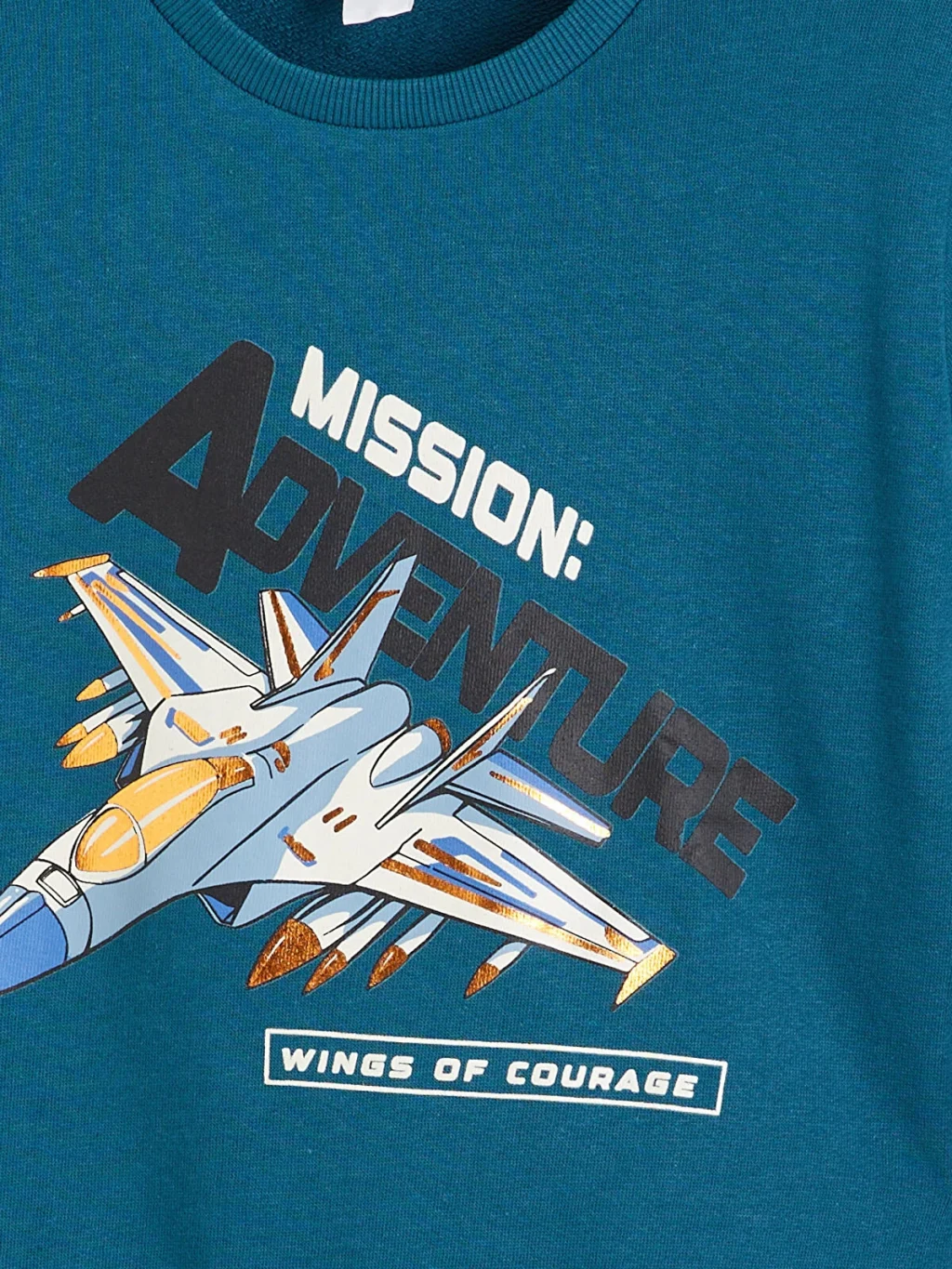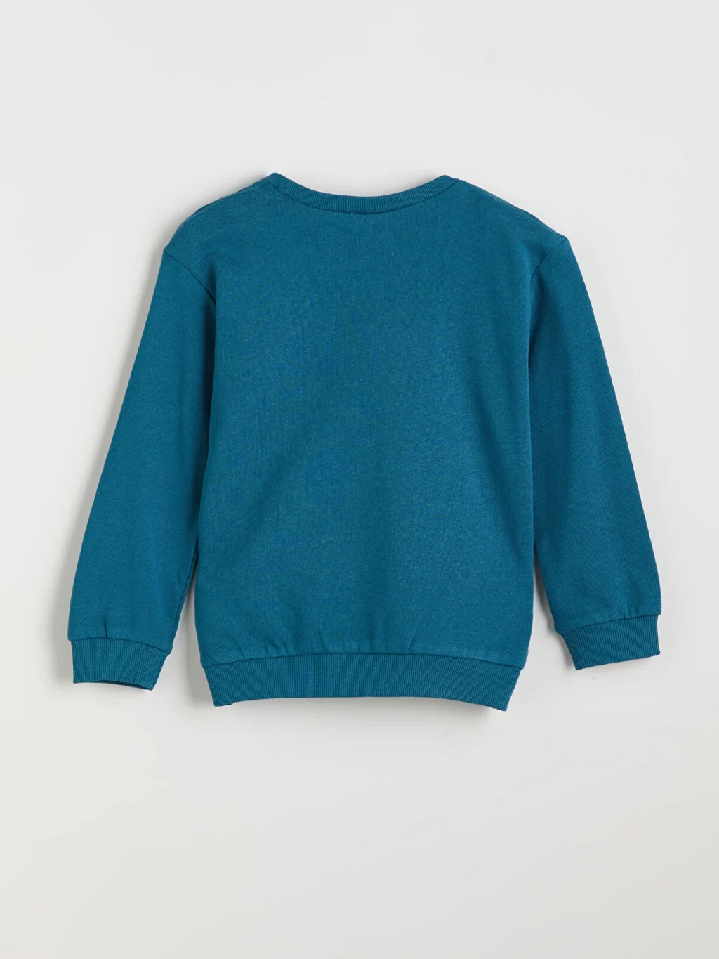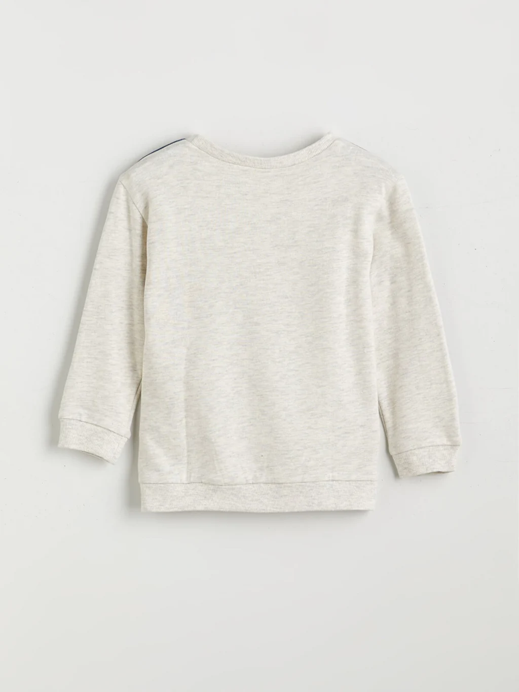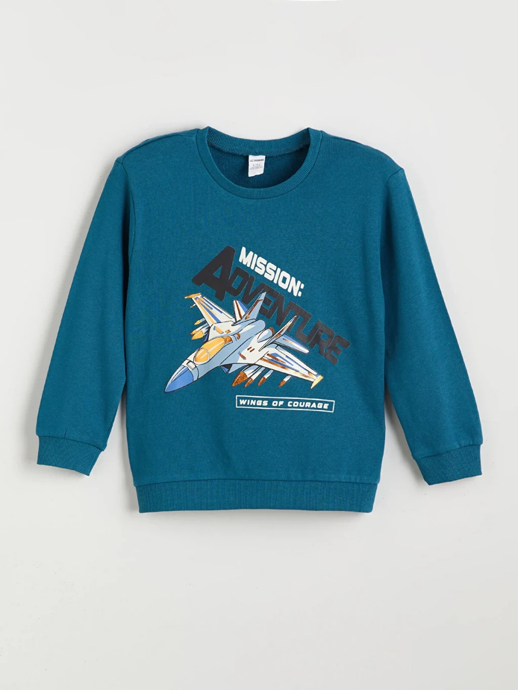 Bisiklet yaka ve uzun kollu erkek çocuk sweatshirt seti. Önü baskılı, bir tanesi kolları şeritli, bilek ve etek ucu ribanalıdır.