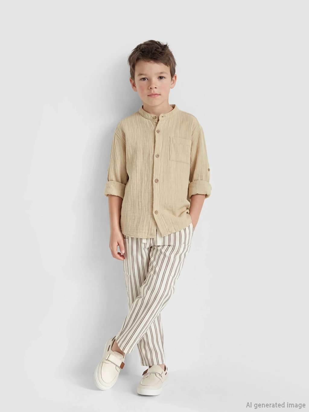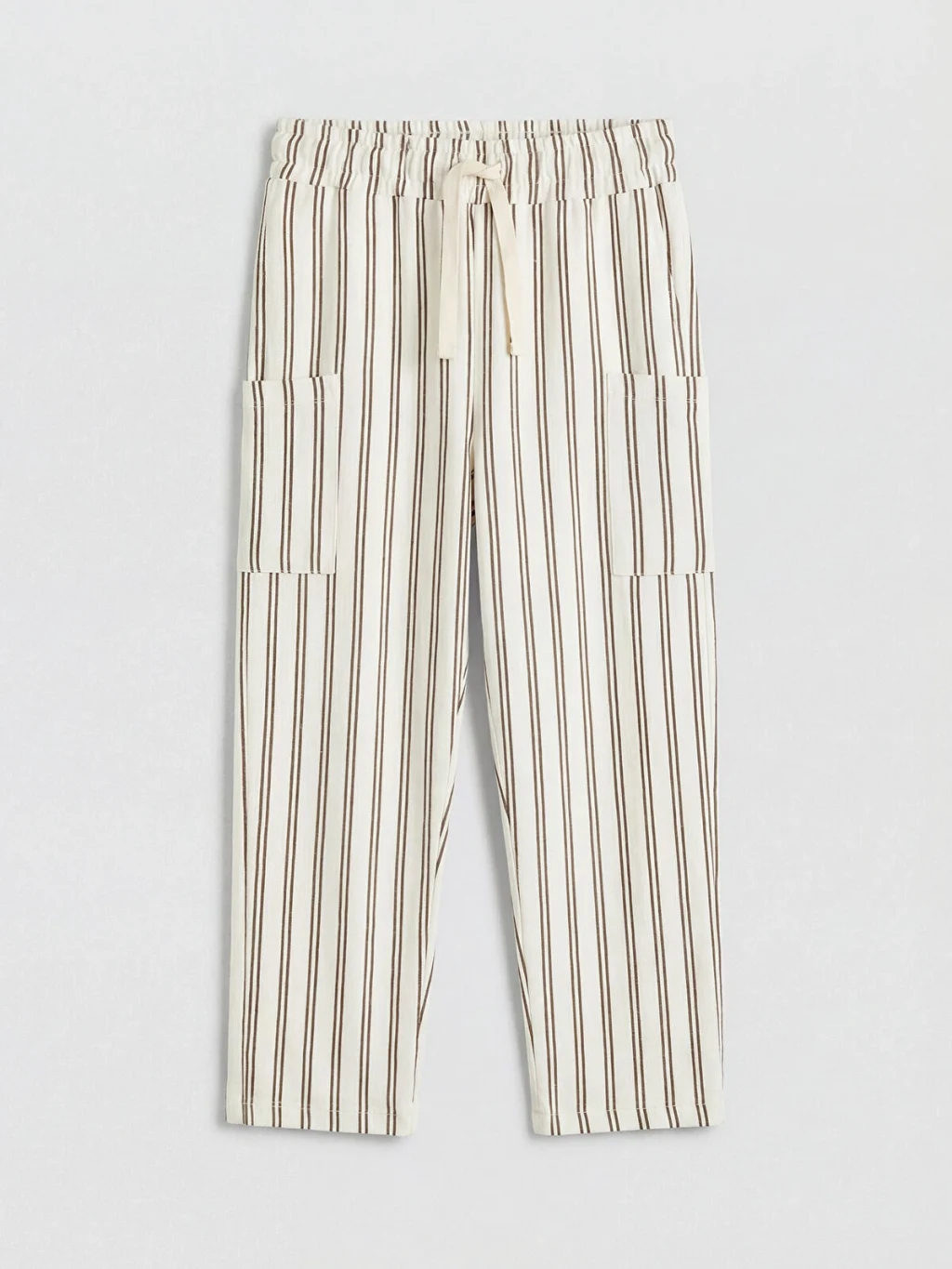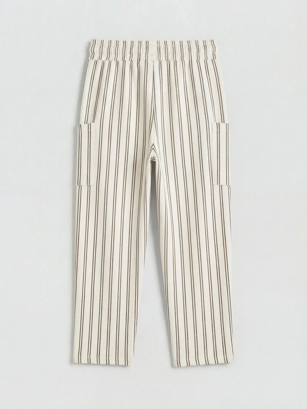 Erkek çocuk pantolon, beli lastikli ve ayarlanabilir bağcıklıdır. Çizgili desene sahiptir ve kargo ceplidir.