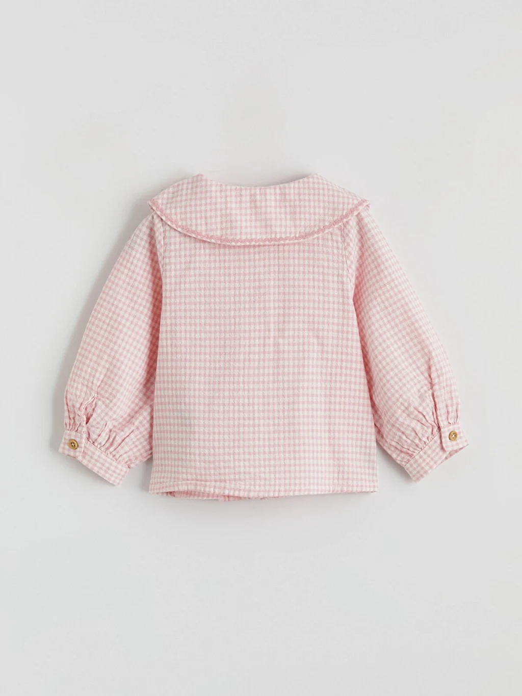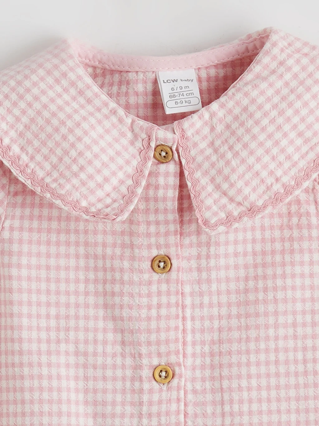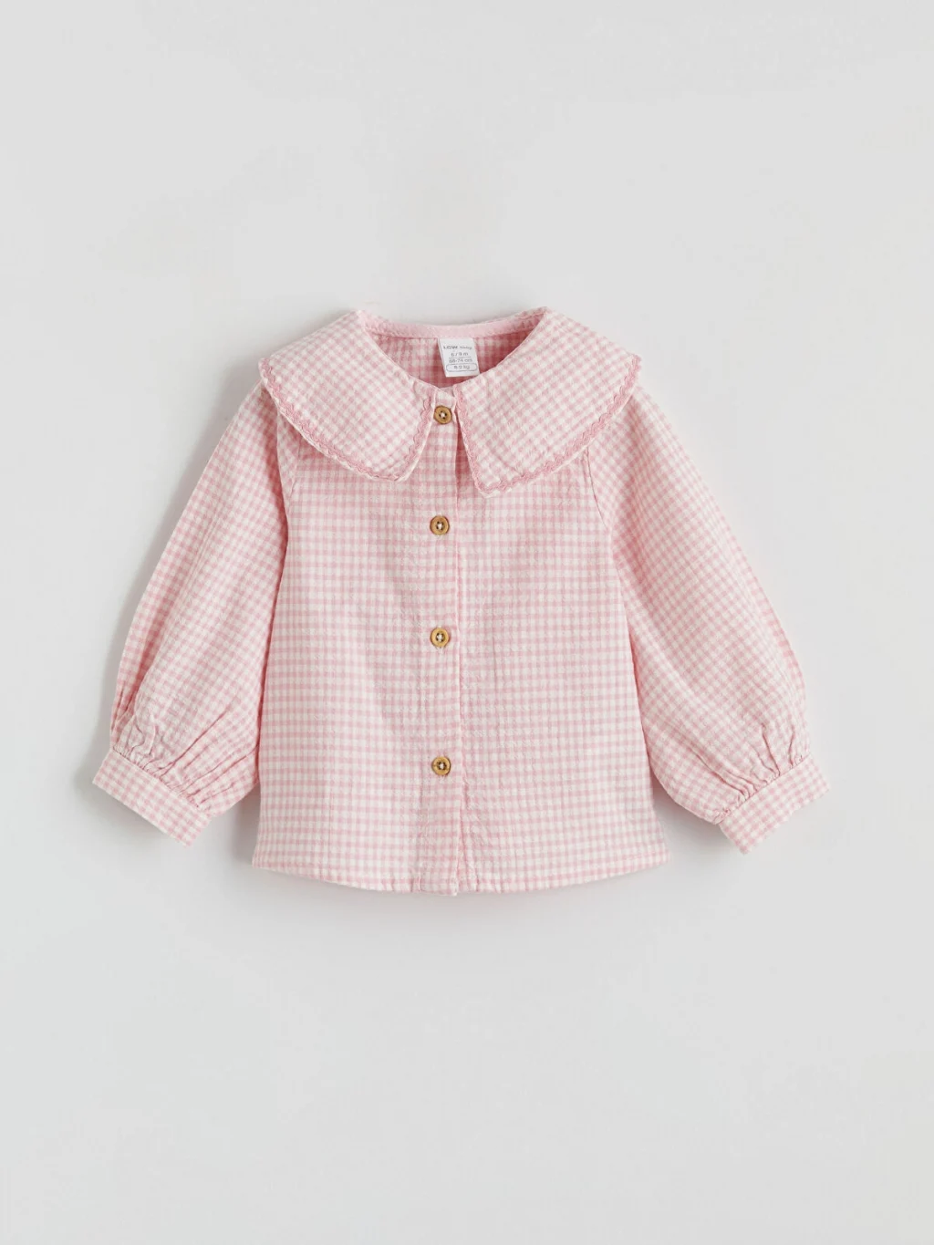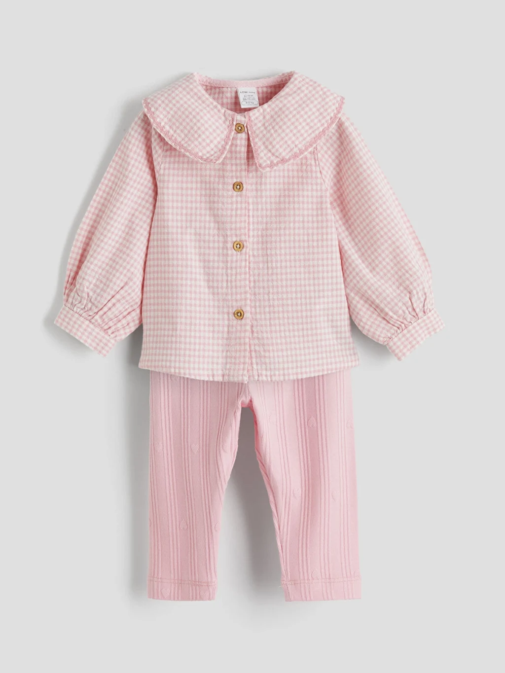 Kız bebek takım, pötikare desenli, bebe yakalı, uzun kollu gömlek ve desenli tayttan oluşur. Gömlek önden düğme kapamalıdır ve manşetleri lastiklidir.