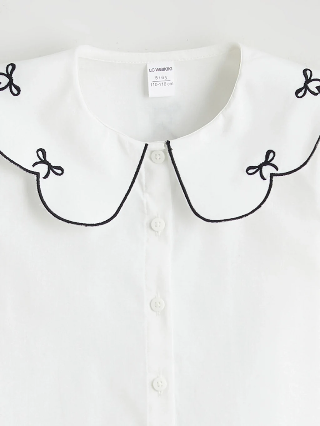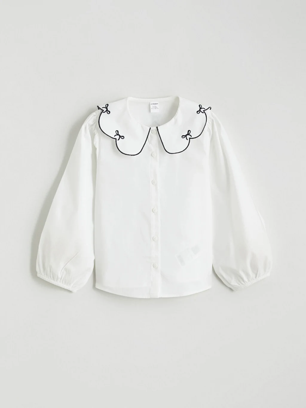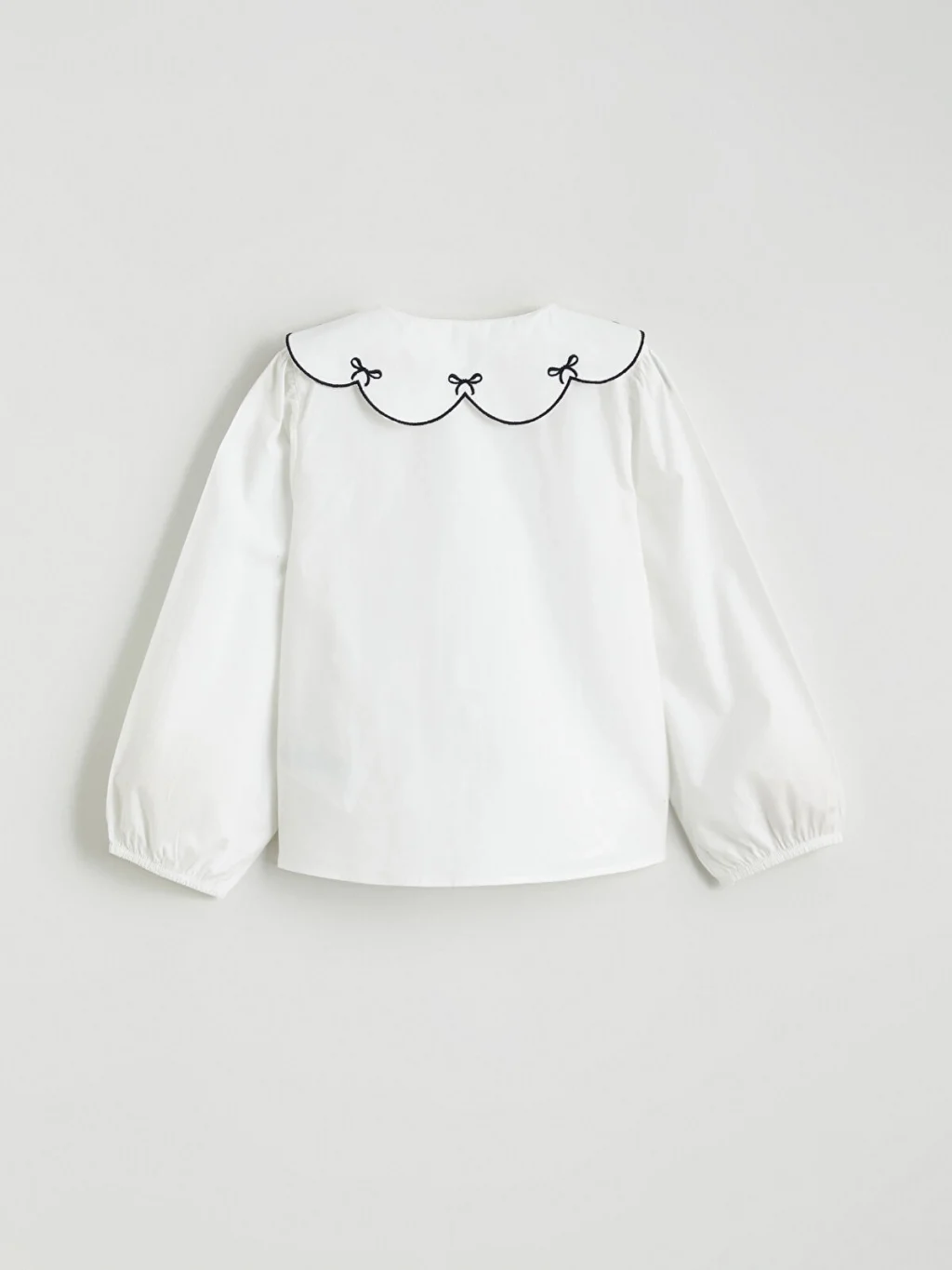 Bebe yakası işlemeli, uzun balon kollu kız çocuk gömlek, %100 pamuk poplin kumaştan üretilmiştir ve önden düğme kapamalıdır.