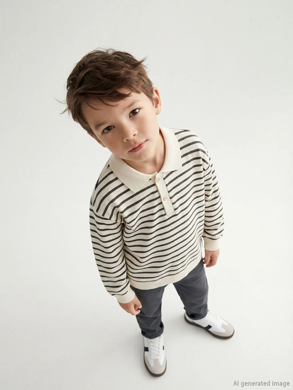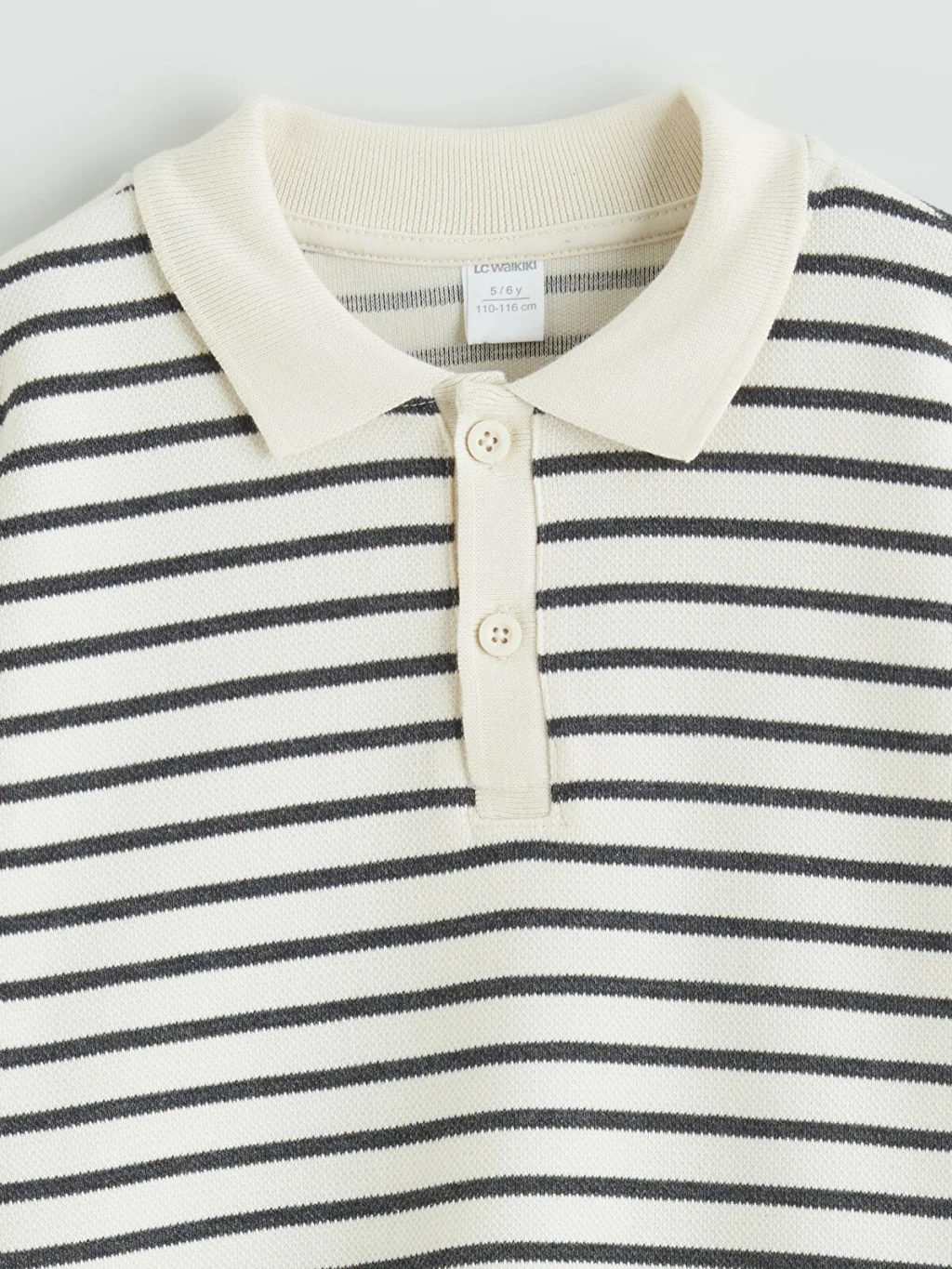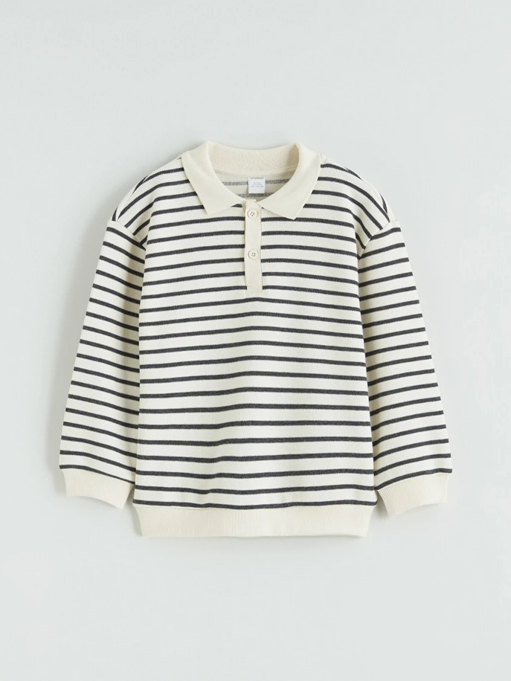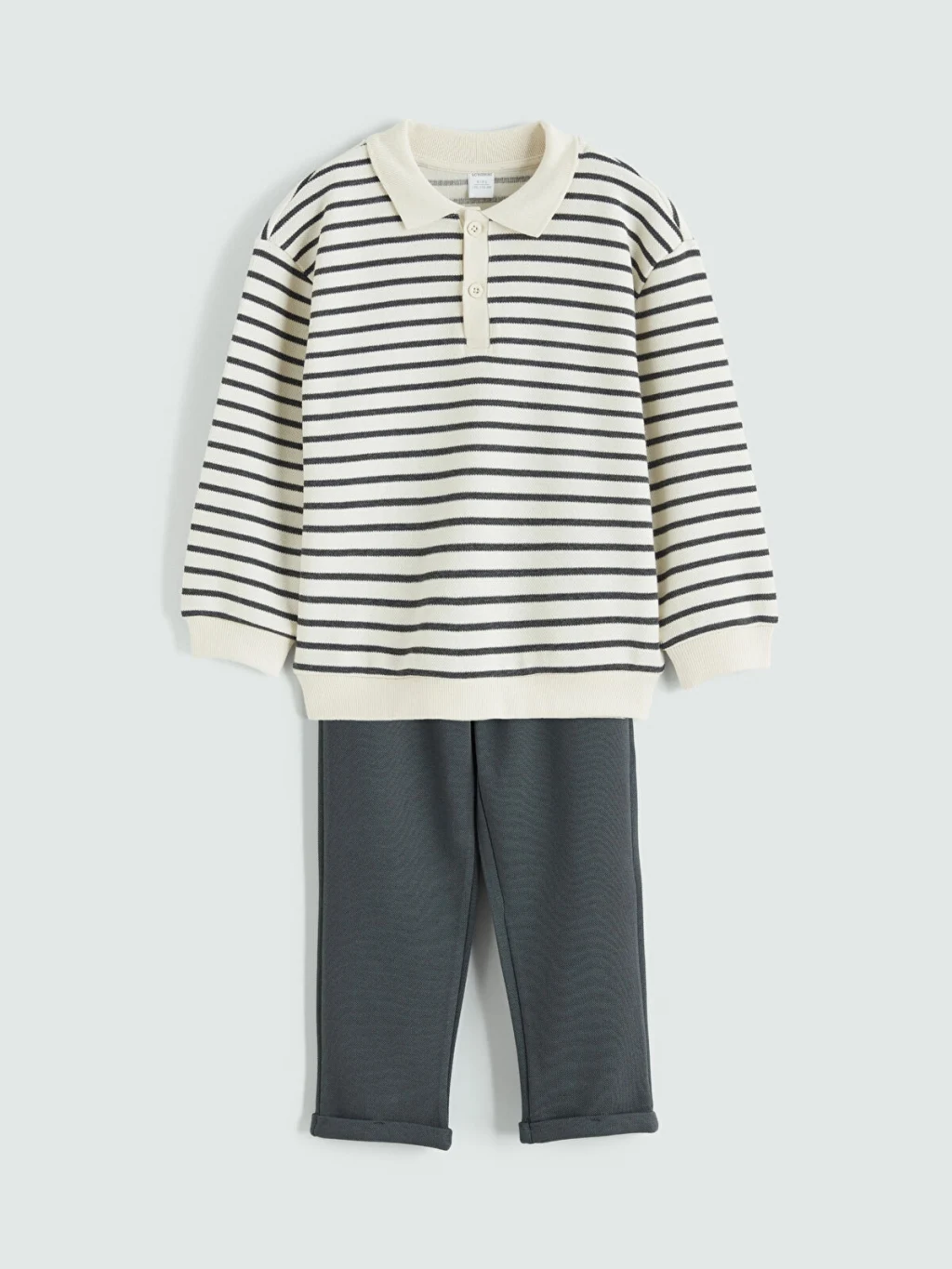 Yüksek pamuk içerikli interlok kumaştan üretilmiş erkek çocuk takım; polo yaka, uzun kollu, düğme kapamalı, çizgili üst ve desensiz alttan oluşur.