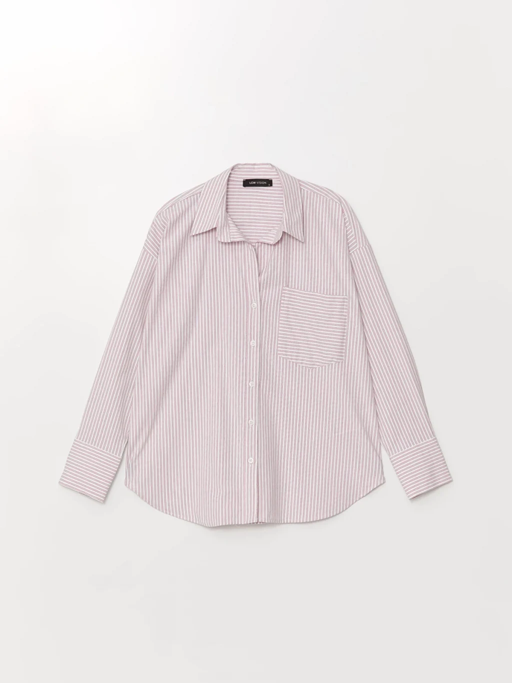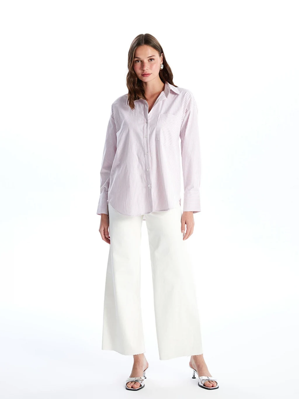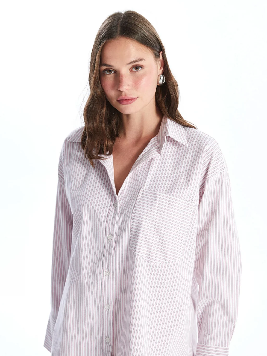 Çizgili uzun kollu kadın gömlek, oversize tasarımı ile rahatlık ve stili bir arada sunar. Zarif çizgili deseni ve geniş kesimi, her kıyafetle uyum sağlayacak şekilde tasarlanmış olup, konforlu ve stil sahibi bir görünüm yakalamanızı sağlar.