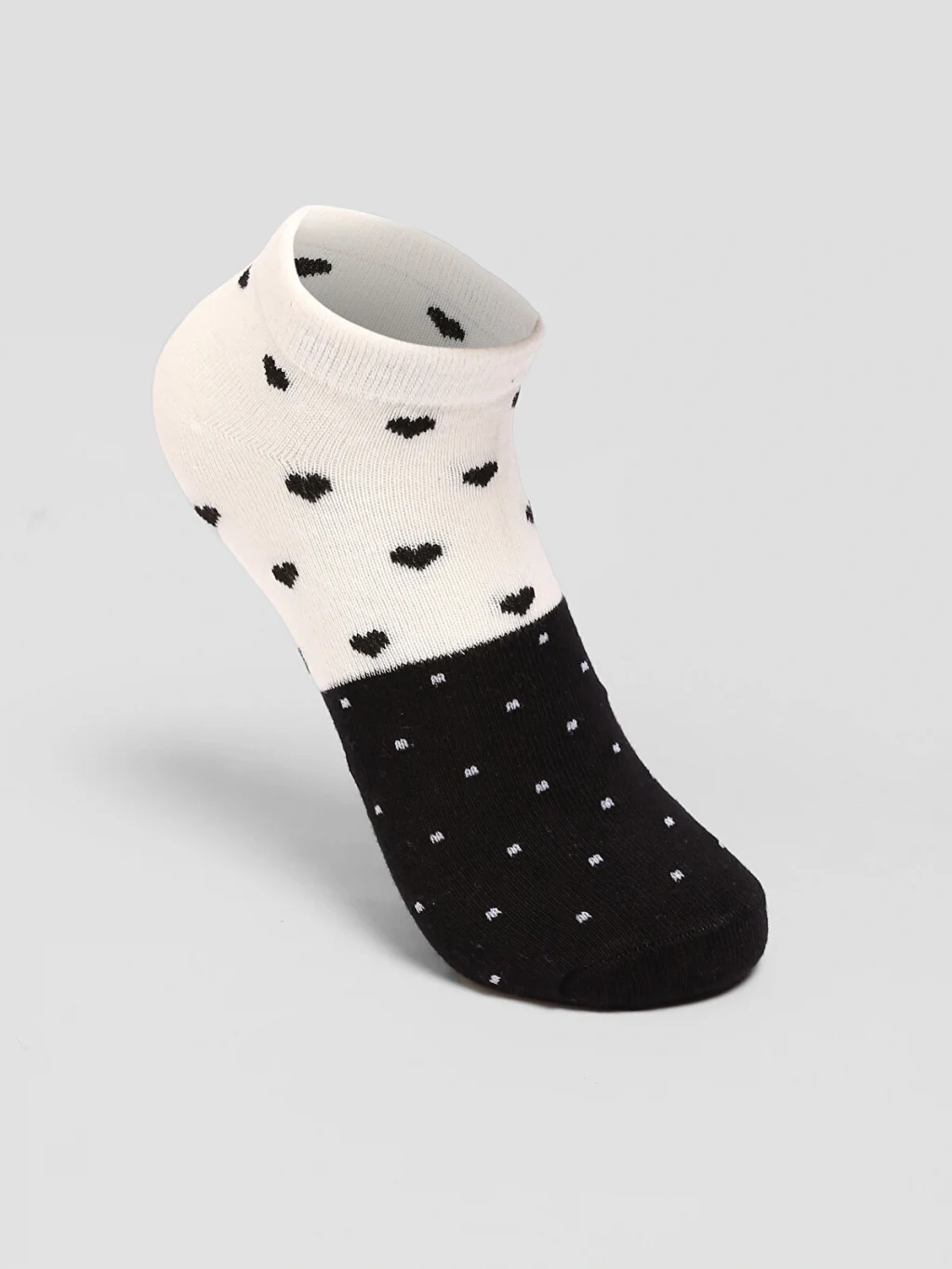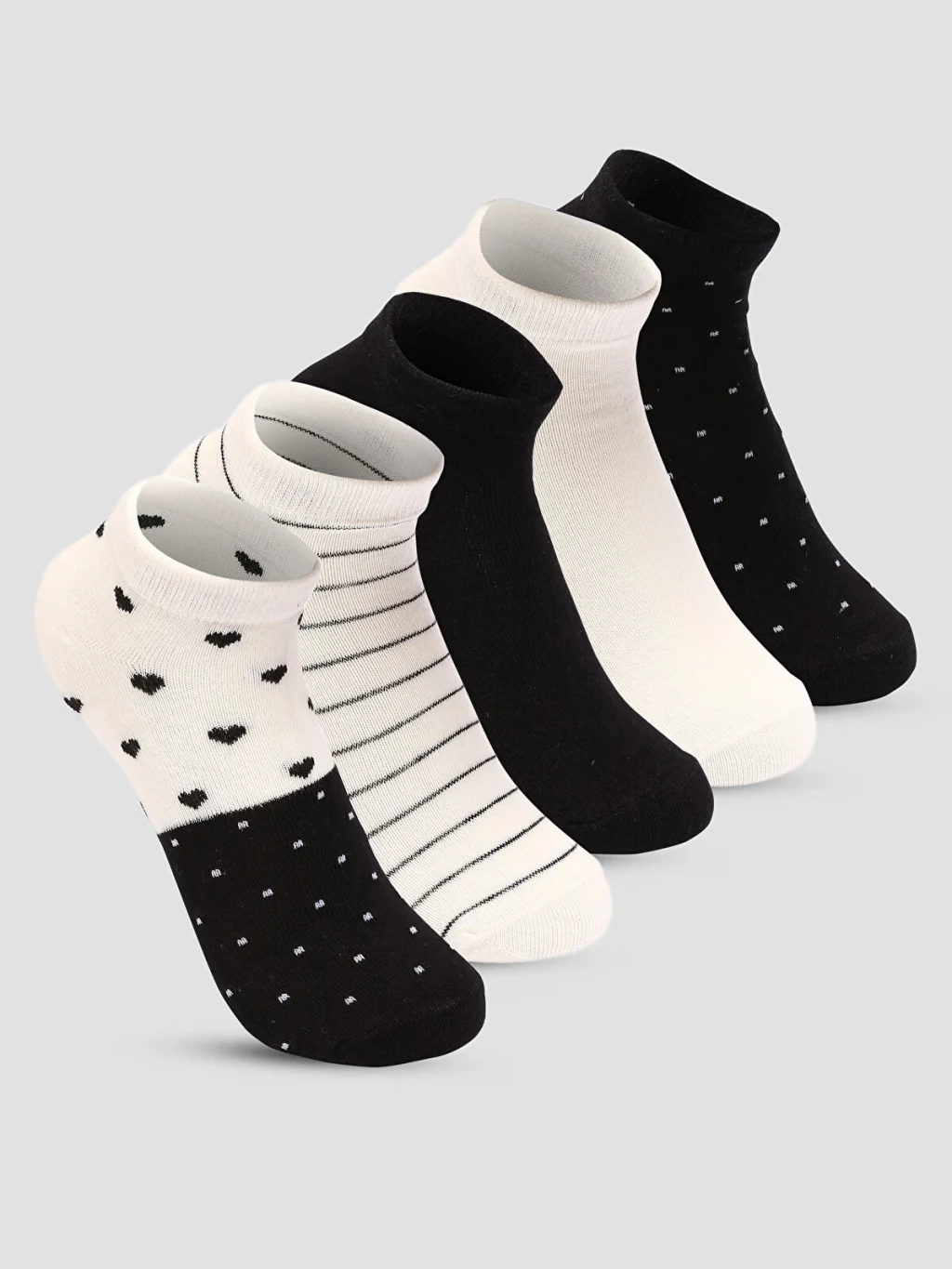 Pamuk karışımlı elyaftan üretilen patik çoraplar, yumuşak ve konforlu bir dokuya sahiptir. Desenli tasarımıyla şık bir görünüm sunar ve 5 çift patik çoraptan oluşmaktadır.