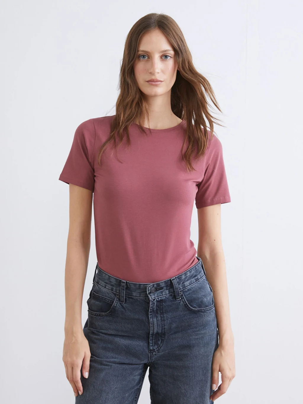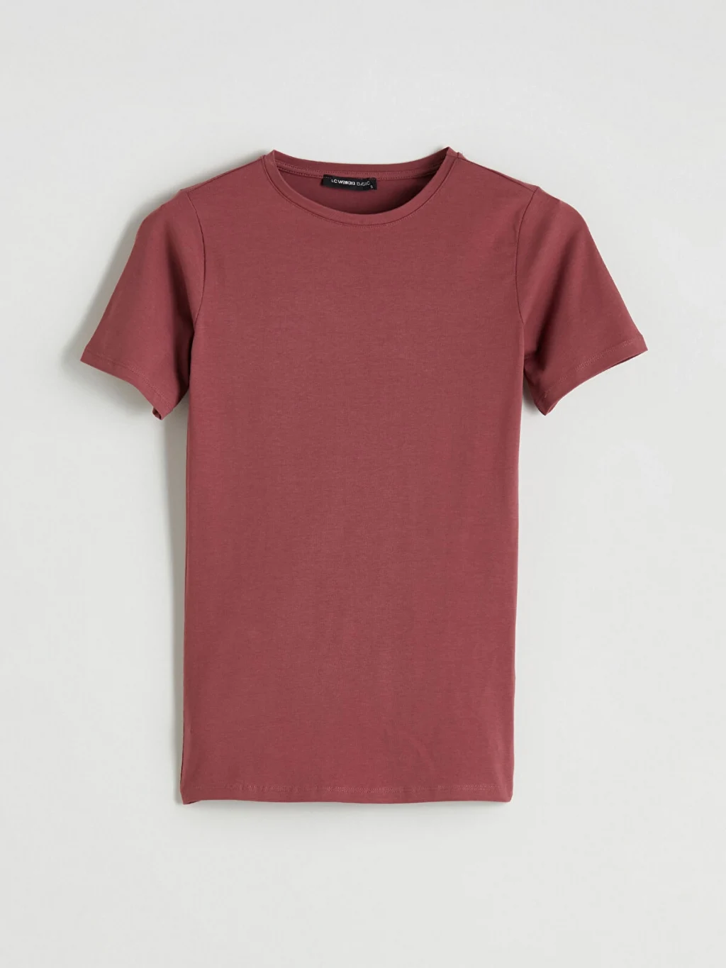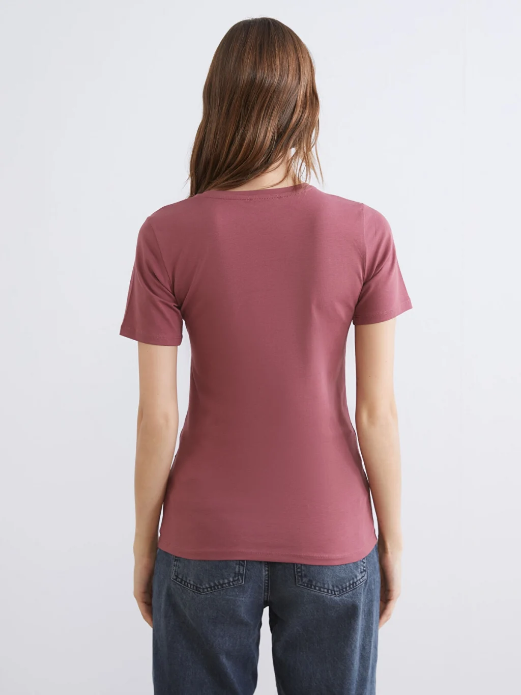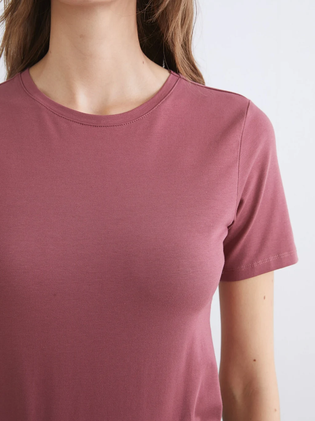 Penye kumaştan üretilen dar kalıplı kadın tişört, bisiklet yaka ve kısa kollu bir tasarıma sahiptir.
