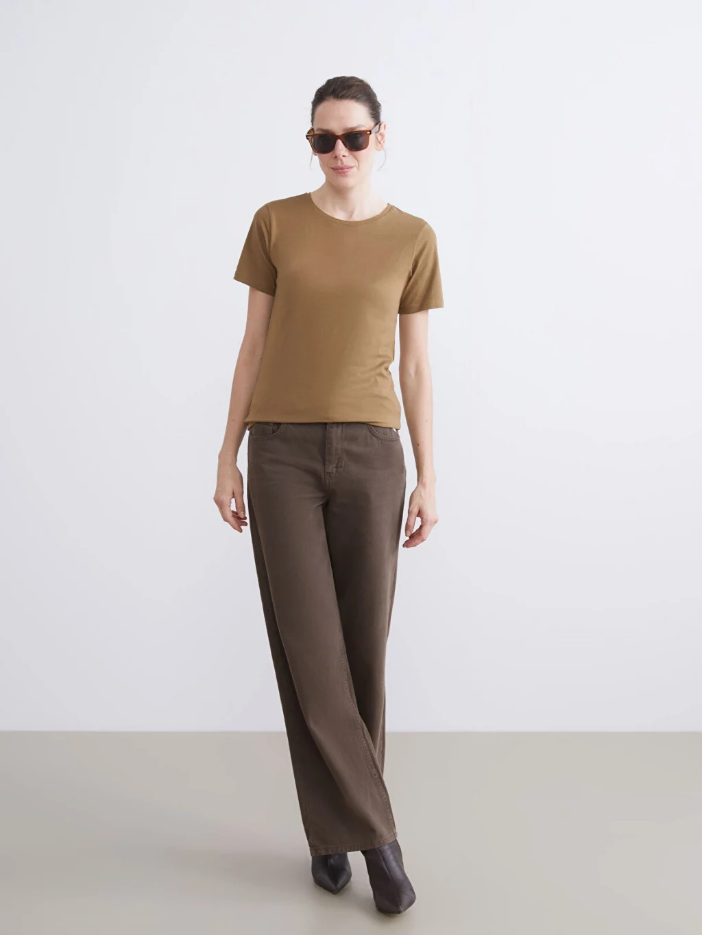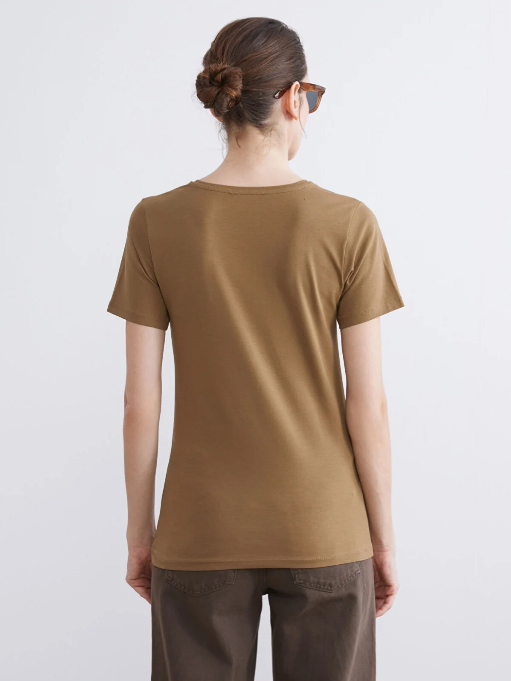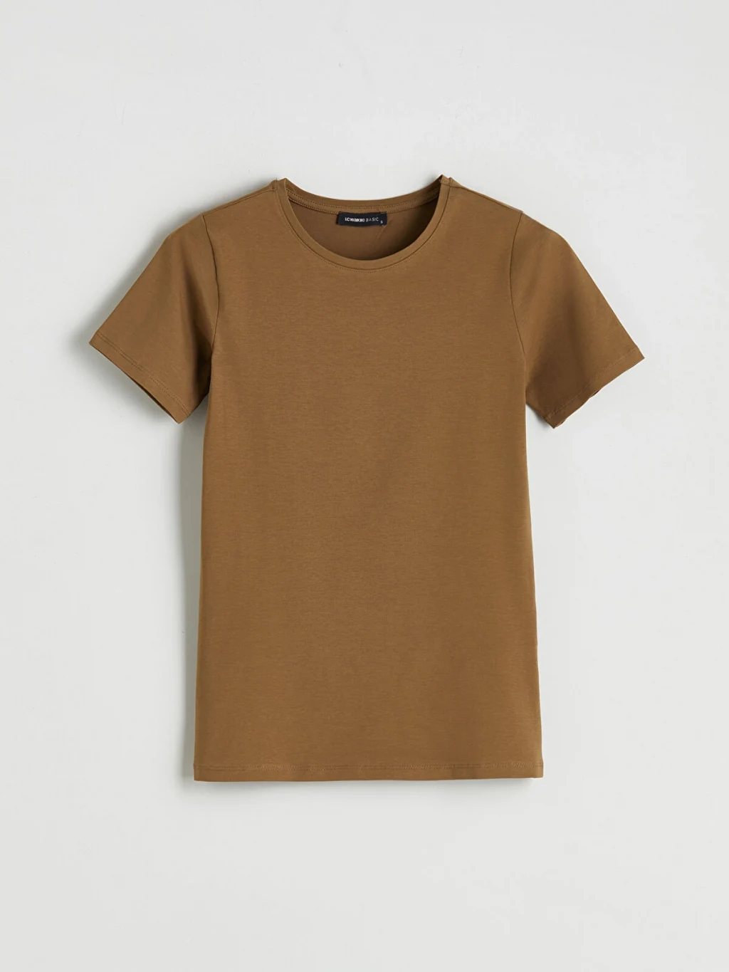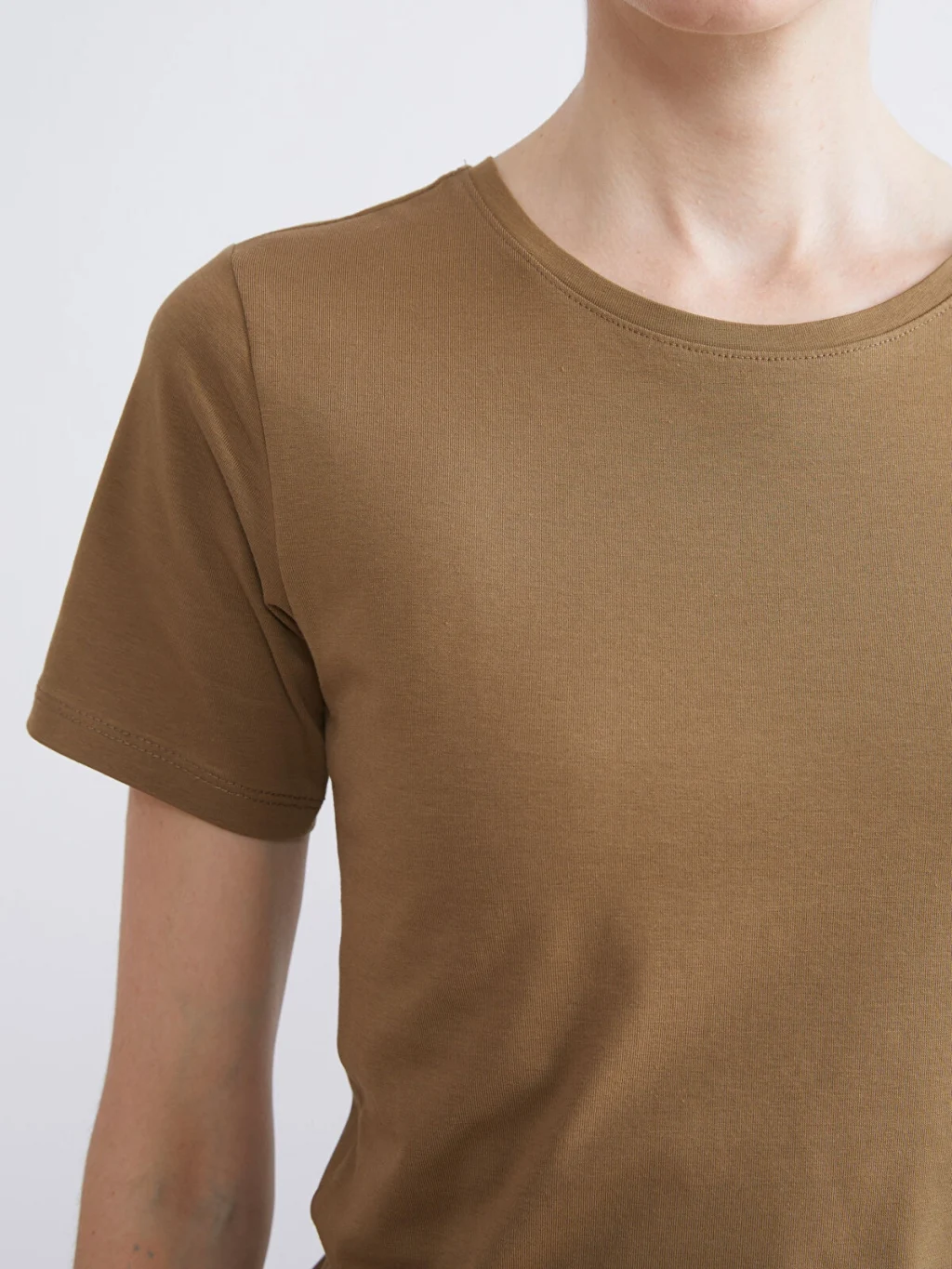 Penye kumaştan üretilen dar kalıplı kadın tişört, bisiklet yaka ve kısa kollu bir tasarıma sahiptir.
