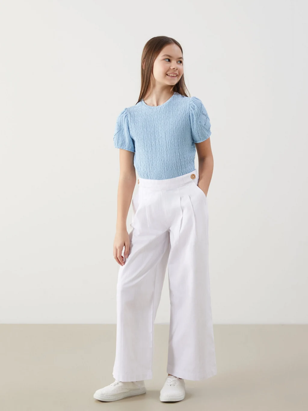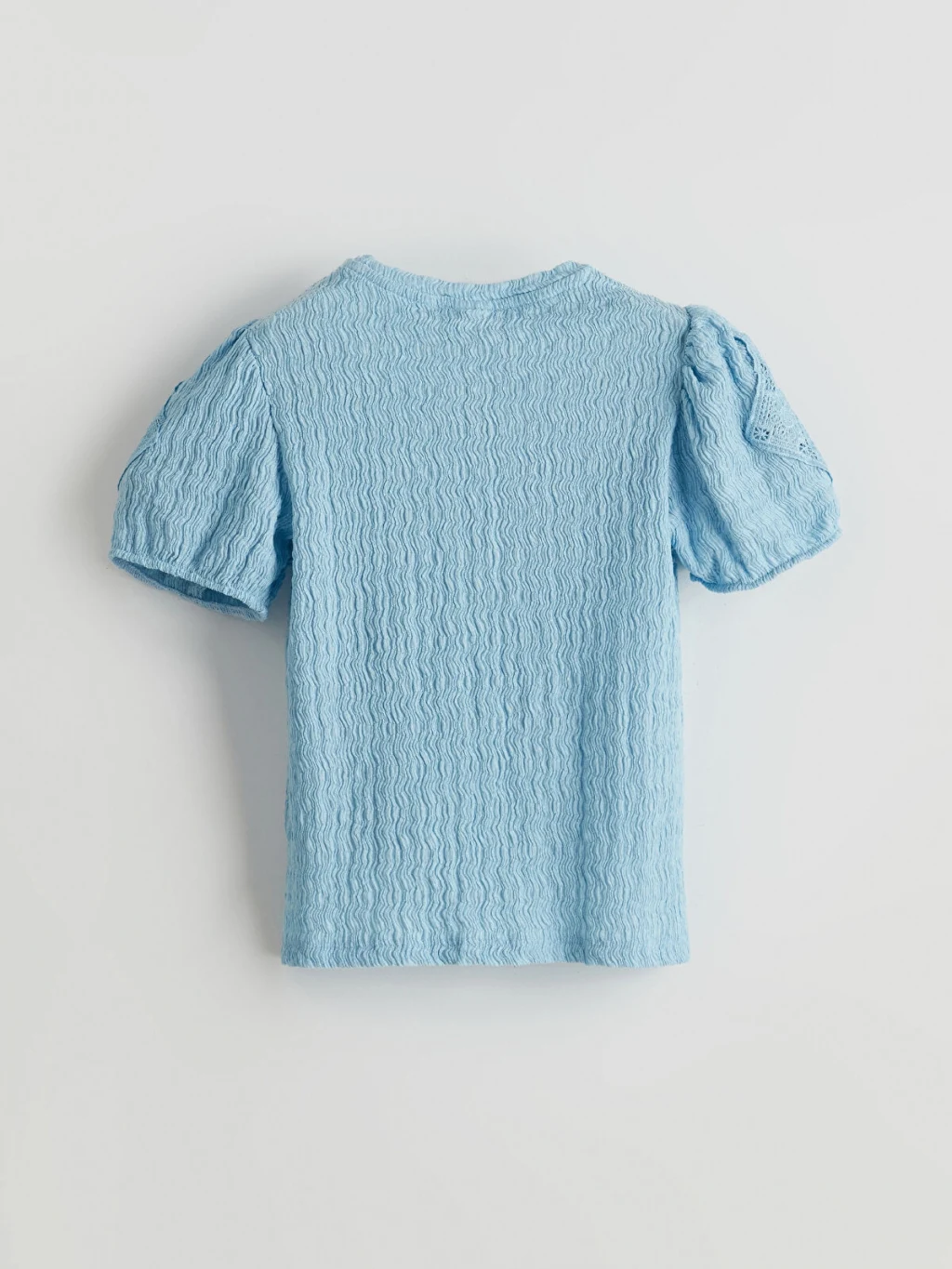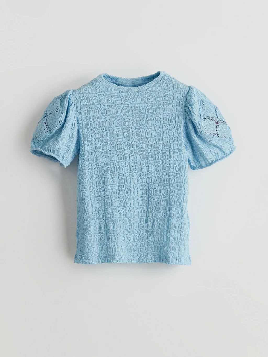 Standart kalıp kız çocuk tişört, bisiklet yakalıdır. Gofre kumaştan üretilmiştir ve ajurlu detaylı, kısa balon kollara sahiptir.