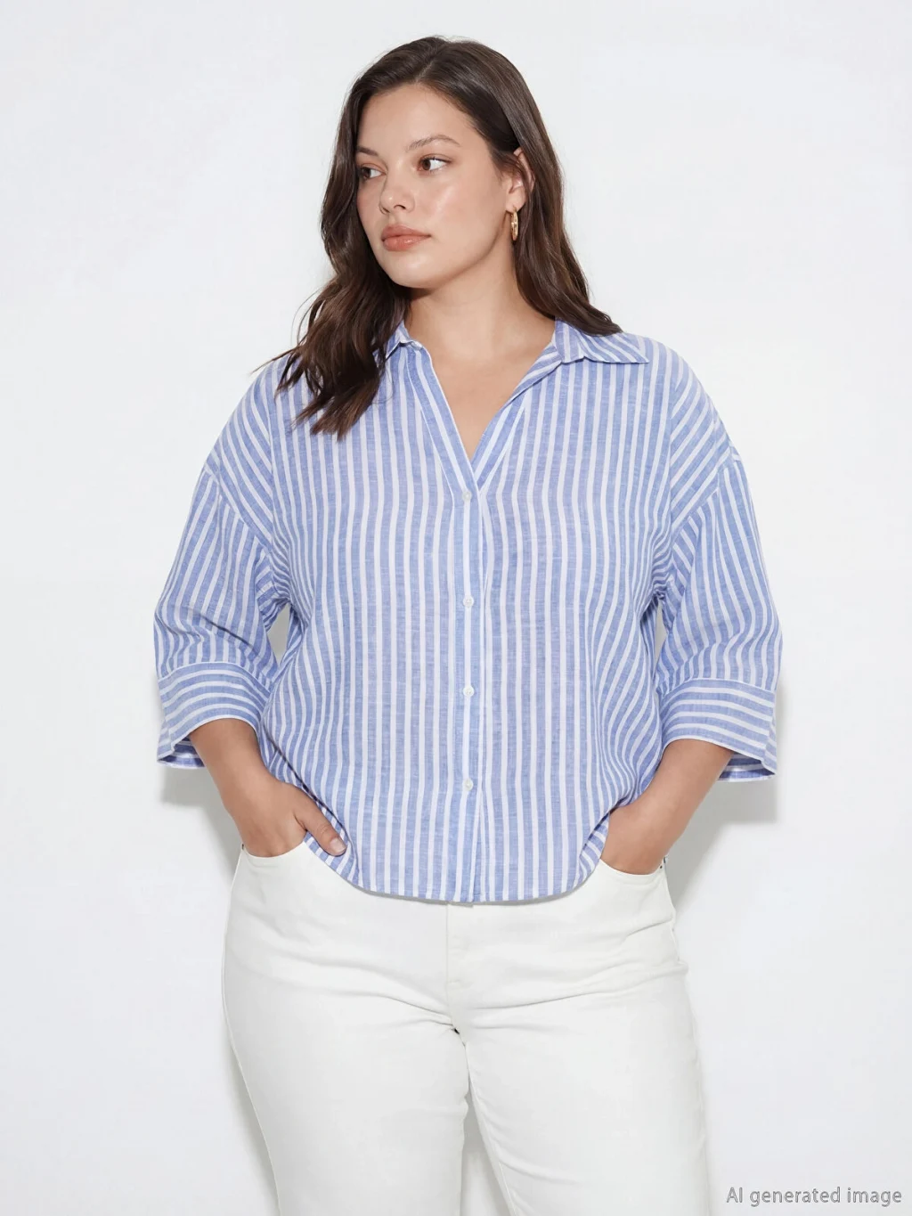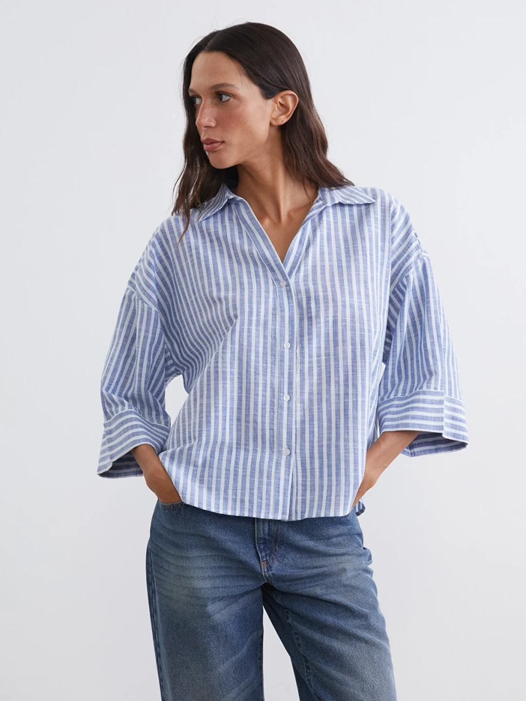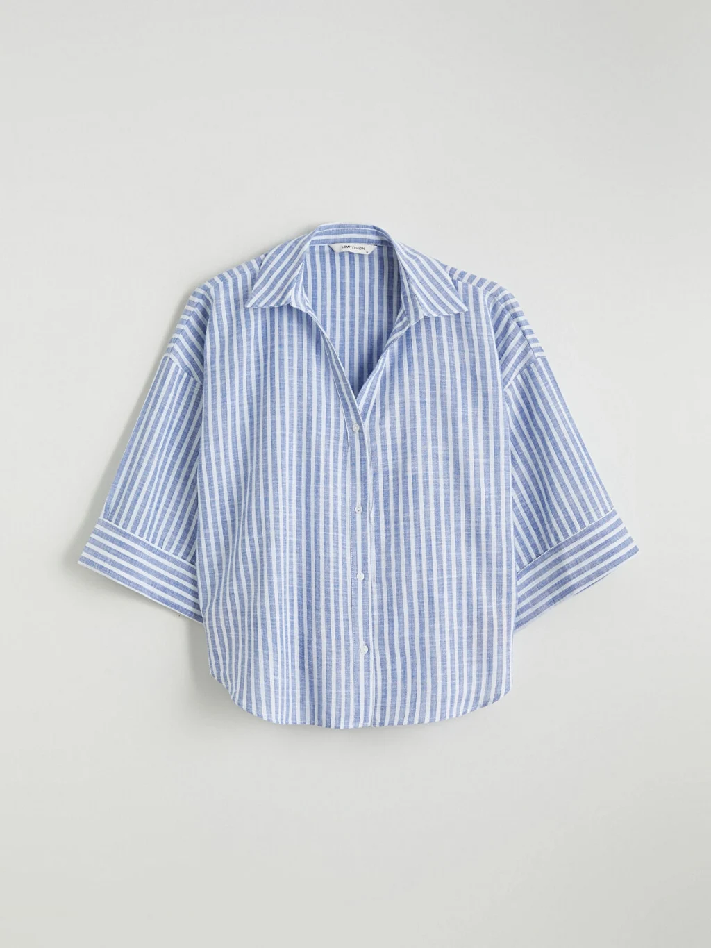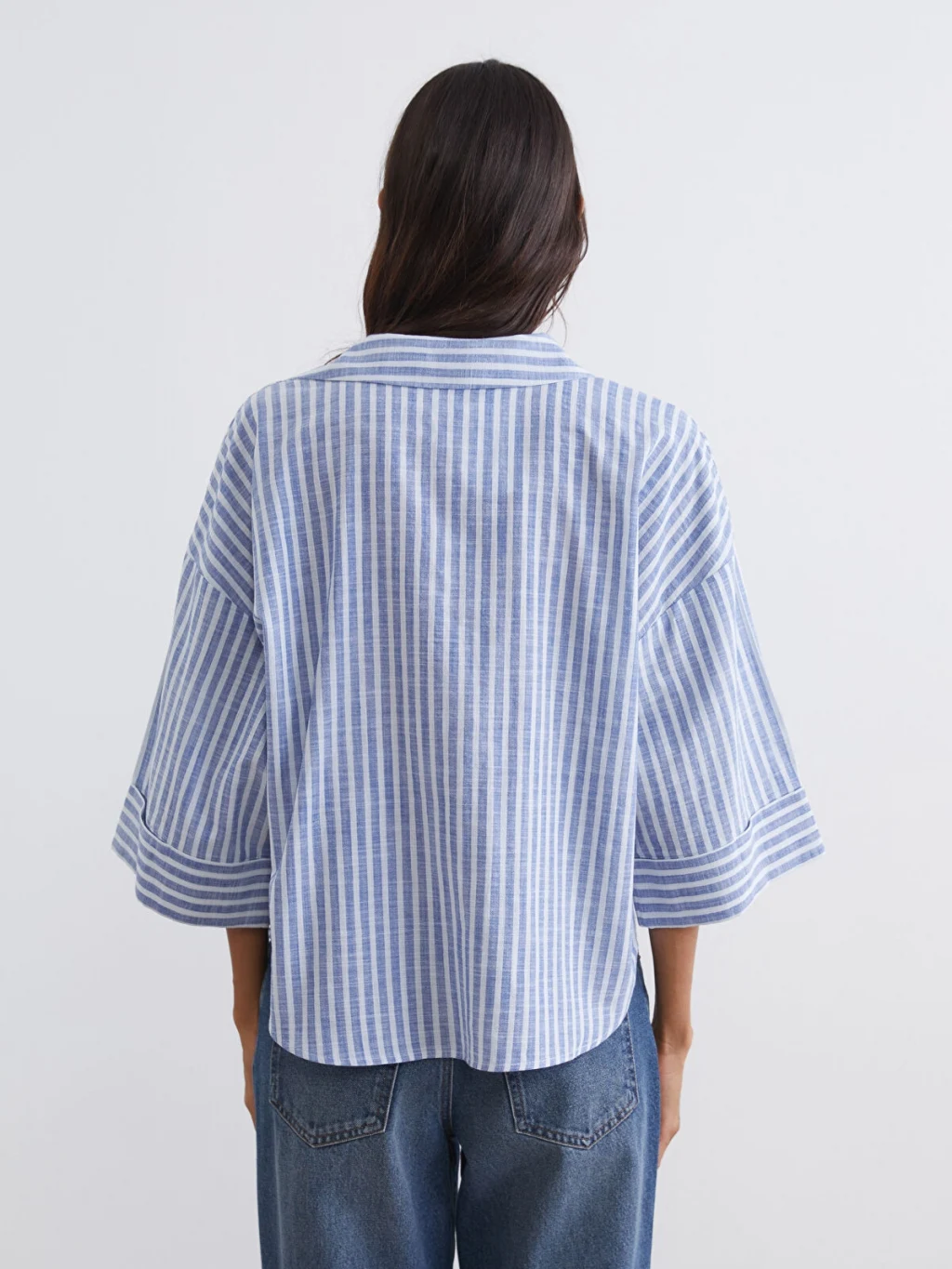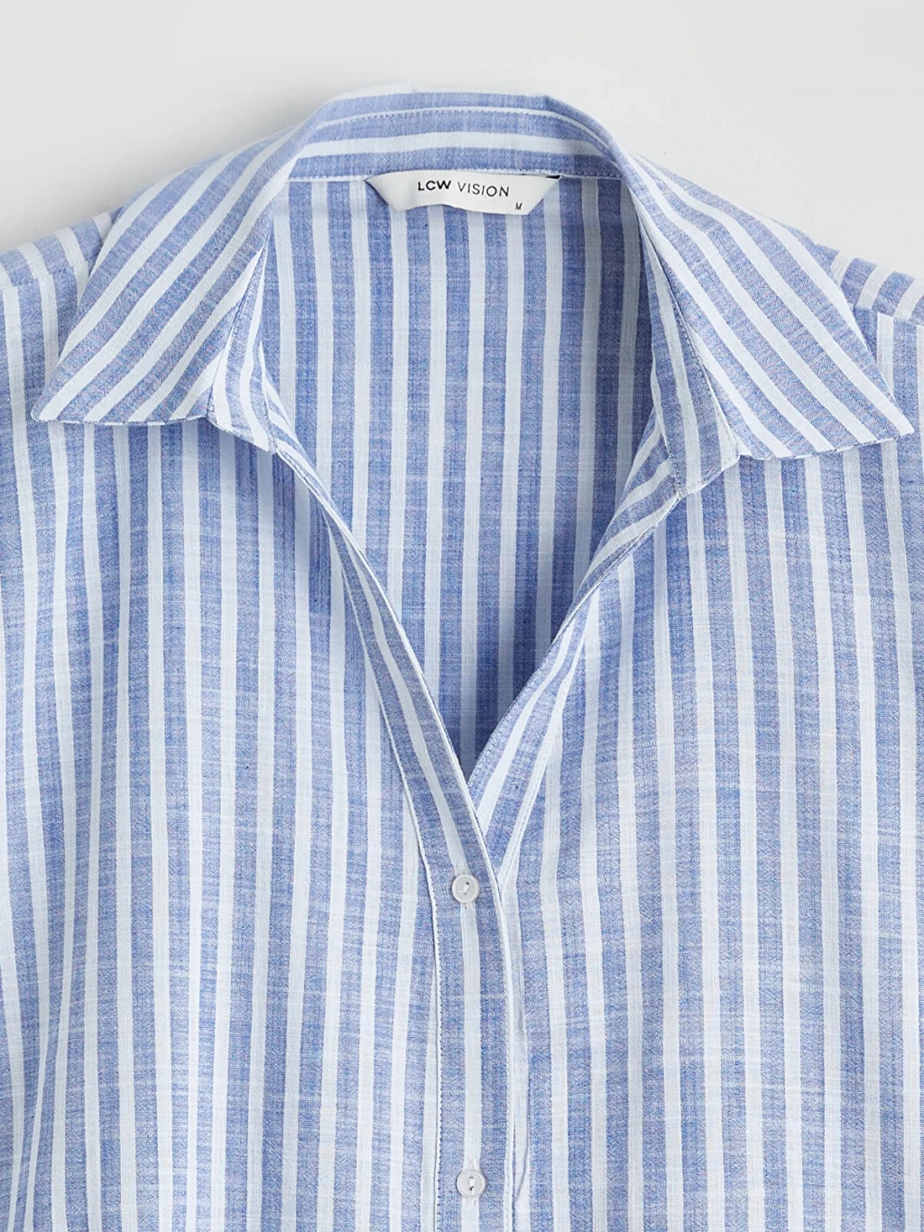 Çizgili desenli kadın gömlek, gömlek yakalı ve kısa kolludur. Önü düğme kapamalıdır ve etek ucu oval kesimdir.