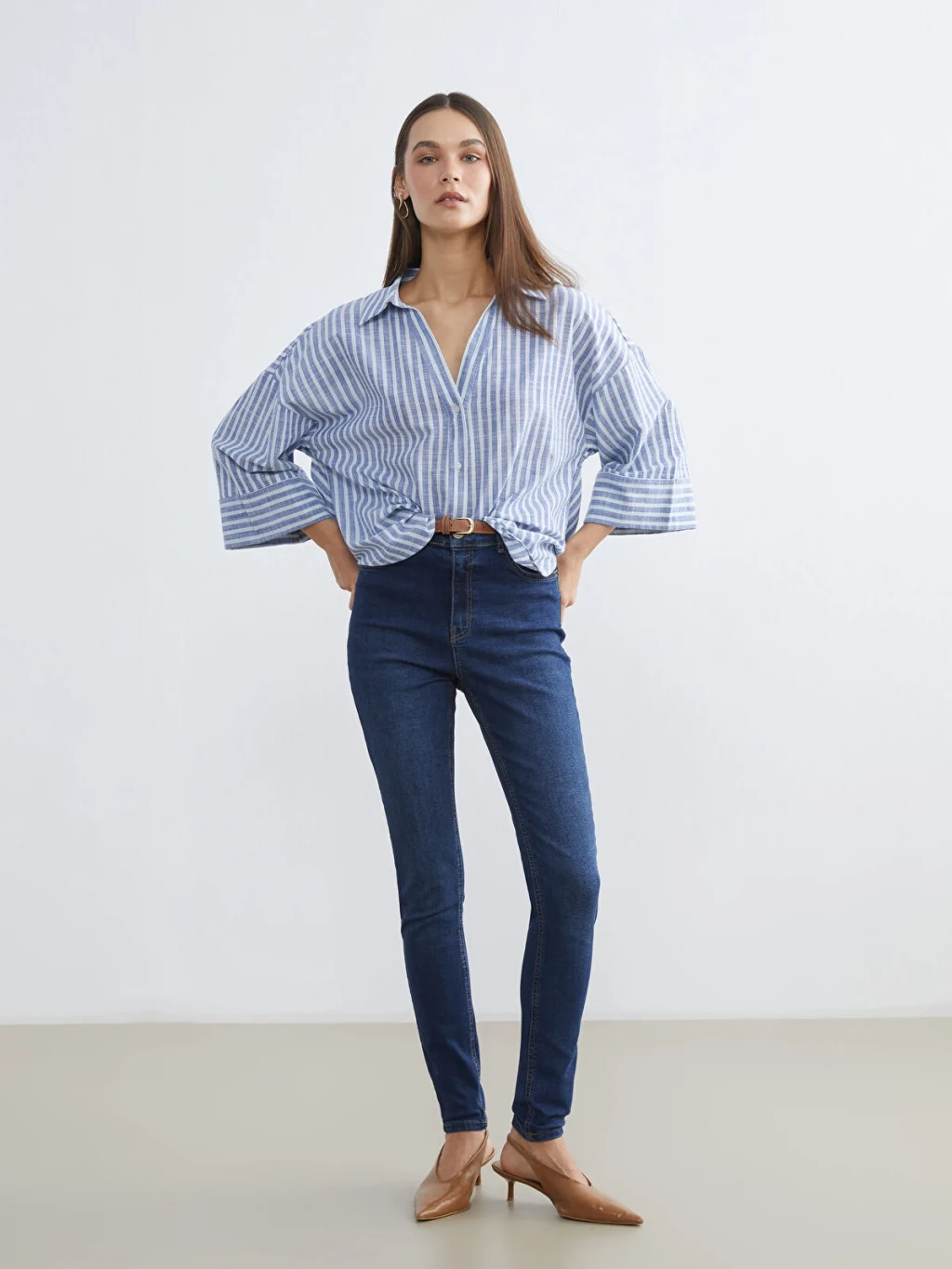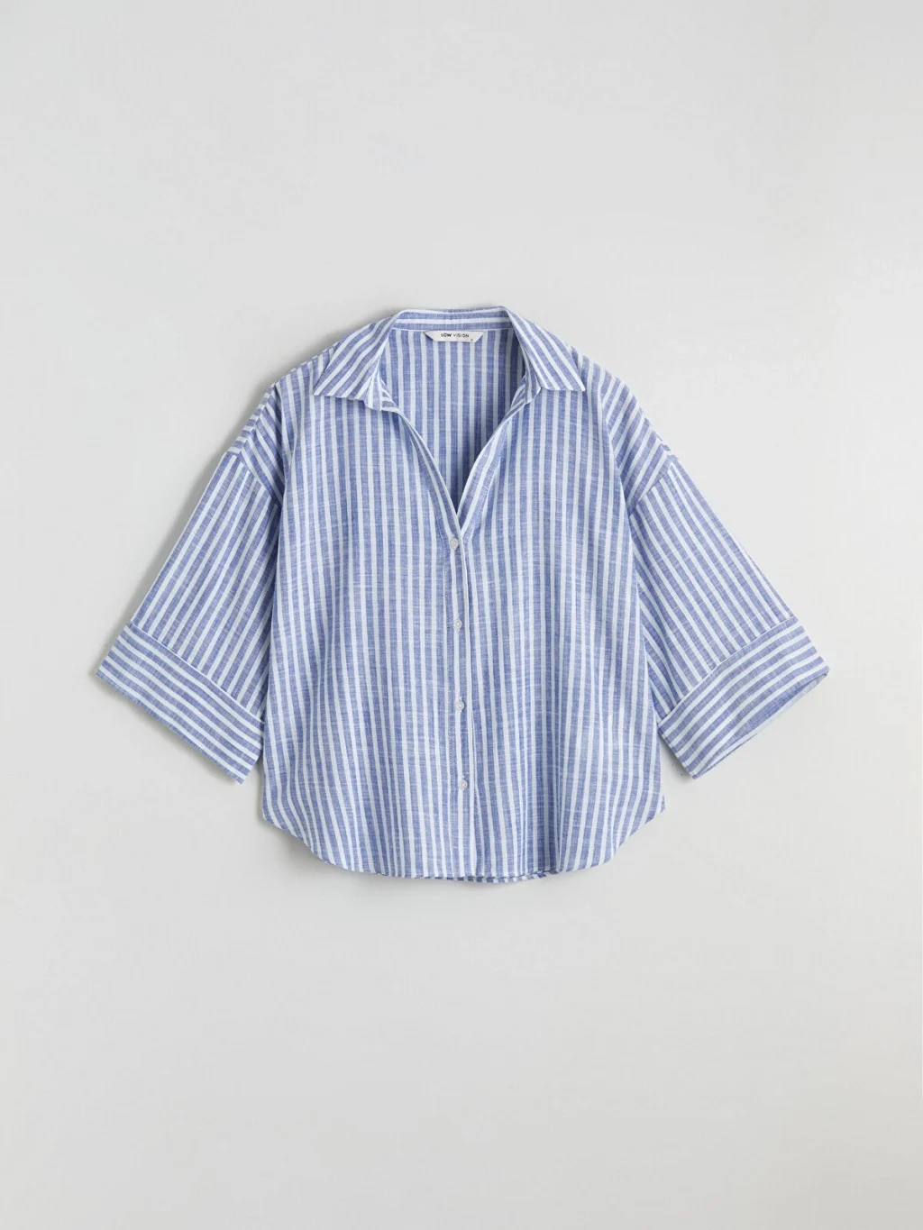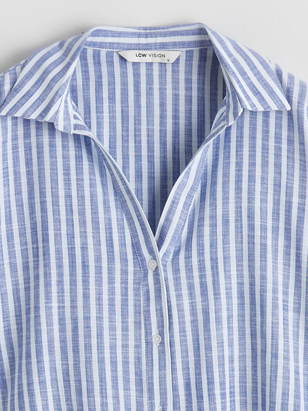 Çizgili desenli ve önden düğme kapamalı kadın gömlek, %100 pamuklu kumaştan üretilmiştir.