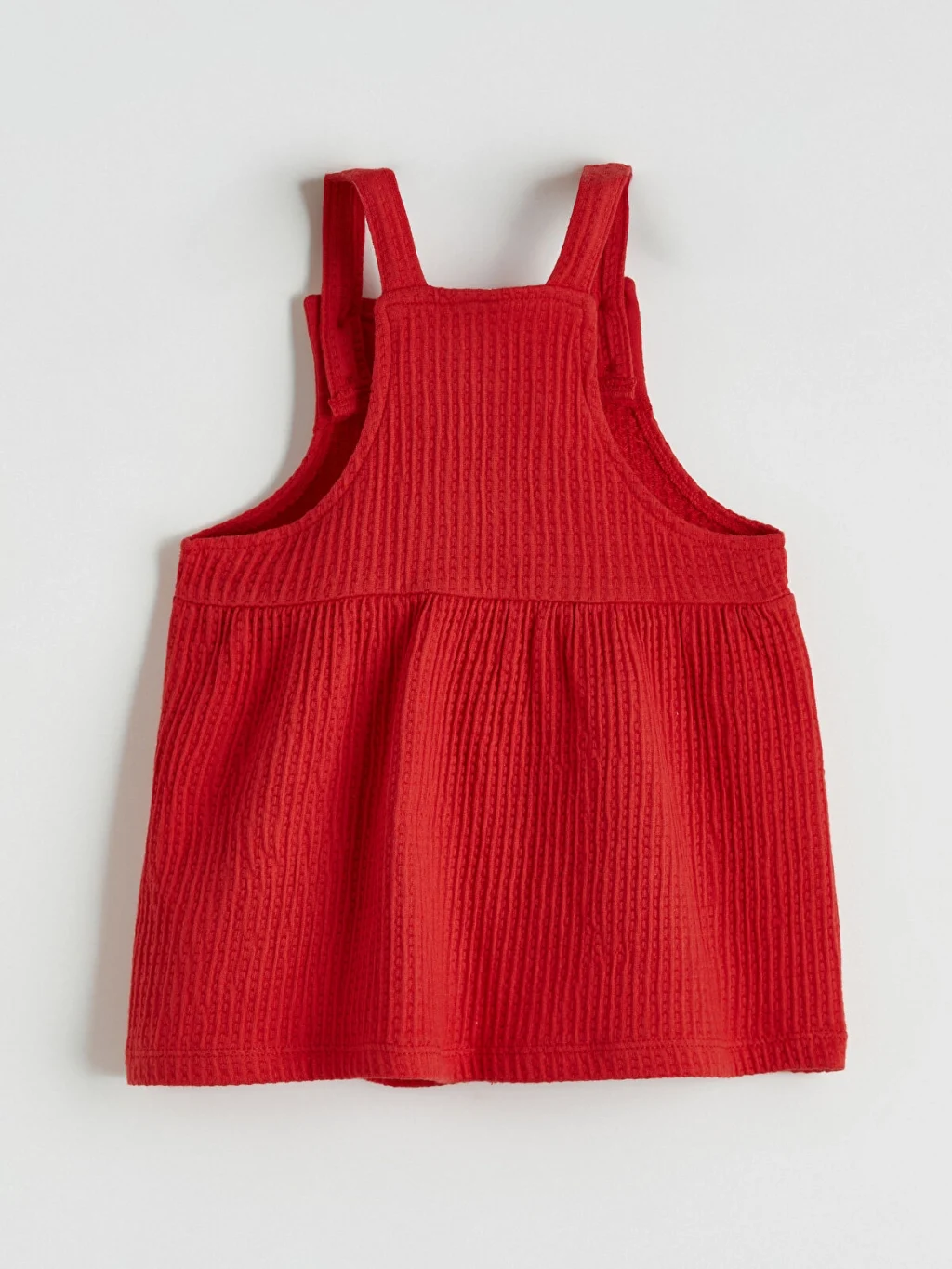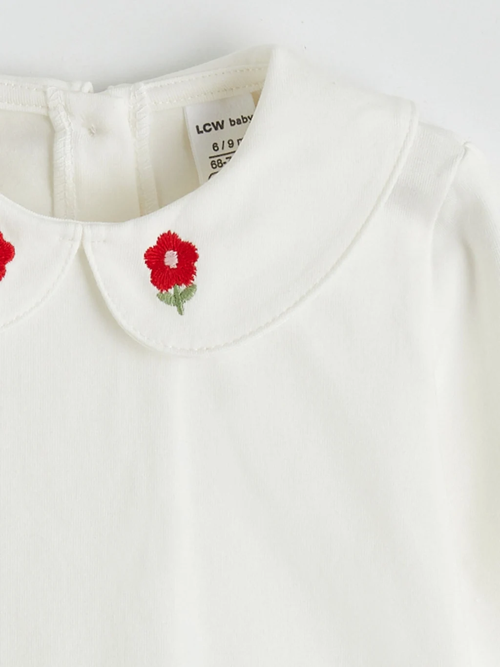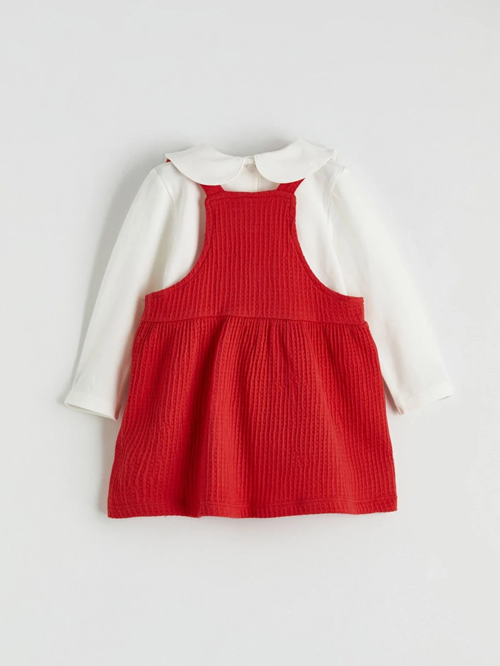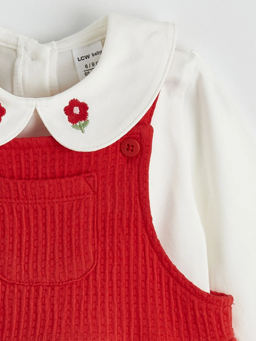 Bebe yakalı ve uzun kollu penye üst ile askılı elbiseden oluşan kız bebek takımı. Yaka kısmında nakış detayı bulunur.