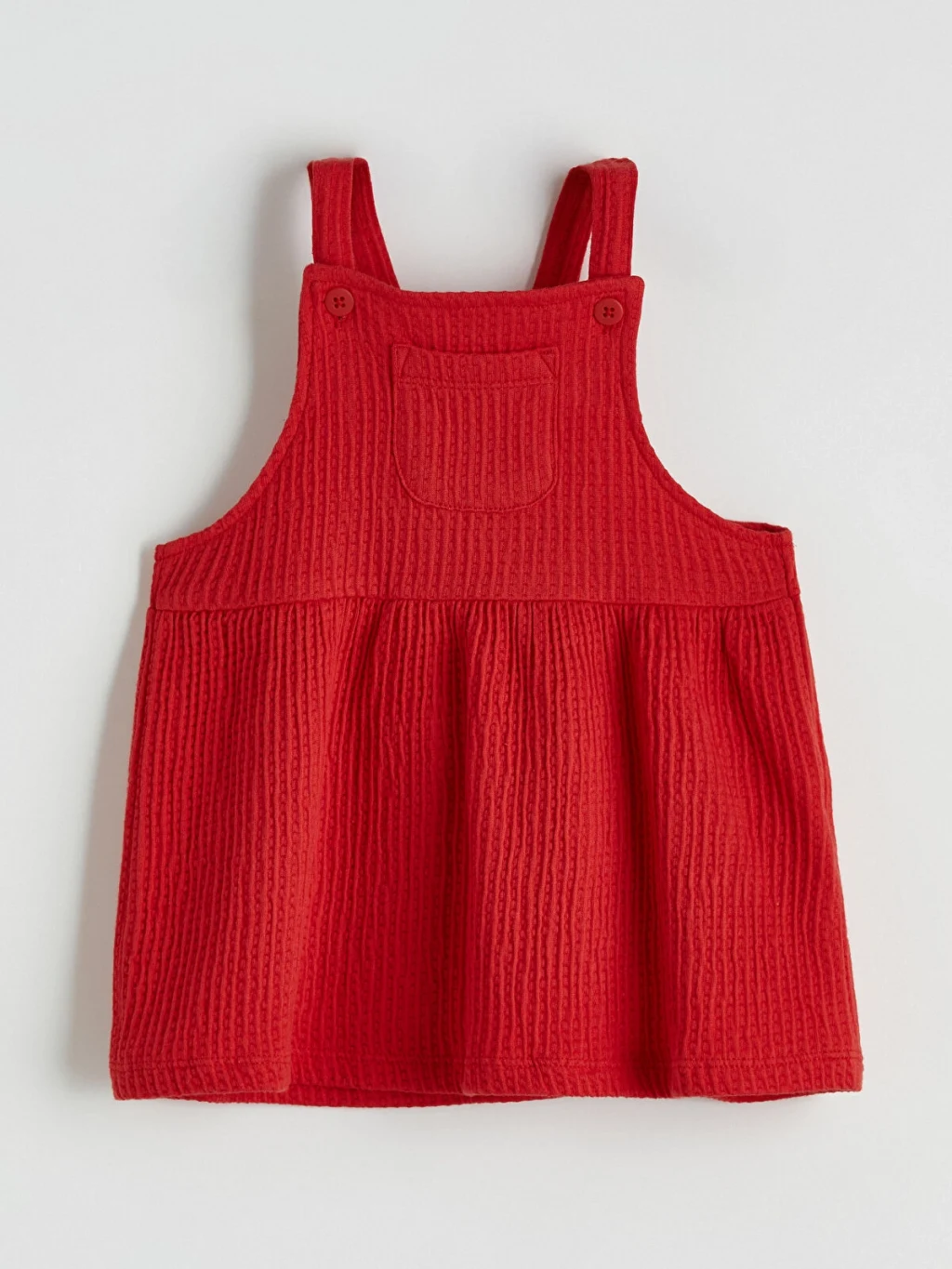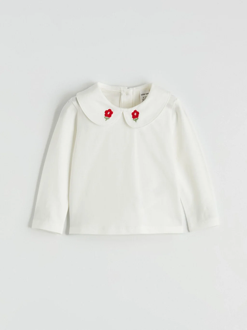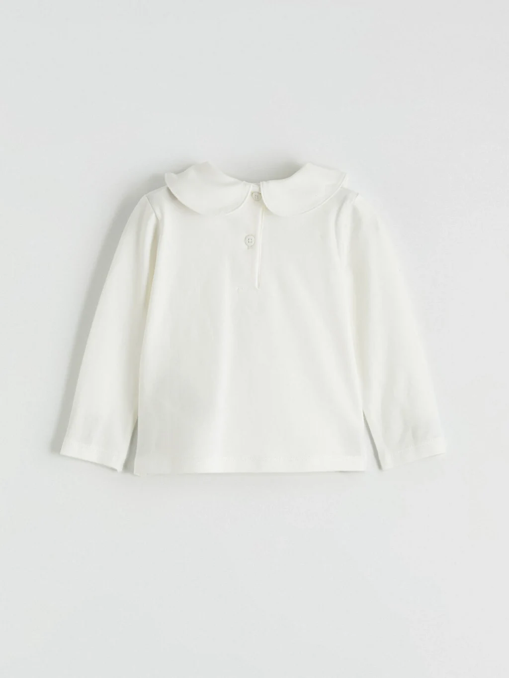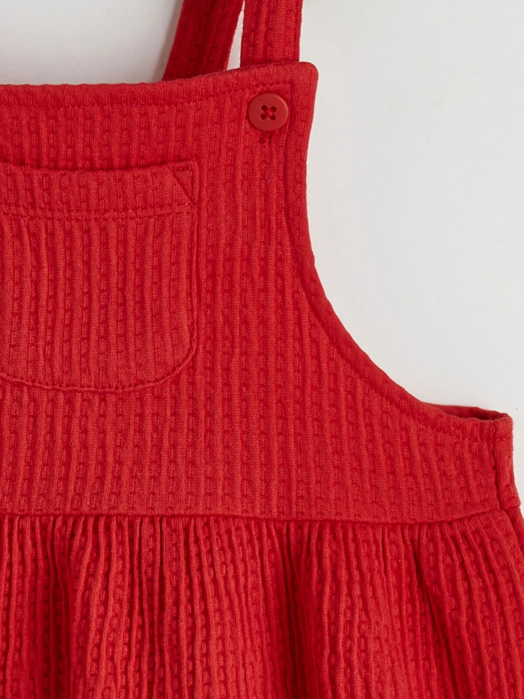 Bebe yakalı ve uzun kollu penye üst ile askılı elbiseden oluşan kız bebek takımı. Yaka kısmında nakış detayı bulunur.