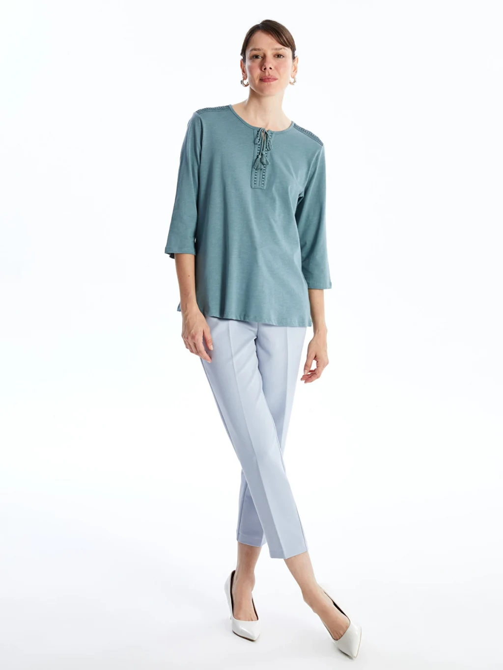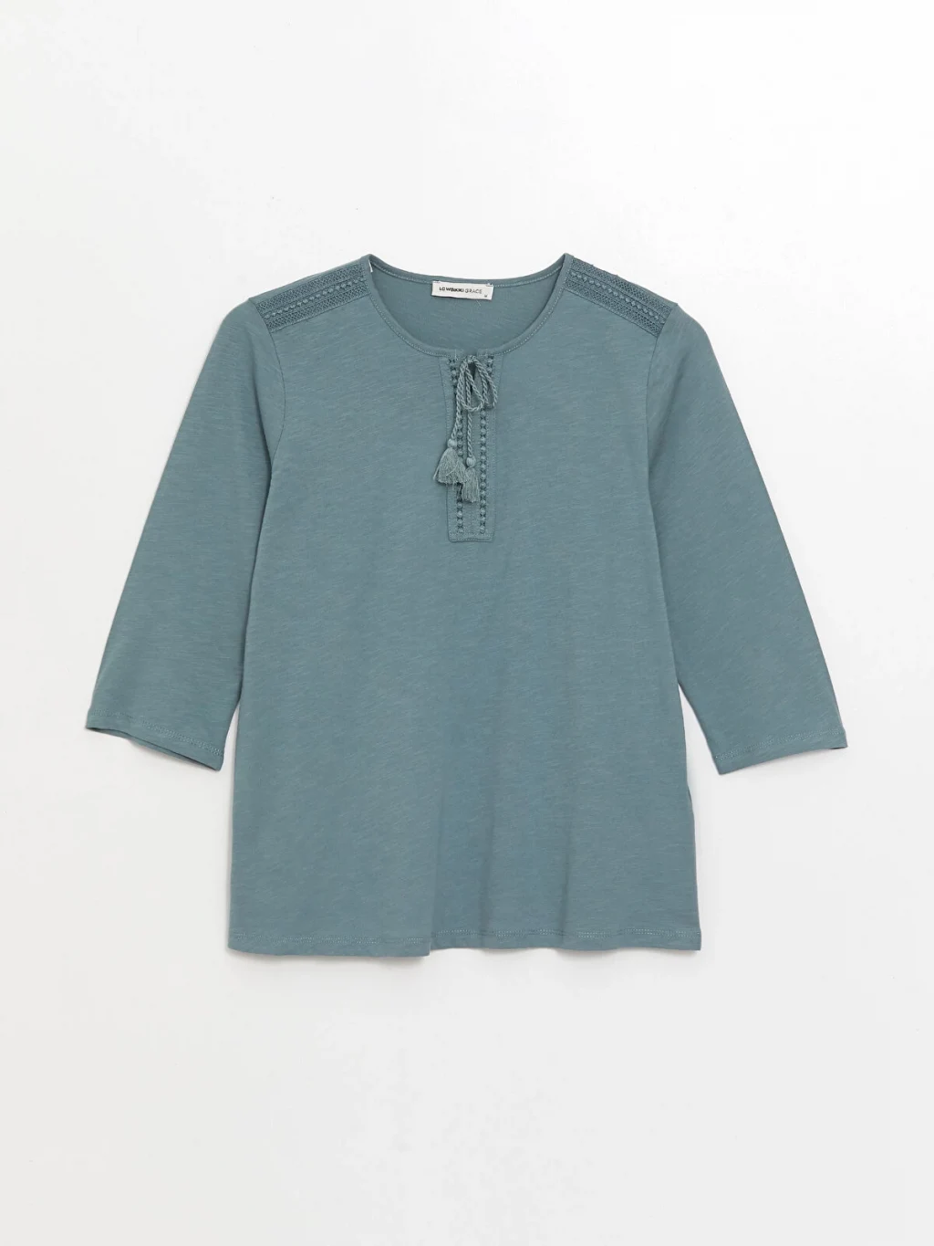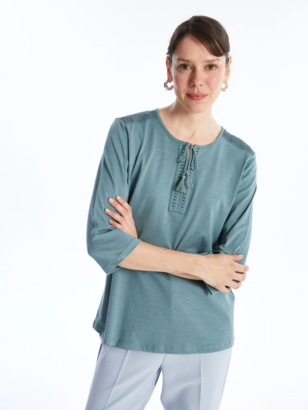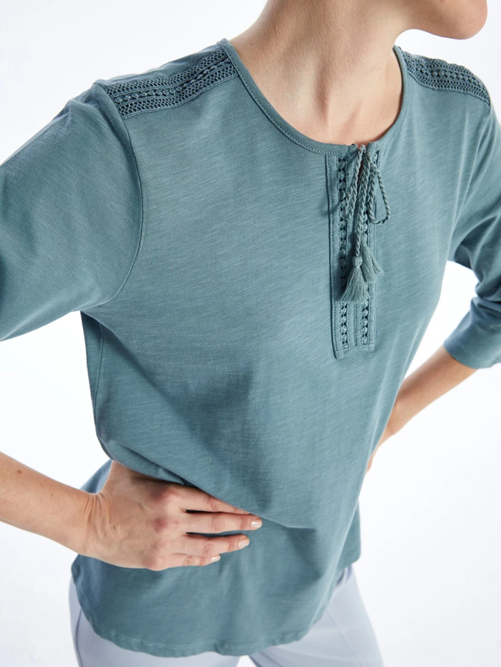 Bağlamalı yaka nakışlı kadın bluz, yumuşak penye kumaştan üretilmiştir, bu sayede gün boyu rahatlık ve nefes alabilirlik sunar. Zarif nakış detayları, bluza sofistike bir dokunuş ekler ve görsel bir çekicilik katar.