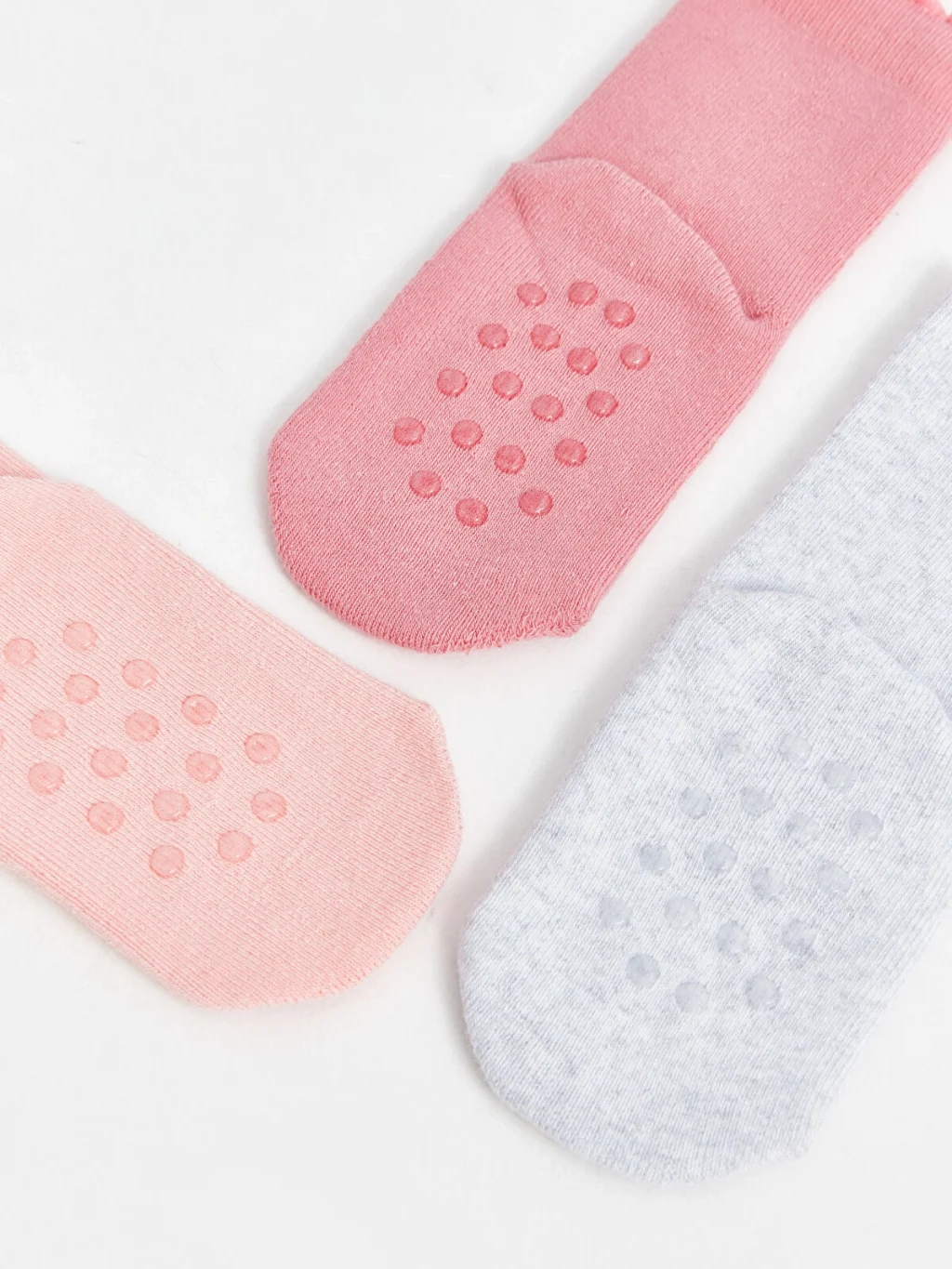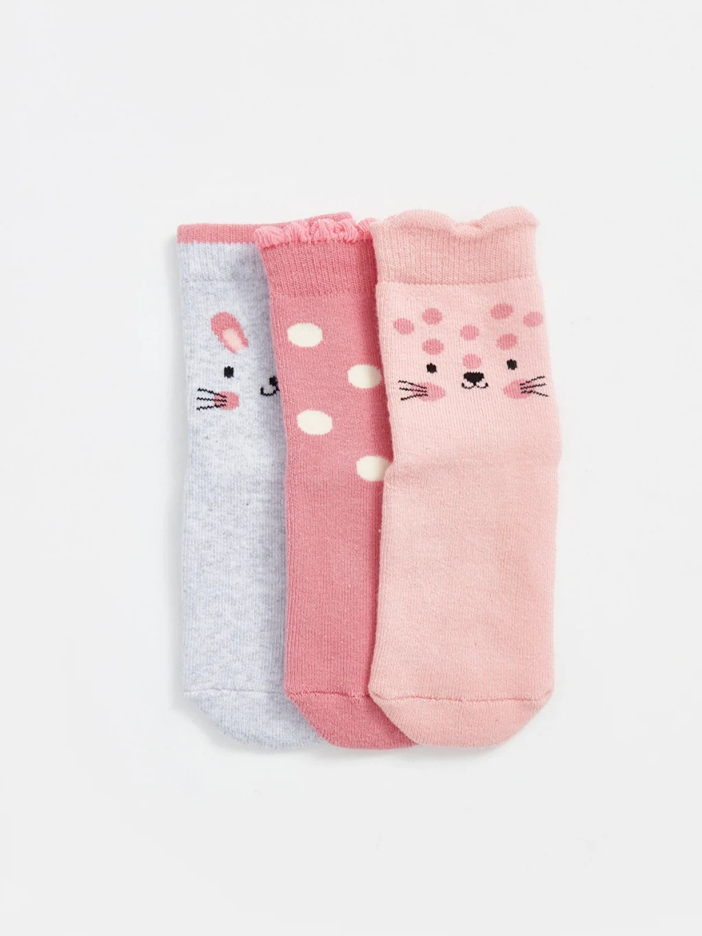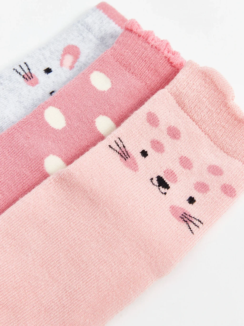 Kız bebek için üç çift soket çorap; puantiyeli ve hayvan figürlü desenlere, fırfırlı ve figür detaylı bilek kısımlarına sahiptir.