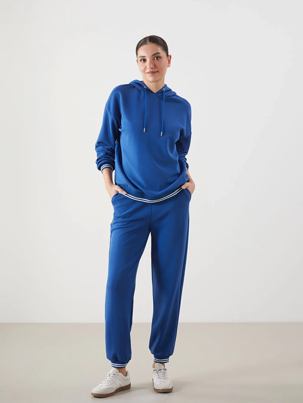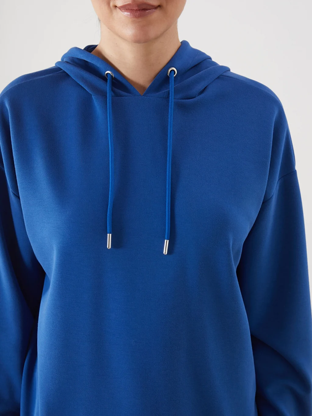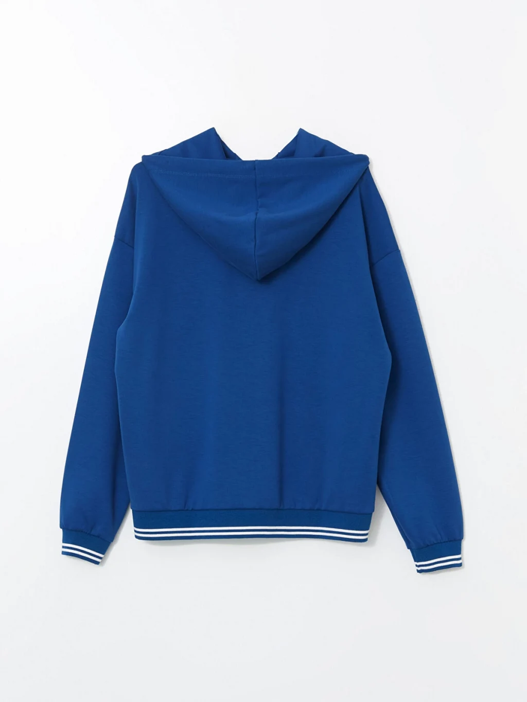 Dalgıç kumaştan üretilmiş, kapüşonu bağcıklı, uzun kollu kadın hoodie. Etek ucu ve manşetleri çizgili ribanalıdır.